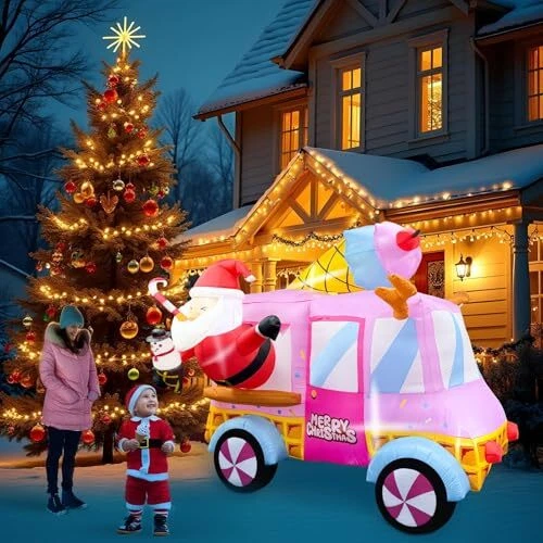 30 Days Return Policy Fast Delivery Trusted seller 8FT Santa Ice Cream Truck Inflatable, Cute Christmas Inflatable Outdoor Decoration Santa Claus Blow Up Snowman Cone in Giant Pink Van with Built-in LEDs & Blower for Yard Xmas Party Decor Product Description 【8FT Christmas Santa Truck Inflatable】The christmas inflatable outdoor decoration features an adorable pink ice cream van with antlers, a happy santa claus holding a snowman ice cream, a perfect addition to your winter wonderland display! What's more, the blower, adapter, ground stakes and fastened ropes that everything needed for setup are all included in the package. 【Outdoor Lighted Christmas Decorations】Adorned with 7 LED lights, when darkness falls, this christmas truck inflatable will light up your front yard, creating a warm and inviting glow that's sure to delight all passersby, making this a delightful addition to your outdoor Christmas decor. Your kids and friends will love this joyful addition to your blow up Christmas decorations. 【Weather Resistant Christmas Yard Inflatables】Made of 210T polyester, this outdoor inflatable christmas decorations is not only waterproof, but also soft, durable, and wear-resistant, rest assured that it's built to withstand years of use. With the added sandbags, fastened ropes and ground stakes, this santa claus inflatable can confidently face any wind or snow challenge or any other weather conditions that may come its way. 【Easy Installation with Self-Inflation】Setting up this ice cream snowman outdoor Christmas decorations is a breeze. It features a built-in blower that self-inflates blow up santa in seconds. Simply plug in and watch as it pops up magically before your eyes. The lightweight materials and user-friendly design make it a snap for anyone to set up in their yard. And when the celebration is over, taking it down is just as easy. 【Perfect Outdoor Santa Claus Decorations】Transform your yard into a winter wonderland with this delightful 8 ft christmas inflatable outdoor decoration. Perfect for decorating your house, lawn, yard or patio with this Christmas inflatables snowman. The beautiful design of the Christmas outdoor decorations is sure to bring a smile to the faces of all who see it. Shipping Returns Payment Shipping Shipping is FREE to all addresses other than APO/PO boxes in the lower 48 states. All our stock ships from US-based warehouses. Shipped via USPS or UPS (depending on location and package weight) Unless stated otherwise, all orders will ship within 24-72 hours of your payment being processed. Check our feedback to see the great reviews of FAST shipping we offer. Returns As our valued customer, we will do our best to make sure the product you receive arrives to you on time and as expected. If you are not satisfied with your purchase, please contact us within 30 days of receiving your order to process a return. Payment We currently accept payment via eBay managed payments only. Once payment is cleared, we will dispatch your shipment within 1-3 business days. Please refer to the "Shipping" tab for more information regarding shipping speed to your destination.