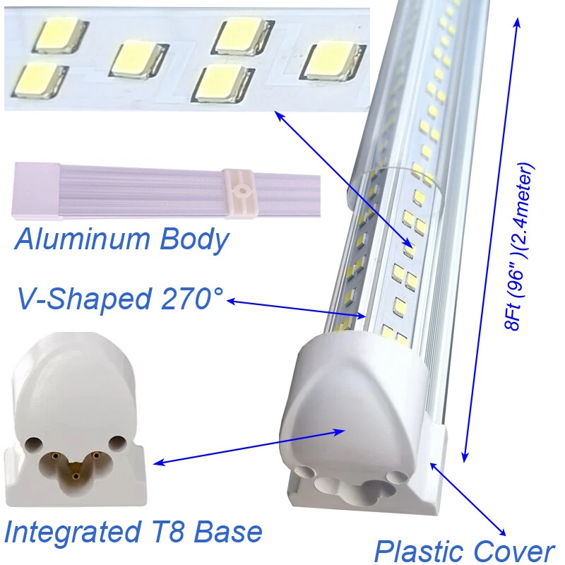 FAST DELIVERY - Ship from New Jersey or Los Angeles Warehouse via FedEx , 3-7 Days Delivered Your Door . SCIENTIFIC DESIGN - 8Ft LED Shop Lights Fixture is Made of 6500K Cold White SMD2835 LED Chip ,Plastic Clear Cover , Aluminum Bracket Housing ,and AC85-277V Constant Current Driver . It can work in -68F to 120F Temperature Conditions EASY INSTALLATION - The Integrated Tube Fixture Can be Install on Wall or Ceiling ,Easily Replace Traditional Fluorescent Tube Bulb . Plug and Play , Free Accessories (Power Cords, Connector , Extension Cords , Clip and Screw ) Come with Tube Lights Together WIDE APPLICATION - Linkable 8Ft Bulbs Widely Used in Garage Ceiling , Barbershop , Schools, Hospitals Basement , Factory Warehouses , Supermarkets Cooler Door , Offices, Shops,Hotels, etc 8Ft LED SHOP LIGHT V-SHAPE 144W 6500K LED Tube Light Linkable Ceiling 12Pc FAST DELIVERY - Ship from New Jersey or Los Angeles Warehouse via FedEx , 3-7 Days Delivered Your Door . SCIENTIFIC DESIGN - 8Ft LED Shop Lights Fixture is Made of 6500K Cold White SMD2835 LED Chip ,Plastic Clear Cover , Aluminum Bracket Housing ,and AC85-277V Constant Current Driver . It can work in -68F to 120F Temperature Conditions EASY INSTALLATION - The Integrated Tube Fixture Can be Install on Wall or Ceiling ,Easily Replace Traditional Fluorescent Tube Bulb . Plug and Play , Free Accessories (Power Cords, Connector , Extension Cords , Clip and Screw ) Come with Tube Lights Together WIDE APPLICATION - Linkable 8Ft Bulbs Widely Used in Garage Ceiling , Barbershop , Schools, Hospitals Basement , Factory Warehouses , Supermarkets Cooler Door , Offices, Shops,Hotels, etc