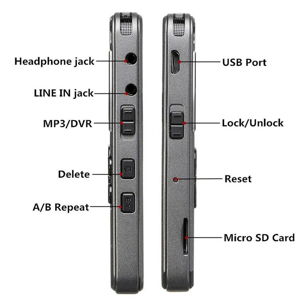 Product Description 8GB Voice Record Mini Digital Sound Audio Recorder Dictaphone MP3 Player Features: 100% brand new and high-quality made. 128x64 pixels LCD screen to display working status and battery capacity This device works as a voice recorder and a MP3 player. With an external microphone, you can also use it as a digital voice recorder for recording lectures, meetings, interviews. Comes with a built-in rechargeable Li-ion battery and a mini USB input port, which allows you to charge the device directly through your PCs, USB port or adapter with DC5V output. Ultra-low power circuit design to achieve long time recording, this audio recorder can work continuously for up to 72 hours or more.Deletion function: Delete MP3 music files and voice files stored in the device. You can choose to delete a single file or all files. USB connection allows you to upload and download the voice files. With a built-in loudspeaker, you also can enjoy music or recorded voice without an earphone or speaker. Support automatic voltage detection and voltage protection functions, it will automatically power off after 5 minutes stand-by time. Specifications: Color: Silver Shell material: Zn-Mg Alloy Size: 9.2 x 5 x 1.1 cm (L x W x H) Memory capacity: 8GB Expanded memory: TF card (expanded up to 64GB, card is not included) Recording format: WAV/MP3 Music Format: FLAC/APE/OGG/MP3/WMA LED Display: 2.0 inch Record Distance: 3-20m USB cable length: Approx. 70cm Bit Rate: 1536Kbps Max Record File Number: 999 Battery: Built-in 850mAh lithium battery Recording hours: 72hours (based on power amount and recording mode) Standby hours: 300hours Rewinding/ PREV function: Support A-B repeating function: Support Fast forward: Support LINE IN: Support Package Include: 1*Voice Recorder 1*Charger Cable 1*User Manual About Us Payment Shipping Returns Contact Us Welcome to our store! We're a professional seller on console&arcade acc, drone acc, watch acc, earphone acc and other categoires. We accept all verified payment method from eBay. Usually orders will be shipped within 24H, Max 48H after payment verified. We strongly believe that communication can figure out everything. But if it goes to return, we definitely accept them all in good condition &complete package as you received them. Our aim is to provide Top Level Customer Service. And we will try our best to solve any problem. We greatly appreciate your POSITIVE feedback. Please do NOT leave negative feedback without asking for help. If you have any questions , please feel free to email us. We will reply you ASAP. If no response within 24 Hours(working day), please check the spam in your mail box. About Us Welcome to our store! We're a professional seller on console&arcade acc, drone acc, watch acc, earphone acc and other categoires. Payment We accept all verified payment method from eBay. Shipping Usually orders will be shipped within 24H, Max 48H after payment verified. Returns We strongly believe that communication can figure out everything. But if it goes to return, we definitely accept them all in good condition &complete package as you received them. Contact Us Our aim is to provide Top Level Customer Service. And we will try our best to solve any problem. We greatly appreciate your POSITIVE feedback. Please do NOT leave negative feedback without asking for help. If you have any questions , please feel free to email us. We will reply you ASAP. If no response within 24 Hours(working day), please check the spam in your mail box. You may also like Fuel Tank Cap For Stihl FS56 FS56C FS56R FS56C FS70 FS70R FS70RC MS261 FS40C 4.29 USD 3.79 USD Low Noise GPIO Cooling Fan LED Light Mini Turbo Fan for Raspberry Pi 4B/3B+/3B 10.99 USD 3.79 USD 24x Strong Magnetic Clasp Converter Necklace or Bracelet - Easy Clasp Connector 14.99 USD 3.79 USD Front&Rear Differential Gear Sets For ARRMA Granite Senton Kraron 1/10 RC Car 25.99 USD 3.79 USD CNC Aluminum Alloy Round Fuel Dot Cap Oil Tank Plug For RC Airplane Model 6.69 USD 3.99 USD 10Pcs USB Type-C 14 pin Connector Breakout P-CB Board Female Type-C 2.0 Adapter 3.58 USD 3.99 USD powered by