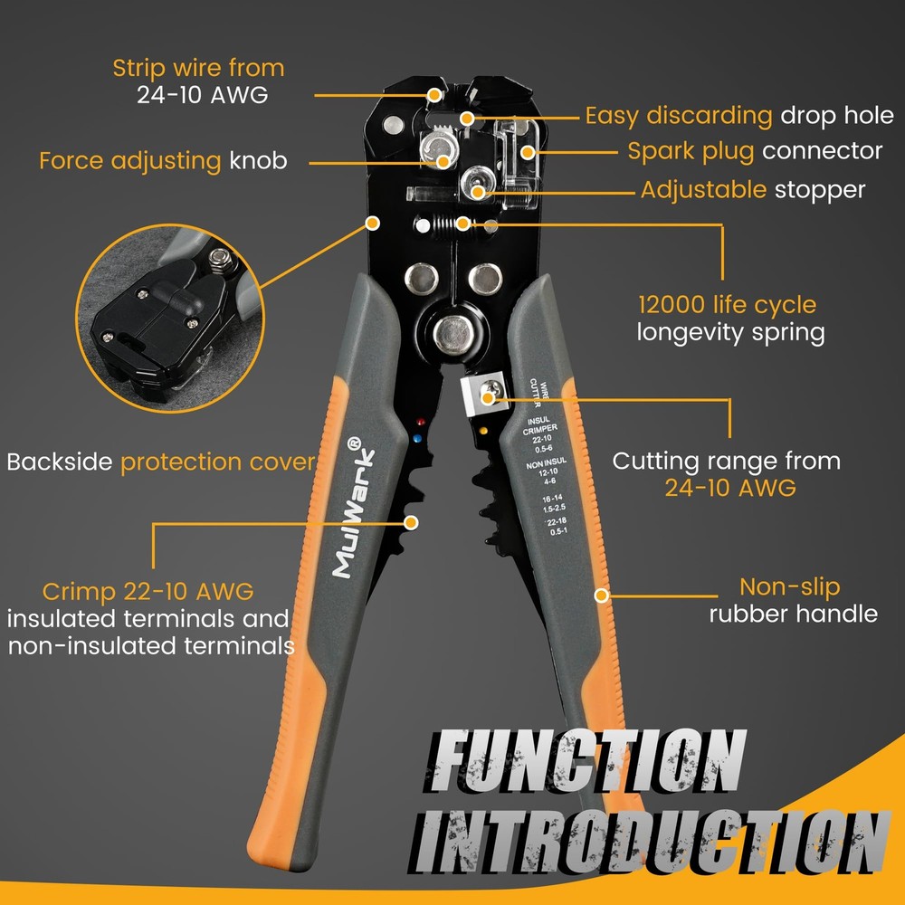 This professional-grade wire stripper and crimper combines stripping (30-8 AWG), cutting (30-10 AWG), and crimping (22-10 AWG) in one durable tool. Made from forged steel with heat-treated jaws, it easily handles copper, aluminum, and electrical wires.There are many advantages including:a djustable stripping depth, ergonomic rubber grips, replaceable blade & springHeavy-duty construction. Perfect for electricians, technicians, and DIYers working on electrical repairs, automotive, or home projects. Get clean strips, precise cuts, and secure crimps every time! MULTI-FUNCTION 3 IN 1 WIRE STRIPPER & CRIMPER:This wire stripper tool combines stripping, cutting, and crimping in one! Perfect for electricians and DIYers, it strips 30-8 AWG wires, cuts 30-10 AWG cables, and crimps 22-10 AWG insulated/non-insulated terminals. Save time with this wire crimping tool that handles all your electrical tasks effortlessly. FLEXIBLE & PRECISE WIRE STRIPPERS:The wire strippers feature an adjustable force knob and stopper for perfect stripping length and strength on any gauge. The innovative drop hole quickly removes insulation, making projects faster. Ideal for electrical wire strippers needing versatility in heavy-duty wire cutters or delicate tasks. PREMIUM HEAVY-DUTY WIRE CUTTERS:Built from drop-forged SS41 steel, these wire stripper pliers are heat-treated for extreme durability. The non-slip TRP handles reduce fatigue, making them the best wire stripers electrical pros can rely on—whether slicing copper, aluminum, or sheathed cables. VALUE PACK WITH LONG-LASTING PARTS:This wire stripper tool includes 1 replaceable blade (for clean cuts) and 1 reinforced spring (tested to 12,000+ uses). The blades preserve insulation integrity, outperforming standard wire cutters heavy duty with precision and longevity. WIDE APPLICATION FOR ELECTRICIANS & DIY:From industrial jobs to home repairs, this wire crimping tool works on copper/aluminum wires, cables, and terminals. A must-have wire stripper for electricians, technicians, or hobbyists tackling any wiring project!