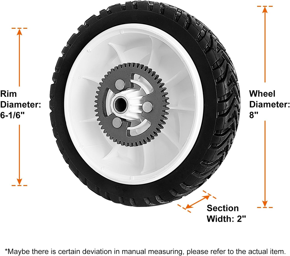 Store New Arrivals Add to Favorite View Feedback Contact 105-3036 Wheels for Toro 22" Recycler Lawn Mower - 8 Inch Rear Drive Wheel 52 Gear Teeth Compatible with Toro 20041 20066 20017 20068 20073 Recycler Self-Propelled Push Mower, 2 Pack Description Style 105-3036 Wheels Size 8 x 2 inch Wheel Size 8 Inches Item Diameter 22 Inches Rim Width 2 Inches Exterior Finish Unfinished Material Rubber Item Weight 5 pounds Manufacturer Part Number 105-3036 Pitch Circle Diameter 0.5 Inches Rim Size 618 Inches Item Weight 5 Pounds Bolt Pattern (Number of Holes) 20 Offset 1.75 Inches Bore Diameter 0.5 Inches Vehicle Service Type Mower, Tractor Model 105-3036 【Fit Models】These 8" rear drive wheels are mainly used for Toro 22" recycler lawn mower, fit models 20013, 20014, 20017, 20018, 20031, 20041, 20047, 20049, 20051, 20066, 20067, 20068, 20070, 20073, etc. For more models, please check the product description. 【 Part Number】105-3036, 105-3024, 105-3025. This wheel could also be used as front tire for Toro recycler self-propelled walk-behind personal pace mulching mower. We also have another product(B09XMDQDCJ) for toro 22" lawn mower, but they fit for toro's different models, please double check your part number, tractor model, and wheel size before you order. 【Durable & Easy to Install】Just need a wrench to bolt up the wheel. For optimal performance, wheels are equipped with metal gear to resist wear and tough wheel tread to increase traction. 【Product Dimensions】wheel size 8'' x 2'', gear size 3-3/8'', hub offset 1-3/4'', bore size 1/2''. 【Package Included】2 pcs of wheel equipped with sturdy rubber tire, bushing and metal drive gear. Product Description 8 Inch Wheel for Toro 105-3036 Part Number: 105-3036, 105-3024, 105-3025. (We also have another product(B09XMDQDCJ) for toro 22" lawn mower, but they fit for toro's different models, please double check your part number, tractor model, and wheel size before you order.) Specification Diameter: 8 Inch Width: 2 Inch Bore: 1/2 Inch Hub Offset: 1-3/4 Inch Package Included: Wheel x 2 Maybe there is certain deviation in manual measuring, please refer to the actual item. Wheels Features Hard Plastic with 3-Spoke These high-quality wheels will help your equipment to become smoother and quieter. 1/2 Inch Bore Size Please check your original part number, size, shape to ensure that our accessory will fit your model. Metal Gear Size: 3-3/8" Wheels are equipped with metal gear to resist wear for optimal performance Durable Rubber Tire Rubber tire enables to reduce noise and improve grip. Compatible Brand and Models 105-3036 Lawn mower front rear wheel compatible with Toro (SN refers to serial number. ) 20013 2002 (SN 220000001-220300000), 20013 2002 (SN 220300001-220999999), 20013 2003 (SN 230000001-230999999), 20013 2004 (SN 240000001-240999999), 20013 2005 (SN 250000001-250999999), 20013 2006 (SN 260000001-260999999), 20014 2002 (SN 220000001-220300000), 20014 (SN 220300001-220999999), 20014 (SN 230000001-230999999), 20017 (SN 220000001-220300000), 20017 (SN 220300001-220999999), 20017 (SN 230000001-230999999), 20017 (SN 240000001-240999999), 20017 (SN 250000001-250999999), 20017 (SN 260000001-260999999), 20018 (SN 220000001-220300000),20018 (SN 220300001-220999999), 20018 (SN 230000001-230999999), 20031 (SN 240000001-240999999), 20041 (SN 250000001-250999999), 20047 (SN 260000001-260999999), 20049 (SN 250000001-250999999), 20051 (SN 240000001-240999999), 20066 (SN 270000001-270999999),20066 (SN 280000001-280999999), 20067 (SN 270000001-270999999),20067 (SN 280000001-280999999), 20068 (SN 280000001-280999999), 20070 (SN 260000001-260999999), 20073 (SN 270000001-270999999),20073A (SN 270000001-270999999), 20074 (SN 270000001-270999999),20074A (SN 270000001-270999999), 20075 (SN 270000001-270999999), 20076 (SN 270000001-270999999),20076A (SN 270000001-270999999), 20079 (SN 260000001-260999999), 20089 (SN 280000001-280999999), 20096 (SN 270000001-270999999), 20098 (SN 270000001-270999999), 20112 (SN 280000001-280999999),20112 (SN 290000001-290999999), 20113 (SN 280000001-280999999),20113 (SN 290000001-290999999), 20655 (SN 270000001-270999999),20655 (SN 280000001-280999999), 20655 (SN 290000001-290999999),20655 (SN 240000001-240999999), 20656 (SN 260000001-260999999), 20658 (SN 280000001-280999999),20658 (SN 290000001-290999999). ABOUT US We offer the best prices around on high quality products. Our E-store includes media such as books, movies, music and games while offering electronics, toys, sporting apparel, clothing, tools, general home, garden items and more. SHIPPING We are always working hard to ensure your package arrives as soon as possible. Please understand that some factors like weather, high postal traffic, and the performance of shipping companies are outside of our control. We offer free shipping to the lower 48 states and ship within 2 business days of payment, usually sooner. We do not accept P.O. Boxes. Please provide a physical address. For shipping outside of the continental USA, we only use eBay's Global Shipping Program.The item is shipped to KY and then sent to the rest of the world. International customers are responsible for all duties and taxes. Continue to check out in order to calculate costs for shipping the item to your country. Messages regarding eBay's Global Shipping Program MUST be directed at eBay EXCLUSIVELY. RETURNS We offer a 30-Day Return Policy on items which you are not completely satisfied with. You have the option for a full-refund or an exchange of the item. No returns are available on items shipped outside of the USA. PAYMENT We accept PayPal. CONTACT US This page content is yet to come Please ad us to your favorite seller and visit again later Thank You CUSTOMER SATISFACTION We try our very best to make sure every customer is completely satisfied. If there's a problem, message us! We're happy to help. WE ACCEPT Copyright © 2021 AutoDS. | All Rights Reserved