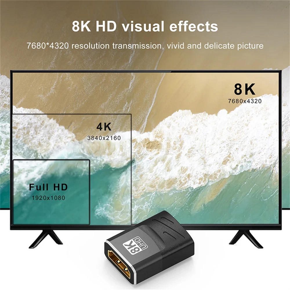 Product Description HDMI-Compatible Adapter 8K 60Hz 4K 120Hz Female To Female Connector HDMI-Compatible 2.1 Cable Extension Converter HDMI-Compatible Adapter Coupler Specification: Material: Aluminum alloy/PVC Interface process: Gold plating Resolution: 7680x4320P Bandwidth: 48Gbps Refresh rate: 8K@60Hz /4K120Hz Version: 2.1 (Backward compatibility 2.0) Feature: 1. UHD 2.1 8K Resolution: Supports 7680x4320, 8K/60Hz and compatible with 4K@120Hz, 48Gbps. Offers more dynamic range and image detail, providing a deeper and more realistic viewing experience. Note: The host and display devices must also be version 2.1 to meet requirements. 2. Stunning 3D Visual Effects: Create a high-definition home theater with 3D imaging technology. Smooth and natural color transitions provide vivid and lifelike images that transport you into the scene. 3. Compatibility with Various Devices: Suitable for monitors/ TVs/ projectors/ desktop computers/ laptops/ game consoles, etc. Please check the interface type before purchasing and HDMI-compatible cables are required for use. Product List: 1x HDMI-Compatible Adapter Shipping 1. Items sent from US warehouse. 2.Receiving time = Processing time + Shipping time . 3. Processing Time: Around 1-2 business Days . 4. Shipping Time: 3-5 business day. it may have a little delay during some holiday (such as Christmas), any problem, please feel free to contact. Returns 1. 30 days warranty from the purchased date. Please contact us via email before returning the defective item. 2. Our warranty does not extended to any product that are physically damaged or that are not under normal operating conditions as result of misuse or improper installation on the buyer/user's part. 3. Return items should include the original packaging and all accessories. buyers MUST contact us for the returning address. 4. In all cases, buyers pay shipping fees at their own cost to return products for exchange or refund. We will be responsible for the postage of replacements. Refund will be made upon receipt of the returned item. Contact Us If you have any question, please e-mail us immediately, we will reply you as quickly as possible. We care about our valued customers, and will always try to help you. About Us We are committed to providing you with the best quality products and services. We hope your shopping experience is easy and enjoyable. Payment We accept all verified payment from eBay. You may also like 13Pack Metal 0.6-2.0mm 90mm Long Screwdrivers Repair Tools For Watchmakers Watch 15.04 USD 1.99 USD Foot Pedal-Pressure Control-Valve 3 Way 2 Position 1/4" Air Pneumatic Switch 25.43 USD 1.99 USD Durable Abrasive Mounted Stone For Rotary Tools Grinding Stone Wheel Head Dremel 9.95 USD 1.99 USD WiFi 6 6E Antenna Tri-Band 6GHz 5GHz 2.4GHz RP-SMA Male For PC Desktop Computer 14.97 USD 1.99 USD FM Antenna 3.5mm for Bose Wave Music System Indoor Sound Radio Stereo Receiver F 10.79 USD 1.99 USD 2 Pcs New Microphone Furry Windscreen Muff Wind Cover Foam Cover for Blue Yeti 15.04 USD 1.99 USD powered by