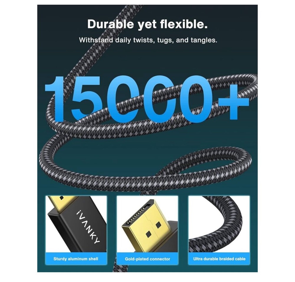 The IVANKY 8K DisplayPort Cable 1.4 is a high-quality, long DP cable that supports 8K resolution at 60Hz, 4K resolution at 144Hz, and 1080P resolution at 240Hz. It features a sleek black design and a length of 20 feet, making it ideal for connecting various devices for a seamless viewing experience. With a 30-day money-back guarantee and free fast shipping, this cable offers convenience and peace of mind for all your video needs. Box was opened but cable is brand new