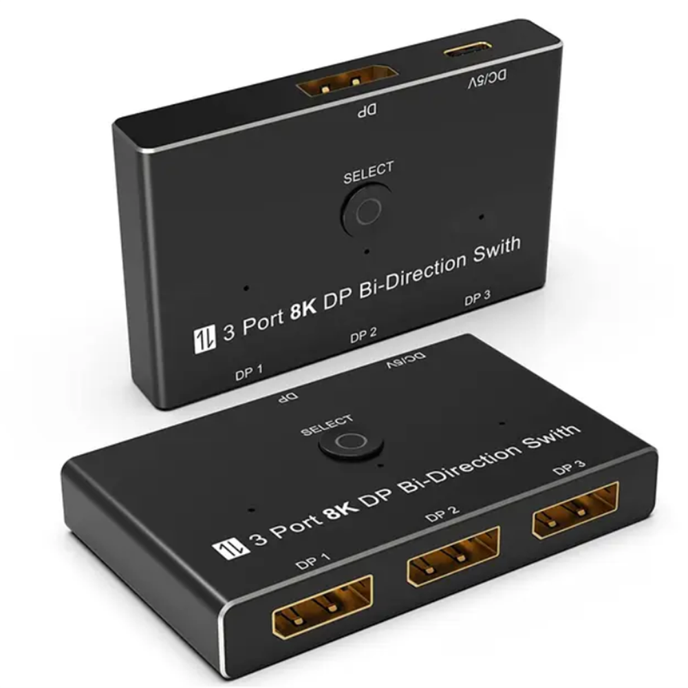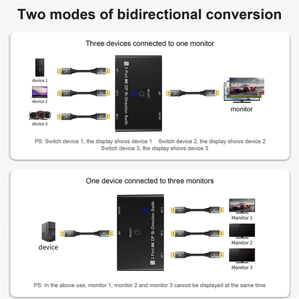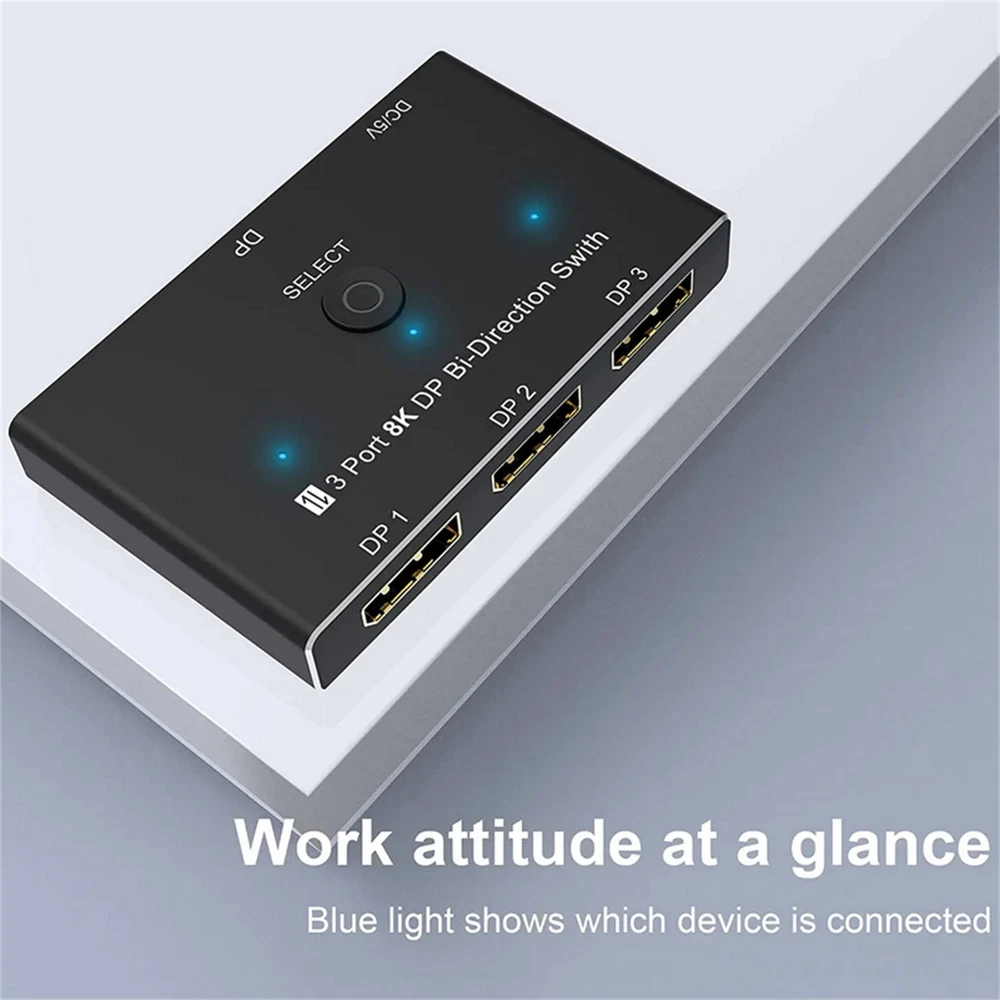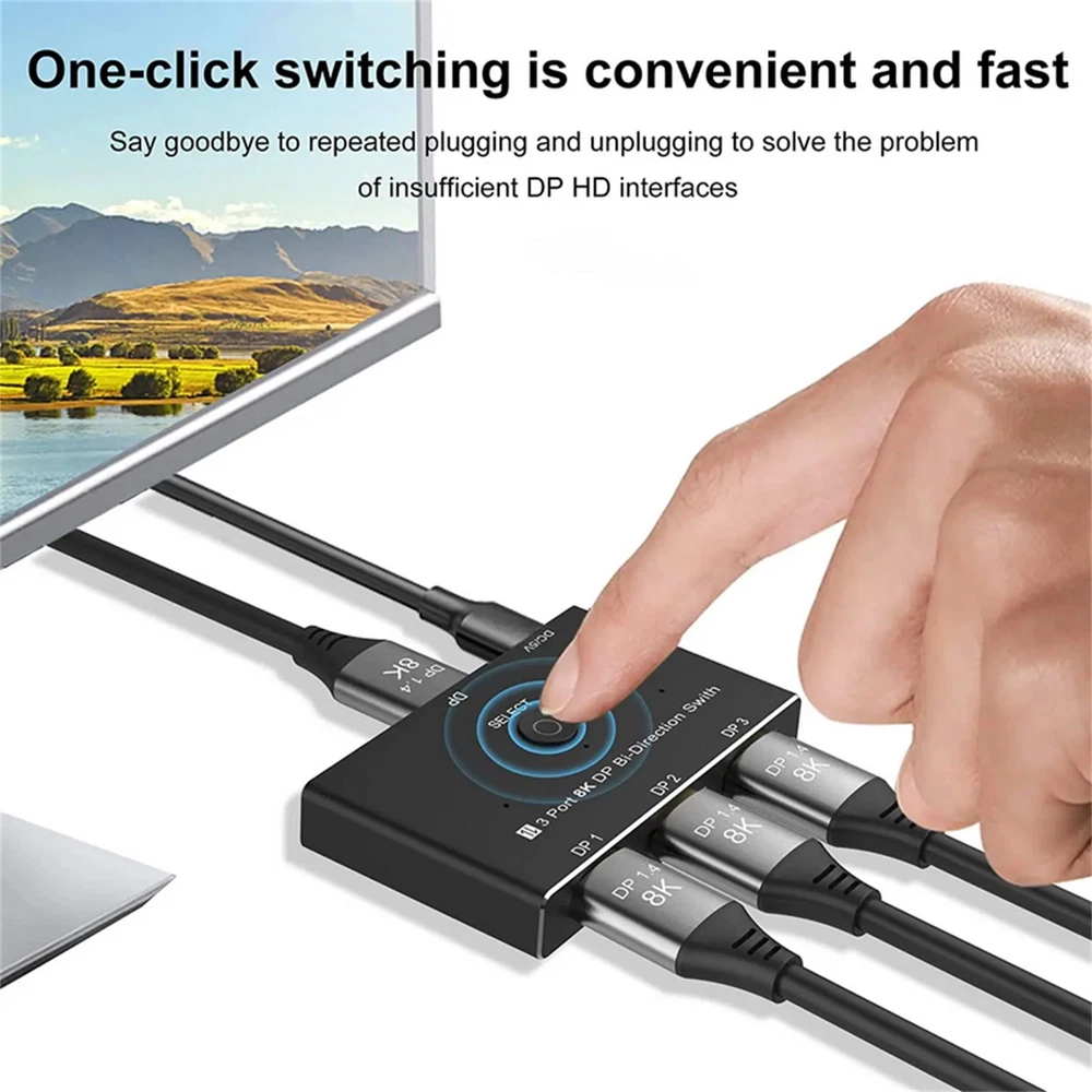 Product Description 1*8K DisplayPort Splitter 3 in 1 Out 1 in 3 out 3x1 1x3 Display Port Adapter DisplayPort 8K Two-Way DP 1.4 Switch 3 In 1 Out/1 In 3 Out Bi-Direction 8K@30Hz 4K@144Hz Splitter Converter For Multiple Source And Displays Specifications: Bandwidth: 32.4Gbps Output Resolution:1080P@60Hz/120Hz/144Hz/165Hz, 4K@60/120Hz/144Hz(DSC), 8K@30Hz Deep Color: 8bit / 10bit / 12bit Operating Temperature: -15C~55C/5°F~131°F Chroma: 4:2:0/4:2:2/4:4:4 Chassis: Aluminium alloy Shell Dimension: 79.4mm(L)x48.5mm(W)x13.0mm(H) Feature: 1. Up to 3 devices can be connected to a monitor, TV or projector. Pressthe button on the product to switch another signal to the monitor. 2. A DisplayPort device can be connected to up to 3 screens. The screenon which the signal is displayed can be selected at the pressing of abutton.(Simultaneous output to multiple screens is not possible) 3. Bi-Direction DP Switch:The DisplayPort switcher allow you to connect three DP source to one DP display or connect one DisplayPort source to toggle between three displays. (Three displays CANNOT display simultaneously, Press"Select"button to switch between three displays.) While connecting to Source or Display, you must use the usb cable to power the splitter, or your display can not show anything). Do not use too long cable(total 3m) for connection between the switcher and your devices. 4. Plug and Play: External power required, the DP selector box is easy to setup and operate. Package Contents: 1x C 1x USB 2.0 Cable(Type A to Type c) 1x User manual Note: While using, press"select"Button to switch signal between three sources or displays, the indicator lights show the working status. Three displays can not display at the same time. Shipping Returns Contact Us Payment 1. Items sent from US warehouse. 2.Receiving time = Processing time + Shipping time 3. Processing Time: Around 1-2 business Days 4. Shipping Time: 3-5 business day it may have a little delay during some holiday (such as Christmas),any problem ,please feel free to contact 1. 30 days warranty from the purchased date. Please contact us via email before returning the defective item. 2.Our warranty does not extended to any product that are physically damaged or that are not under normal operating conditions as result of misuse or improper installation on the buyer/user's part. 3.Return items should include the original packaging and all accessories. buyers MUST contact us for the returning address. 4.In all cases, buyers pay shipping fees at their own cost to return products for exchange or refund. We will be responsible for the postage of replacements. Refund will be made upon receipt of the returned item. Pls contact us if you have any problems,we will try our best to solve for you We accept all verified payment from eBay. Shipping 1. Items sent from US warehouse. 2.Receiving time = Processing time + Shipping time 3. Processing Time: Around 1-2 business Days 4. Shipping Time: 3-5 business day it may have a little delay during some holiday (such as Christmas),any problem ,please feel free to contact Returns 1. 30 days warranty from the purchased date. Please contact us via email before returning the defective item. 2.Our warranty does not extended to any product that are physically damaged or that are not under normal operating conditions as result of misuse or improper installation on the buyer/user's part. 3.Return items should include the original packaging and all accessories. buyers MUST contact us for the returning address. 4.In all cases, buyers pay shipping fees at their own cost to return products for exchange or refund. We will be responsible for the postage of replacements. Refund will be made upon receipt of the returned item. Contact Us Pls contact us if you have any problems,we will try our best to solve for you Payment We accept all verified payment from eBay. You may also like TV Remote Control Controller For Bose Solo 5 TV Soundbar System 535 AUX1 CM525 18.99 USD Storage Case Travel Carrying Bag For Bose SoundLink 3 SoundLink III Speaker 20.0 USD 4Pcs/Set Tires & Wheels Rims For Tamiya TT01 TT02 XV01 HPS HPI 1/10 RC Car aa 22.77 USD Repair LCD Screen Hinge Flex Cable For Canon PowerShot G7X Mark II G7 X II G7X2 12.75 USD Echo Recoil Starter Assembly A051001312 A051001311 Pe-225 Srm-255 Pas-255 17.84 USD 1.99 USD Portable Adjustable Stainless Handheld Can Opener Jar Bottle Lid Remover Tool 9.99 USD powered by