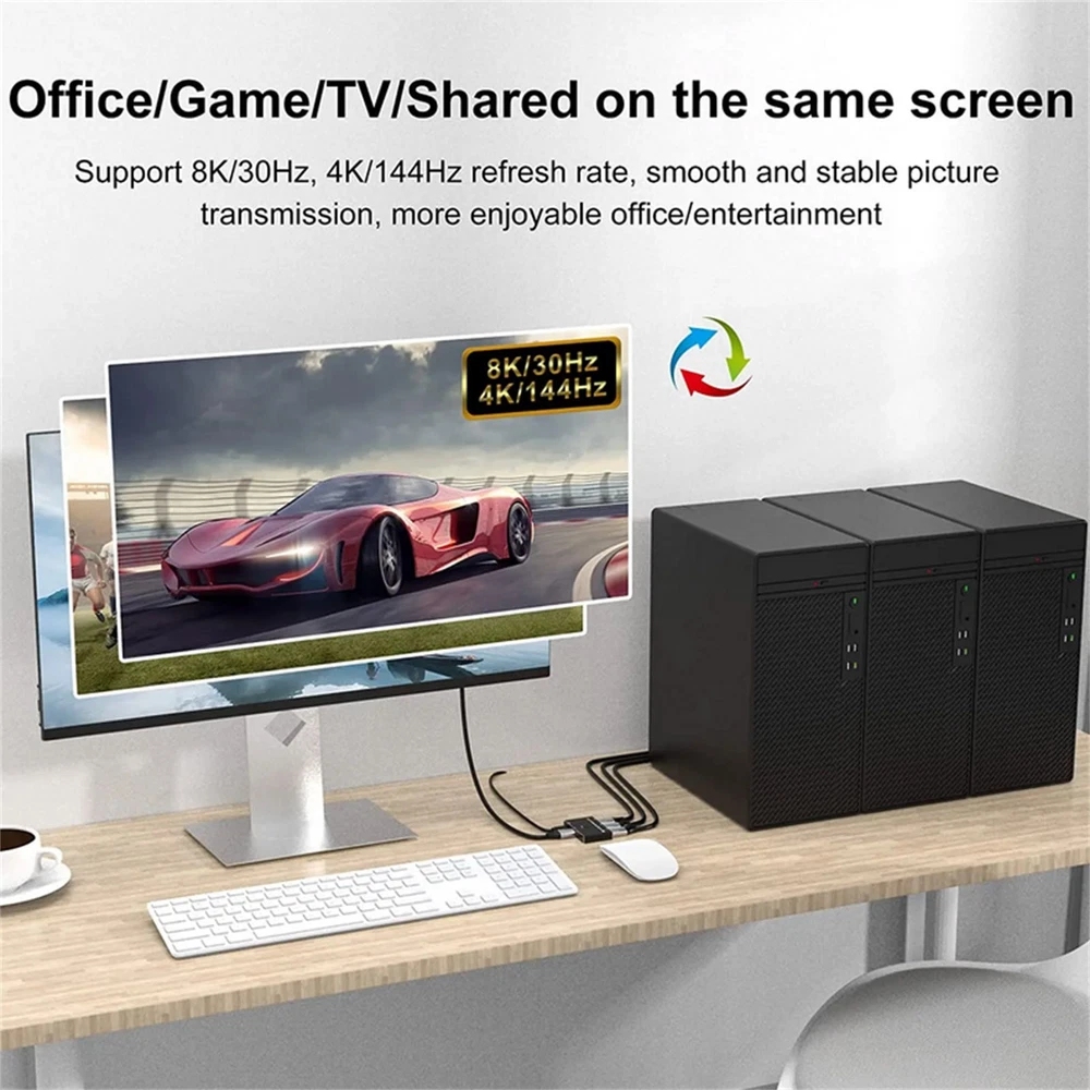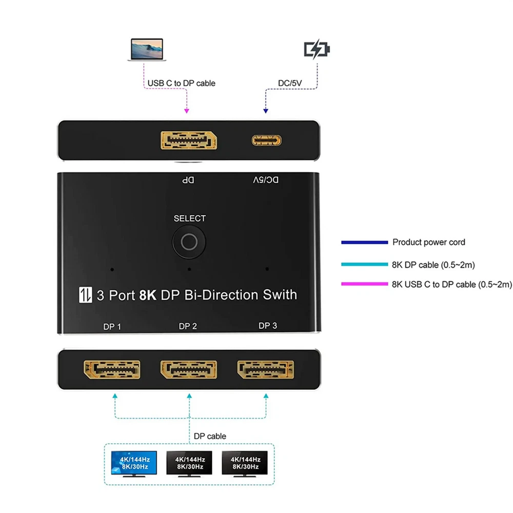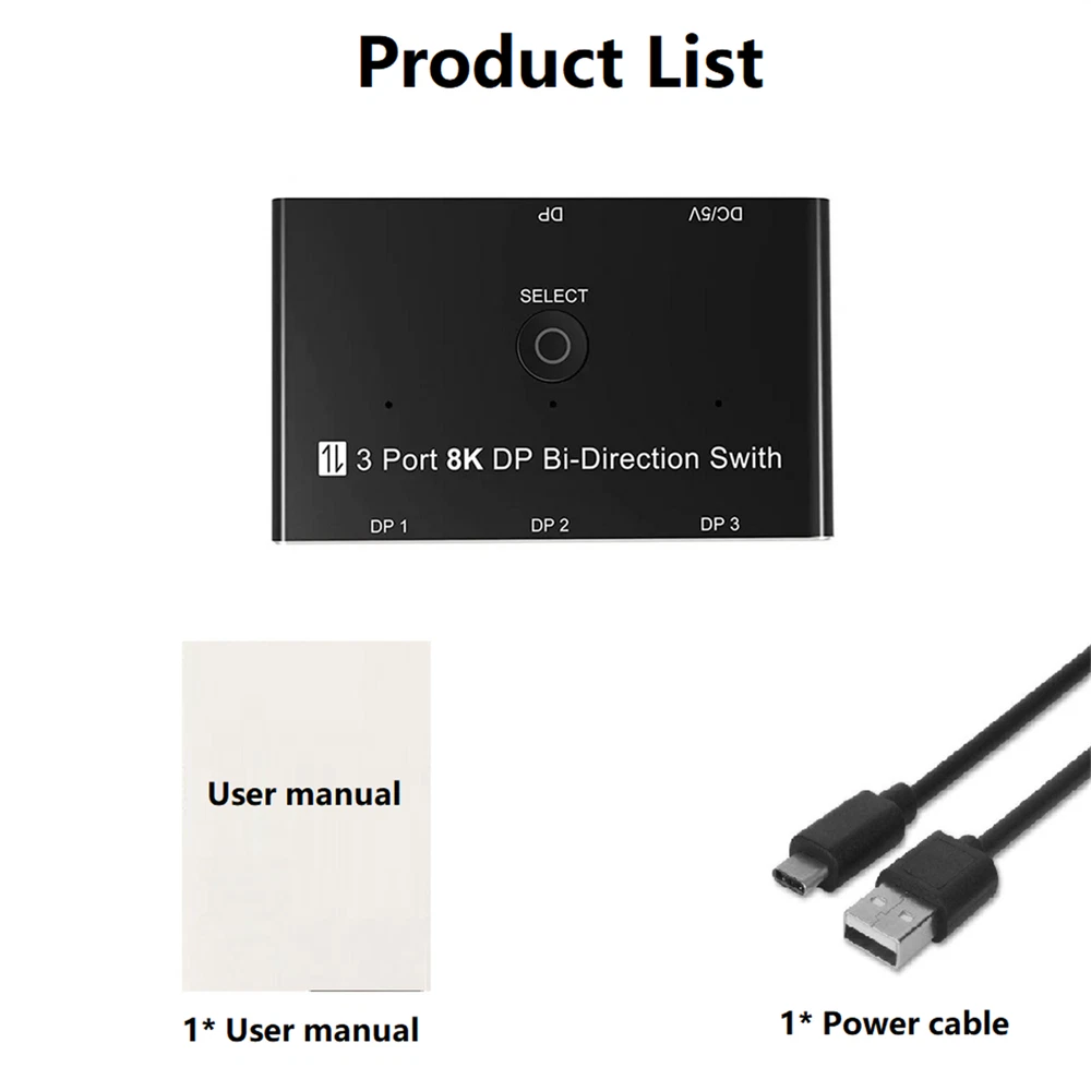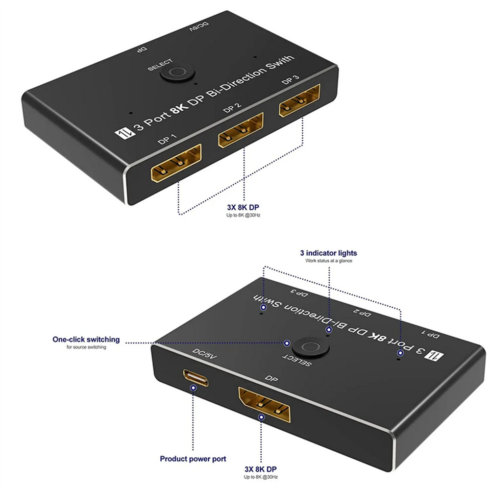 Product Description 1*8K DisplayPort Splitter 3 in 1 Out 1 in 3 out 3x1 1x3 Display Port Adapter DisplayPort 8K Two-Way DP 1.4 Switch 3 In 1 Out/1 In 3 Out Bi-Direction 8K@30Hz 4K@144Hz Splitter Converter For Multiple Source And Displays Specifications: Bandwidth: 32.4Gbps Output Resolution:1080P@60Hz/120Hz/144Hz/165Hz, 4K@60/120Hz/144Hz(DSC), 8K@30Hz Deep Color: 8bit / 10bit / 12bit Operating Temperature: -15C~55C/5°F~131°F Chroma: 4:2:0/4:2:2/4:4:4 Chassis: Aluminium alloy Shell Dimension: 79.4mm(L)x48.5mm(W)x13.0mm(H) Feature: 1. Up to 3 devices can be connected to a monitor, TV or projector. Pressthe button on the product to switch another signal to the monitor. 2. A DisplayPort device can be connected to up to 3 screens. The screenon which the signal is displayed can be selected at the pressing of abutton.(Simultaneous output to multiple screens is not possible) 3. Bi-Direction DP Switch:The DisplayPort switcher allow you to connect three DP source to one DP display or connect one DisplayPort source to toggle between three displays. (Three displays CANNOT display simultaneously, Press"Select"button to switch between three displays.) While connecting to Source or Display, you must use the usb cable to power the splitter, or your display can not show anything). Do not use too long cable(total 3m) for connection between the switcher and your devices. 4. Plug and Play: External power required, the DP selector box is easy to setup and operate. Package Contents: 1x C 1x USB 2.0 Cable(Type A to Type c) 1x User manual Note: While using, press"select"Button to switch signal between three sources or displays, the indicator lights show the working status. Three displays can not display at the same time. Shipping Returns Contact Us Payment 1. Items sent from US warehouse. 2.Receiving time = Processing time + Shipping time 3. Processing Time: Around 1-2 business Days 4. Shipping Time: 3-5 business day it may have a little delay during some holiday (such as Christmas),any problem ,please feel free to contact 1. 30 days warranty from the purchased date. Please contact us via email before returning the defective item. 2.Our warranty does not extended to any product that are physically damaged or that are not under normal operating conditions as result of misuse or improper installation on the buyer/user's part. 3.Return items should include the original packaging and all accessories. buyers MUST contact us for the returning address. 4.In all cases, buyers pay shipping fees at their own cost to return products for exchange or refund. We will be responsible for the postage of replacements. Refund will be made upon receipt of the returned item. Pls contact us if you have any problems,we will try our best to solve for you We accept all verified payment from eBay. Shipping 1. Items sent from US warehouse. 2.Receiving time = Processing time + Shipping time 3. Processing Time: Around 1-2 business Days 4. Shipping Time: 3-5 business day it may have a little delay during some holiday (such as Christmas),any problem ,please feel free to contact Returns 1. 30 days warranty from the purchased date. Please contact us via email before returning the defective item. 2.Our warranty does not extended to any product that are physically damaged or that are not under normal operating conditions as result of misuse or improper installation on the buyer/user's part. 3.Return items should include the original packaging and all accessories. buyers MUST contact us for the returning address. 4.In all cases, buyers pay shipping fees at their own cost to return products for exchange or refund. We will be responsible for the postage of replacements. Refund will be made upon receipt of the returned item. Contact Us Pls contact us if you have any problems,we will try our best to solve for you Payment We accept all verified payment from eBay. You may also like TV Remote Control Controller For Bose Solo 5 TV Soundbar System 535 AUX1 CM525 18.99 USD Storage Case Travel Carrying Bag For Bose SoundLink 3 SoundLink III Speaker 20.0 USD 4Pcs/Set Tires & Wheels Rims For Tamiya TT01 TT02 XV01 HPS HPI 1/10 RC Car aa 22.77 USD Repair LCD Screen Hinge Flex Cable For Canon PowerShot G7X Mark II G7 X II G7X2 12.75 USD Echo Recoil Starter Assembly A051001312 A051001311 Pe-225 Srm-255 Pas-255 17.84 USD 1.99 USD Portable Adjustable Stainless Handheld Can Opener Jar Bottle Lid Remover Tool 9.99 USD powered by