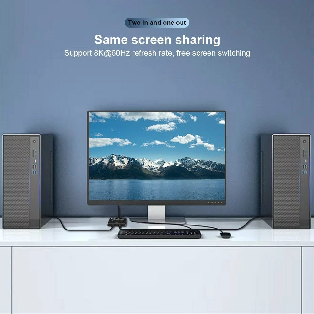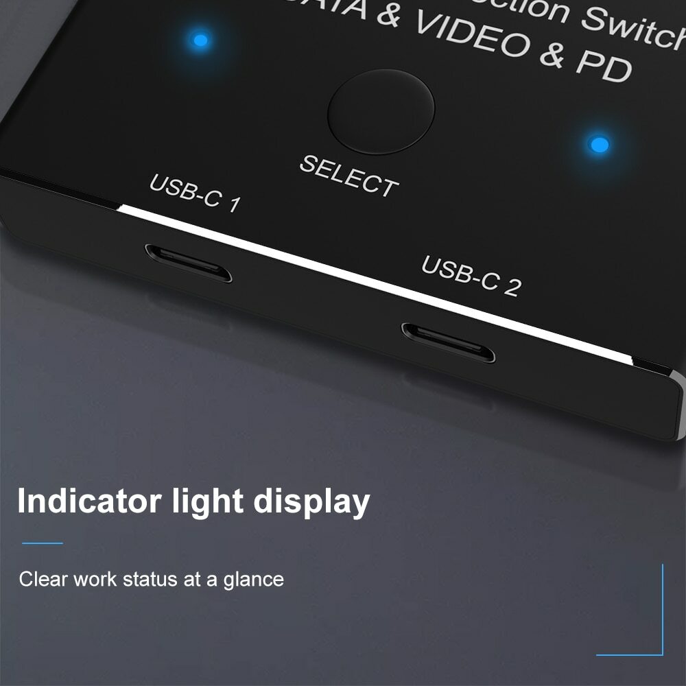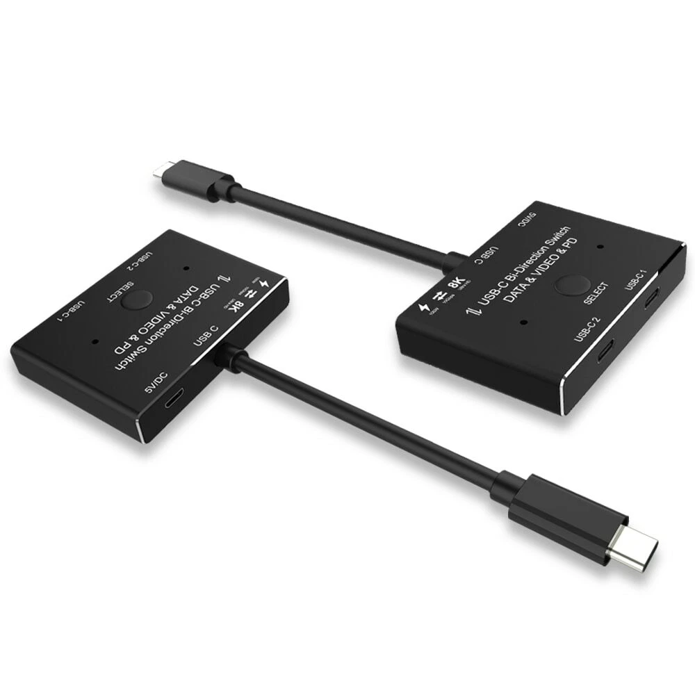 USB-C 8K Bi-Direction switch USB3.1 USB PD 3.0 splitter 1x2 / 2x1 DATA & VIDEO & PD100W switcher, used for computer monitor mobile phone, etc Multiple Source and displays NOTE: 1: The product does not include the USB3.1 Gen2 cable, which needs to be purchased separately. 2: The display resolution depends on the connected hardware and system. 3: Very important, Type-C switcher only supports USB data protocol. INTRODUCTION: This USB C switch has two working modes. It can be used as a 2x1 switch, which allows you to connect two sources devices to one display; It can also be used as a 1x2 splitter that enables you to connect one source to two displays(Note that two displays can not work at the same time). Video Function-1: 2 in 1 Out-Two Sources Devices to one Display In this connection Method,please follow the following instruction to operate: 1:Connect two USB 3.1 Gen 2 Cable from our USB-C Switch 's USB-C 1 and USB-C 2 Port to your USB-C Source Devices 2:Connect the Fixed USB-C Cable in the USB-C Position to your Monitor's USB-C Port(Please make sure USB-C Port in the Monitor support video transfer and the video function had been opened) 3:Connect the supplied Micro USB to USB Cable to power with the switch(This is necessary Step,or the display can not show anything) 4:Press"Select"Button to switch between two source devices. 5 Important notes While using : (1):Please make sure your source devices,like laptop or PC had selected duplicate or extend your screen,not only dispaly screen-1. (2):Please do not use "usb-c hdmi" or'usb-c dp"cable to connect from our USB-C 1 and USB-C 2 Port to your source Devices. (3):Please do not use USB-C Gen 2 cable longer than 1.5 meters to connect the USB-C switch to your source devices. USB-C Switch/Spliiter For Multiple Displays,Quickly Switch between Two displays Video Function-2: 1 in 2 Out-One Sources Devices to Two Displays(Switch connection ) In this connection Method,please follow the following instruction to operate: 1:Connect the Fixed USB-C Cable in the USB-C Position to your USB-C Devices 2:Connect two USB-C Gen 2 Cables from the USB-C Switch's USB-C 1 and USB-C 2 port to your USB-C Displays.(Please make sure USB-C Port in the Monitor support video transfer and the video function had been opened,Two screens cannot be displayed at the same time) 3:Connect the supplied Micro USB to USB Cable to power with the switch(This is necessary Step,or the display can not show anything) 4:Press"Select"Button to switch between two displays. 5 Important notes While using : (1):Please make sure your source devices,like laptop or PC had selected duplicate or extend your screen,not only dispaly screen-1. (2):In this connection,you can choose“USB-C to HDMI”or"USB-C to DisplayPort"cable to connect from USB-C 1 or USB-C 2 to your monitors (3):if you connect a USB-C Gen 2 cable to your monitor, we suggest you use cable no longer than 1.5m. Multi-functional 3-in-1 USB-C switch makes life more enjoyable and convenient FEATURES: Please use a standard USB-C Gen-2 cable to connect your signal source or monitor device.USB-C 8K Bi-Direction Video Transmissions&Data&Power Switch/Splitter:The USB-C switcher allow you to connect two USB-C sources to one USB-C display or connect one USB-C source to toggle between two displays,(Two displays CANNOT display simultaneously),both of your source and display's USB-C Port should support DP Alternate Mode for Video Transmitting.Ultra HD 8K Video Experience USB-C 8K Switch for Video 2in 1Out,you are allowed to connect two sources to the Port "USB-C 1" and "USB-C 2"in the switch,then connect to the display with the supplied Fixed USB-C Cable.For the USB-C Cable connected between the source devices and Our Switch,these kind of cable should all supporting video transmissiomns.At this connection,you can not connect USB-C hdmi or USB-C displayport cable to your Monitor.Press"Select"Button to switch between two sources. USB-C 8K Splitter for Two Displays 1in 2Out,you are allowed to connect the source device from the USB C end via the supplied fixed USB C Cable,then connect to two USB-C displays to the port "USB-C 1" and port "USB-C 2"in the switch.In this connection,you can connect via USB-C to HDMI or DP Cable to your monitor.Two Displays can not connect at the same time,the USB-C Cable you used should support for video transfer.Press"Select"Button to switch between two displays. USB-C Switch with Power and Data Function,It supports Max 100w Power Delivery and Max Transmissions Speed 10Gbps(USB3.1 Gen2),With our switch, you can charge your mobile phone, computer, tablet and other devices, and you can also transfer data from your computer, mobile phone, etc. to your U disk and other devices. Both data and charging functions require your USB-C cable to support the above functions Ultra 8K Video Output,you can output max 8K@30Hz 4K@120Hz 1080P@165Hz via our USB-C Switch/Splitter to your USB-C Displays,The maximum resolution of your output depends on your Source device, monitor and cable used.When you use our switcher to realize the video function, we recommend that you do not use too long cables(The sum of the cables at both ends does not exceed 3 meters).Too long cables at both ends will cause the screen to flicker or the screen cannot be displayed PACKAGE: •1 x Bi-direction Switch •USB A to Micro B cable •1 x User Manual