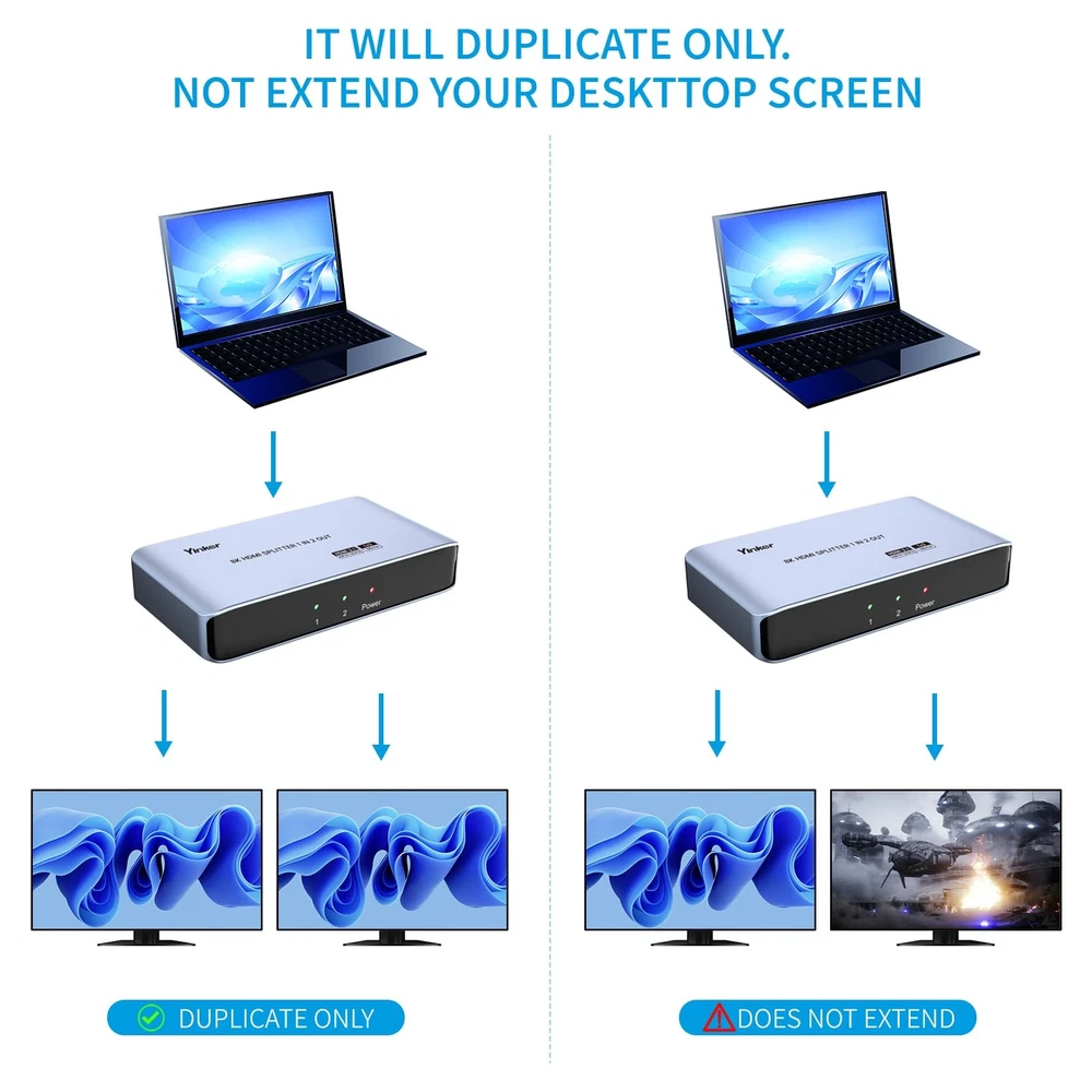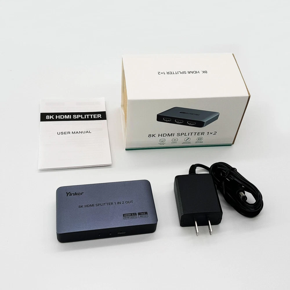 8K HDMI Splitter 1 in 2 Out, 8K@60Hz 4K@120Hz HDMI Splitter 1x2 for Duplicate/Mirror Only, Support EDID, HDCP2.3 8K@60Hz HDMI Splitter 1 in 2 out, this device allows to duplicate/mirror one HDMI source on 2 HD monitors, TVs, projectors simultaneously at 8K@60Hz/ 4K@120Hz. This 8K HDMI Splitter is available to cascade connection to more than 2 target monitors. Please noted that it only supports mirror, can not extend into different displays. This 1x2 HDMI Splitter supports max to 8K@60Hz(4:4:4), downscale to 4K@120Hz which is perfect for game console. EDID, DTS-HD, Dolby-trueHD, DTS, Dolby-AC3, VRR., DSD etc.are supported. The HDMI 2.1 Splitter is widely compatible with most of the operating system like Windows, Mac OS, Linux.Works with PS4, Roku, Fire TV, Blu-ray players, PS4 Pro, PS3, Beamer, etc. Package content: 8K HDMI Splitter x1, Power Adapter x1, User Manual x1.
