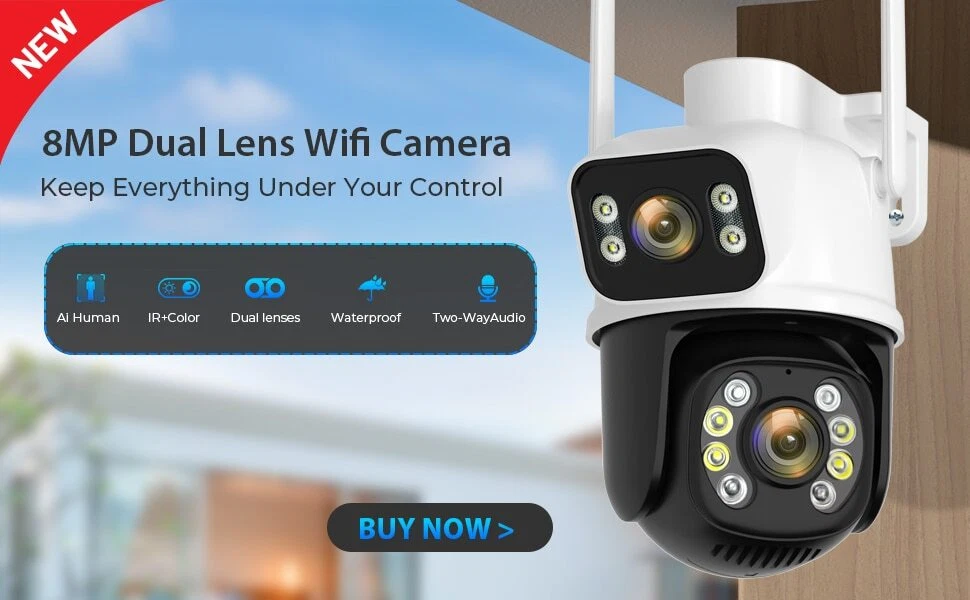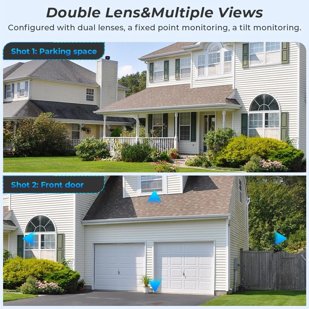 Dual-Lens with Dual Screen Auto Tracking PTZ WIFI Camera Dual lens, Dual screen, Notifications alarm, humanoid tracking, two way voice intercom 360 monitoring, full color night vision, IP66 waterproof, mobile phone remote monitoring,Share video, SD card storage, 24 hours video recording Main Features: - Dual lens camera. Top Lens is 3.6MM; Bottom Lens is 3.6MM - Dual-lens dual-sensor dual-screen, wide-angle Viewing + Long Distance Viewing to achieve clear monitoring from far and near; - Dual light source design, built-in infrared light + white light, night vision infrared and night vision full color can be set; - Pan Tilt Move: Bottom Lens: Horizontal: 270 degree; Vertical: 90 degree. - 2.4G WIFI + RJ45 network port for Internet access; - Support TF storage and cloud storage (need pay in iCSee app); - Two-way voice intercom, two-way video synchronous recording and playback - Humanoid detection Smart Alert: Motion Triggered with Alarm, APP Push notifications and Alarm recording - Auto Tracking: When ip camera detects object moving, it will auto move follow the object. -Smart Phone APP name: "iCSEE" from Google Play or iOS APP Store Packing List: 1x PTZ Camera / 1x User Manual 1x Power Supply / 1x Screws Bag 4MP 8MP comparison 4MP camera version: Means that the single lens is 2MP, so the dual-lens is 2MP+2MP=4MP. 8MP camera version: Means that the single lens is 4MP, so the dual-lens is 4MP+4MP=8MP. Dual Lens and Dual Screen There are 2 video screens in APP, the upper one is fixed position camera and the lower one is PTZ camera. 270° Pan & 90° Tilt Rotate Due to the horizontal 270° and the vertical 90 °, you can remotely control the wifi outdoor camera to view every corner via your mobile phone. Real Two Way Audio Built in microphone and speaker,support real time video,which allows you talk with your visitor in real time wherever you are. Smart Night Vision Built -in White LED and IR LED, you can choose color night vision or infrared black and white night vision. IP66 Waterproof / Dustproof The camera is equipped with IP66 case , which is waterproof, sun-proof and dust-proof. It is suitable for any environment. AI Human Detection Alerts Quickly finds human targets and immediately sends App notifications to your phone so you can see what's happening anywhere. AI Auto Tracking When someone passes through the protected area, the camera will detect the person's movement and follow the person. Support TF Card Storage and Cloud Storage(Need Pay For) The camera supports up to 128GB TF card local backup and also provides cloud storage service(Need to pay extra cost). 2.4Ghz Wifi Connection & LAN Connection Powered by DC12V adapter, you can connect the camera to Wi-Fi network. you can setup wifi connection of the camera or LAN Search with network cable connected to router, work with 2.4G wifi only (Does not support 5G).