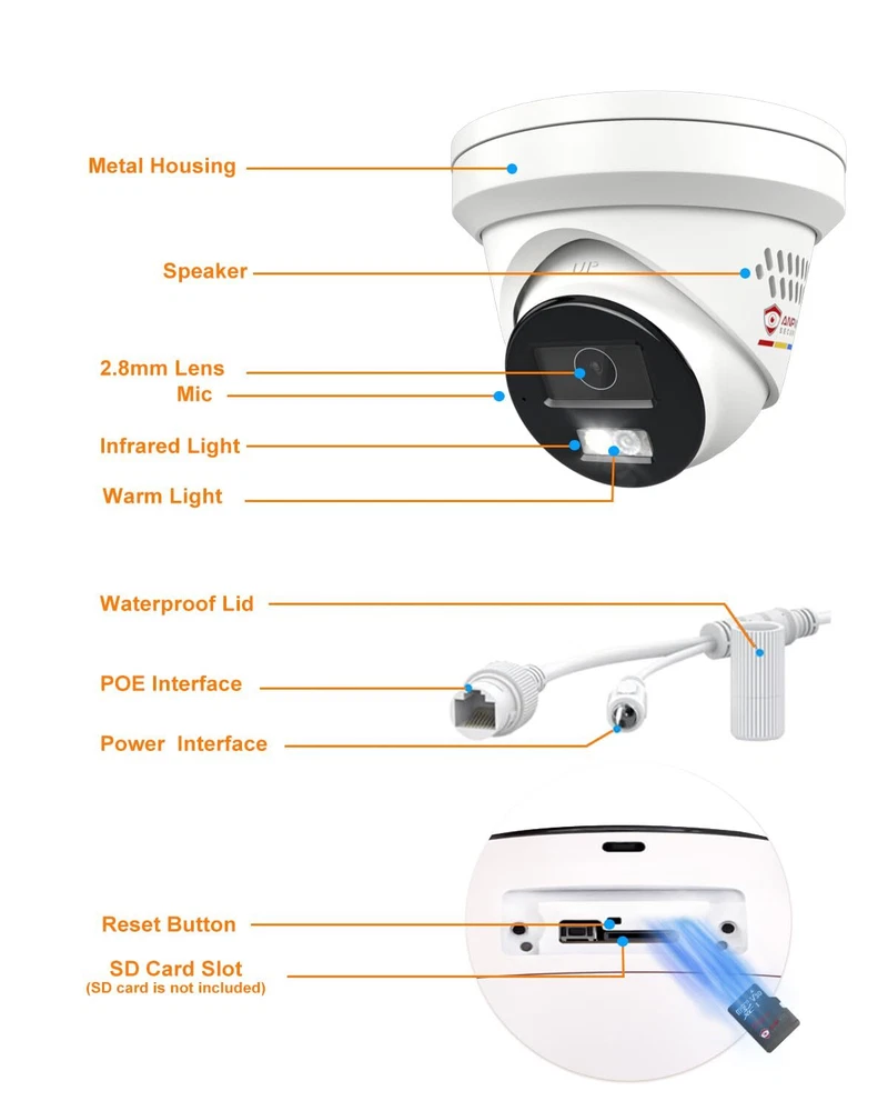 8MP PoE Camera with Active Deterrence: 8mp ip camera provides ultra HD images with a resolution of 3840x2160. Update with advanced active deterrent feature, when the poe ip camera detects people or vehicles, the speaker and light alarm will be triggered: flashing white light and warning sounds from the speaker help deter unwanted individuals. Human/Vehicle Detection and Smart Alerts: This 4k ip camera utilizes AI technology for precise human and vehicle detection, reducing false alarms. You can receive notifications with human or vehicle alerts and enjoy two-way audio capabilities, help you make real time talk with anyone near the turret poe camera. Enhanced Night Vision and Compression Technology: Experience clear imaging in low-light conditions with F1.6 super wide aperture of this 8mp poe security camera. The H.265+ coding technology allows for efficient video compression, maximizing storage capacity. A perfect choice for outdoor use, this 8mp ip security camera has metal housing and IP67 waterproof rating. Easy Installation and Remote Access: With advanced PoE technology, you can easily use only an ethernet cable to power and transmit data, meantime, with 6×6×5.7 inches and 1.8lb weight, this poe turret camera can easily installed in indoor and outdoor. Connect to NVR or compatible third-party NVR/DVR for smooth use. With the ability to support remote access, you can monitor your property from anywhere anytime. Ideal for both indoor and outdoor surveillance applications. Enables continuous protection: Ensure the safety of your premises with 8mp poe camera featuring a wide range of advanced security features. From intelligent person/vehicle detection to active deterrent alarm, this 8mp camera keeps your property secure round the clock. Moreover, this 8mp poe ip camera supports up to 512GB SD card storage for continuous monitoring and protection, help you less storage worry.( 512GB SD Card is not included)