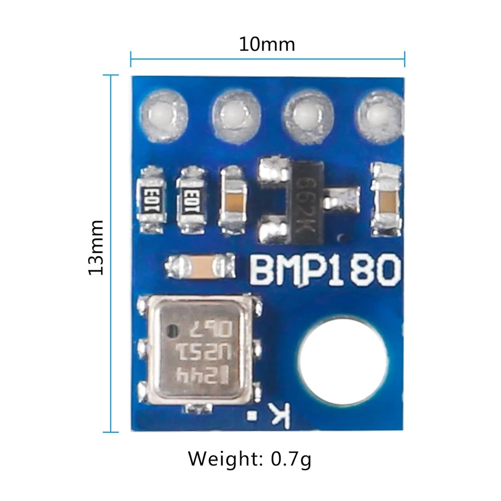 8PCS GY-68 BMP180 Digital Barometric Pressure Sensor Module Product Details Package Dimensions : 4.57 x 3.23 x 0.35 inches; 0.46 ounces Item model number : QC19033 Manufacturer : QCCAN BMP180 is a high-precision, small size, ultra-low power pressure sensor that can be used in mobile devices. Pressure range: 300 ~ 1100hPa (9000 meters above sea level ~ -500 meters); Low power consumption: 5μA in standard mode. Using a sensor as capable as the BMP180 you can achieve accuracy of 1m, with noise of only 17cm in ultra high resolution noise. The device will operate at only 0.3uA meaning low current draw for battery powered applications. The BMP180 comes fully calibrated and ready to use. As the device operates over I2C we've added optional I2C pull ups that can be enabled using the PU (pull up) jumper on the board for your convenience and ease during breadboard. Using I2C, the device provides pressure and temperature as 16bit values, which are used along with calibration data within the device are used to provide a temperature compensated altitude calculation. Description(BMP180):Measuring the absolute pressure of the environment using a digital barometer such as this has some interesting applications. By converting the pressure measured into altitude, you have a reliable sensor for determining the height of your robot, plane .Features:1.8V to 3.6V Supply VoltageLow power consumption - 0.5uA at 1HzI2C interfaceMax I2C Speed: 3.5MhzVery low noise - up to 0.02hPa (17cm)Full calibratedPressure Range: 300hPa to 1100hPa (+9000m to -500m)Weight: 1.18gSize: 21mm x 18mmUsed for:GPS precise navigation (dead reckoning, the upper and lower bridge detection, etc.)Indoor and outdoor navigationLeisure, sports and medical health monitoringWeather forecastVertical speed indication (rising/sinking speed)Package Include:8 * BMP180 Barometric Pressure Sensor Module