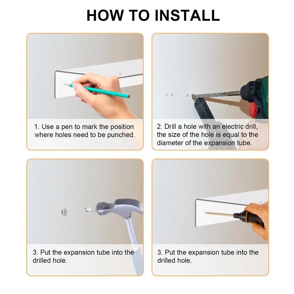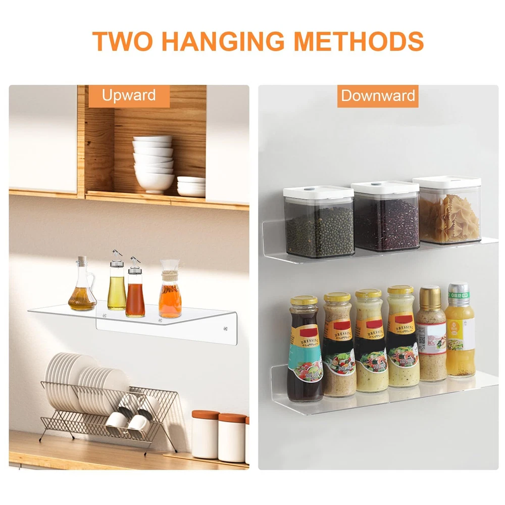 Large Capacity: 14x5.9x2.5 inch clear acrylic floating shelves set of 8 in the same size is equipped with strong bearing capacity; 3mm thickness which would be very stable to ensure your safety when fixed into the wall. Screws and cover nuts included. Durable and Sturdy: The floating bookshelf displays made of thick acrylic, the structure is strong, not easy to break, and easy to clean. Fine workmanship and nice texture take up little space, can be used for a long time. Stylish & Light Luxury: These clear wall ledge shelf wall with transparent color and L- shape design make them beautiful And stylish in simple style. The bright and beautiful floating shelves with round corner and edge scraping for safety and smoothness will never hurt hands. Easy Installation Method: Clear floating shelves for wall have pre-drilled holes, detailed instructions and all necessary mounting hardware screws, make installation simple and easy in minutes. Multifunctional Use: Invisible floating bookshelf displays made of acrylic for kitchen, bedroom, bathroom, living room; Can be a wall mounted shelf for plants, speaker, radio, artwork, cosmetics, books, picture frame, clock, toys collectibles, toiletries.