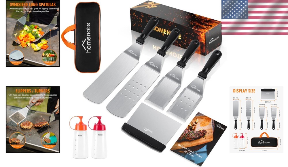 Robust 8-Piece Griddle Kit - Complete Set with Spatulas, Scraper, and More ‹ › ‹ › ‹ › ‹ › ‹ › ‹ › ‹ › ‹ › ‹ › Robust 8-Piece Griddle Kit Complete Set with Spatulas, Scraper, and More 🔥 Exclusive Combination and Quality Crafted from stronger and thicker stainless steel, ensuring longevity and durability. Ergonomic plastic handles designed for comfort, featuring convenient hanging holes for easy storage. All tools are dishwasher safe, making BBQ clean-up a breeze. **Attention:** To prevent rust, please wipe off water stains after cleaning. 🔥 Multipurpose Outdoor or Kitchen Cooking Kit Includes 2 oversized griddle spatulas, ideal for flipping beef cubes, fried eggs, rice, noodles, and vegetables. Features 2 regular-size grill flippers/turners (also function as shorter spatulas) with a 3-sided bevel cutting edge, perfect for flipping burgers, pancakes, and cutting bread, meat, and sausages. 🔥 Must-Have Griddle Accessories Comes with 1 chopper/scraper for dicing food and effortlessly scraping griddles clean. Includes 2 squeeze bottles for oils and liquids, elevating your cooking experience. Bonus: Exclusive recipe guide and a convenient storage bag for all your accessories. 🔥 Perfect Gift Choice An ideal choice for gifting on Father’s Day, Thanksgiving, or Christmas, this set is a delightful present for men and women who love grilling and camping. 🔥 Enjoying for Taste! The griddle tool kit is the quintessential companion for cooking exquisite meals that will delight friends and family at BBQs, weekend gatherings, or your everyday dining experience. Grilling Meets Perfection Unleash your inner grill master and create unforgettable moments around the grill, turning every meal into a celebration of flavor and camaraderie. Shipping Free & Fast Shipping - We offer free shipping to most of the USA with a normal delivery time of 3-7 days. However, due to the current situation, additional delivery time (up to 3 weeks) may be required for some items. Alternative Carriers - We may use alternative carriers (e.g. USPS, FedEx, UPS, etc.) to ensure your package arrives safely and on time. Due to the use of multiple carriers, we are unable to provide a tracking number automatically. Handling Time - Orders are processed and shipped within 1-2 business days of receiving cleared payment. Shipping Restrictions - Shipping to Alaska, Hawaii, Puerto Rico, Guam, and other US territories may incur shipping charges or delivery restrictions. Please contact us before ordering, or your order can be refunded/cancelled. State Restrictions - There may be restrictions based on your state of purchase. For example, certain items may not be shipped to California due to state regulations. Contact for Tracking Updates - If you require tracking updates or have any concerns about the delivery of your order, please feel free to contact us, and we will be happy to assist you. Return 30-Day Hassle-Free Returns - We want you to be completely satisfied with your purchase. If you are not, you can return the item within 30 days of receiving it for a full refund or exchange. Easy Return Process - To start a return, simply contact us and we will provide you with a prepaid return shipping label and detailed instructions. Restocking Fee - There are no restocking fees for returns. However, the buyer is responsible for return shipping costs if the return is not due to a seller's error. Refund Processing Time - Refunds will be processed within 5 business days of receiving the returned item in its condition. Payment We accept all major credit cards, PayPal, and Apple Pay for your convenience. Your payment information is secure and encrypted to ensure a safe and seamless transaction. Please complete your payment within 3 days of purchase to avoid any delays in shipping. Feedback Your feedback is extremely important to us. We strive to provide the best products and customer service possible. If you are satisfied with your purchase, please take a moment to leave us a positive review. If you have any concerns or issues with your order, please contact us before leaving negative feedback. We are committed to resolving any problems and ensuring your satisfaction. Contact Us If you have any questions or concerns, please feel free to out to our customer support team. You can contact us through the eBay messaging system. We are available Monday to Friday, 9:00 am to 5:00 pm EST, and we will do our best to respond to your inquiry within 24 hours. Buy it now and enjoy a pleasant shopping experience! Unit Quantity: 21 ounces Set Includes: Grill Set,2 oversized griddle spatulas,1 chopper/scraper,2 squeeze bottles,1 Homenote exclusive recipe,1 storage bag Features: Dishwasher Safe,Durable plastic handle,Hanging hole on handle,Stronger and thicker stainless steel,Multipurpose use,Great for outdoor cooking Type: BBQ Tool Set Color: Black Number in Pack: 8 Handle Material: Plastic Size: Medium Head Material: Stainless Steel Finish: Polished Item Weight: 1.3125 lb Item Height: 0.01 Inches Number of Items in Set: Eight-Piece Style: Modern Unit Type: oz