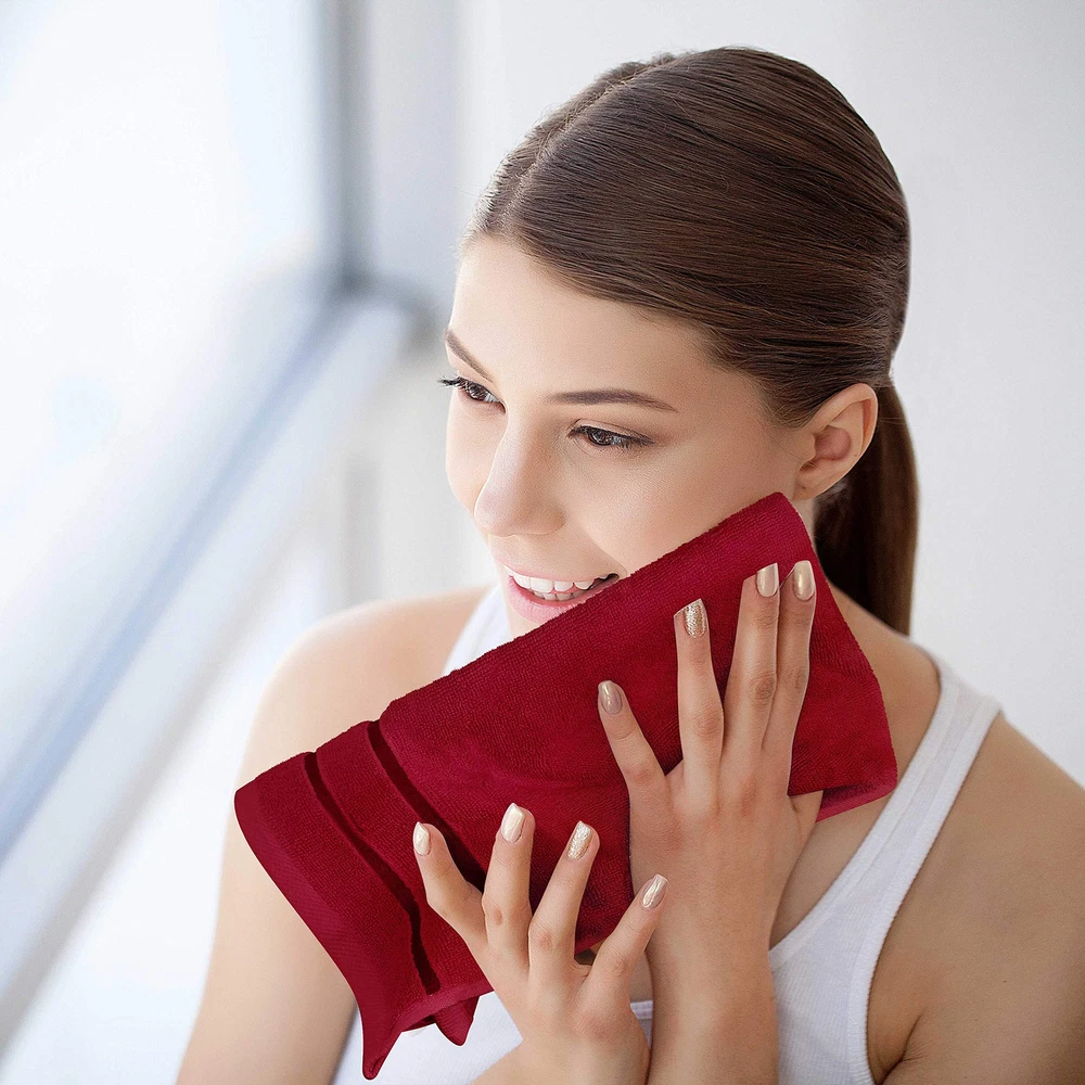 Set of 8 Towels - Includes 2 bath towels, each measuring 27 x 54 inch; 2 hand towels, each measuring 16 x 28 inch and 4 washcloths, each measuring 12 x 12 inch Highly Absorbent Towels - Our 600GSM high density towels are ultra-absorbent and fast drying. Gives your skin a soft and delicate touch while absorbing all traces of moisture efficiently 97% Cotton , 3% Viscose - These luxurious towels are made of 97% cotton & 3% Viscose giving you a super soft feel every time you use them. The surface is smooth and not easy to shed, adding to their durability Elegent Stripe Design - Elegantly designed viscose woven stripes have a brilliant shine and add to the luxurious look of the towels. They are sure to give your bathrooms, spas and kitchen a touch of sophistication Care Instruction - Machine wash the towels in cold water using delicate detergent and tumble dry on low setting; recommended to dry immediately. To prevent unforeseen color discoloration, it is advised, to avoid the removal of the application of any form of cosmetics, facial creams, or scrubs directly with the towel.