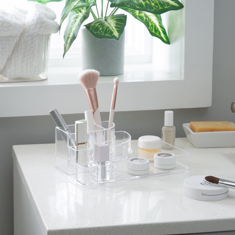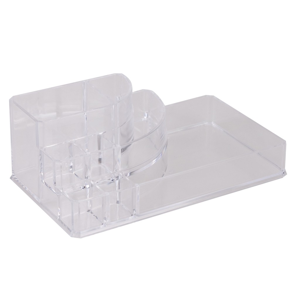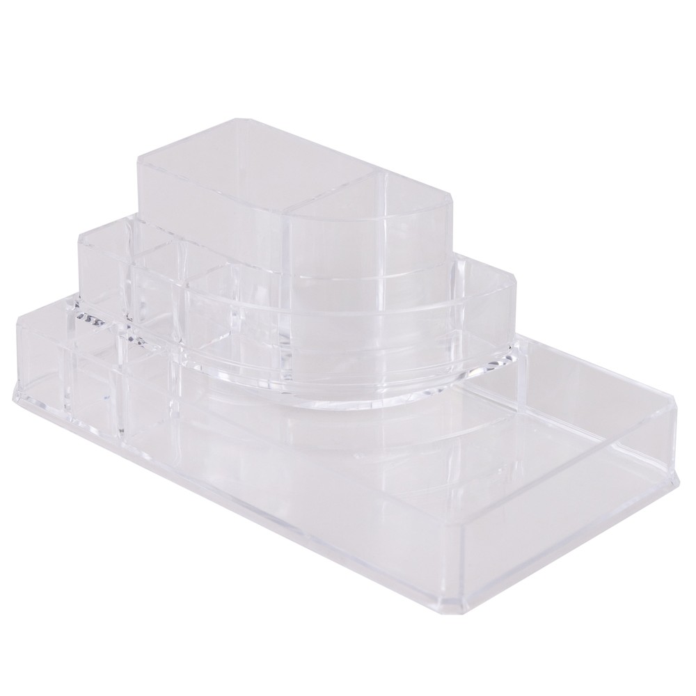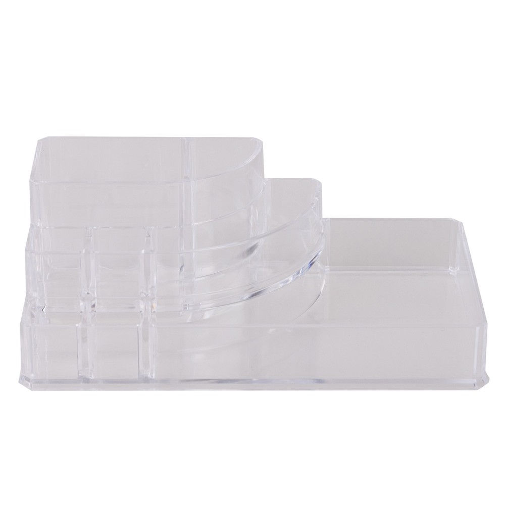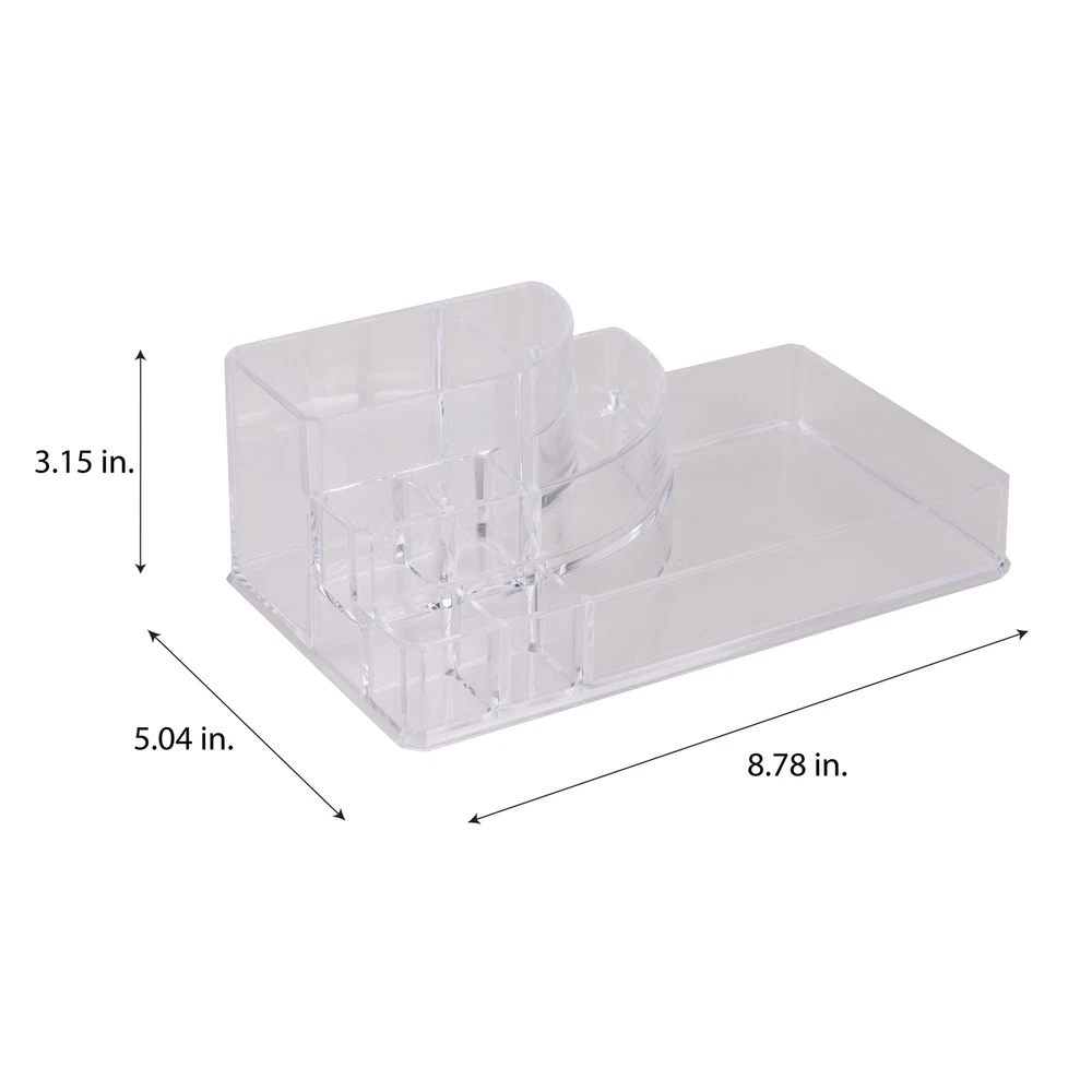 Keep all of your finishing touches in one place with this 8 Section, Quarter Round Cosmetic Holder. This accessory is ideal for a bathroom, vanity or dresser. It will help you get ready quickly when you're on the go. You can keep makeup, rings or earrings easily within reach and organized. This jewelry holder is transparent for your convenience. 8-Section Cosmetic and Jewelry Holder: Made of 100% PS Plastic Lightweight jewelry holder Stacked, see through design Ideal for bathroom, vanity, or dress Great for holding cosmetics, jewelry, and toiletries 8 sections; easily separate all accessories into multiple compartments Clear/see-through for convenience Imported Dimensions: 8.78" x 5.04" x 3.15"