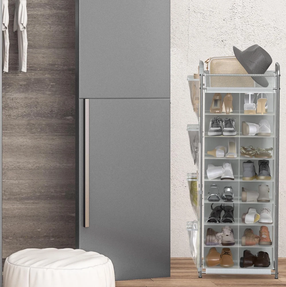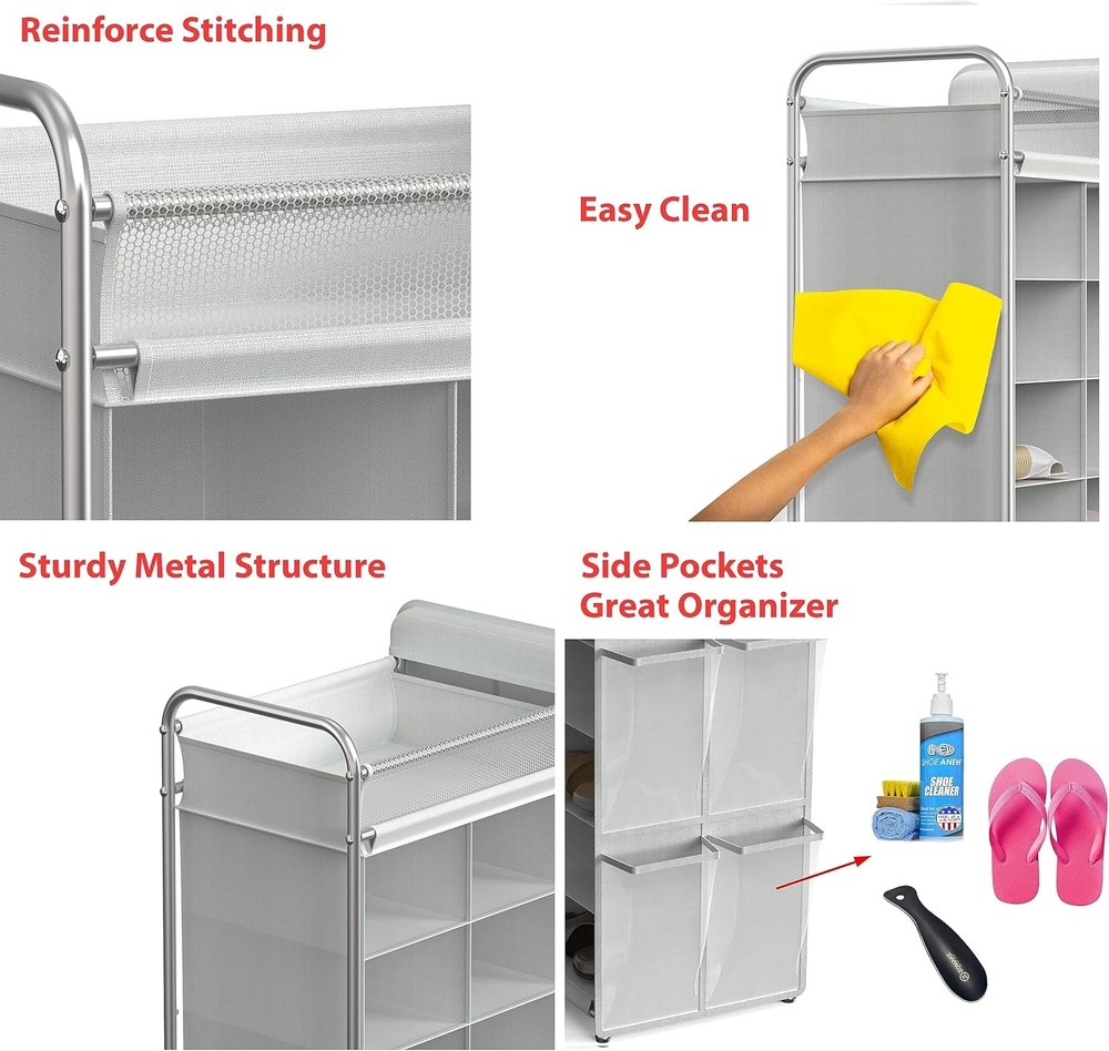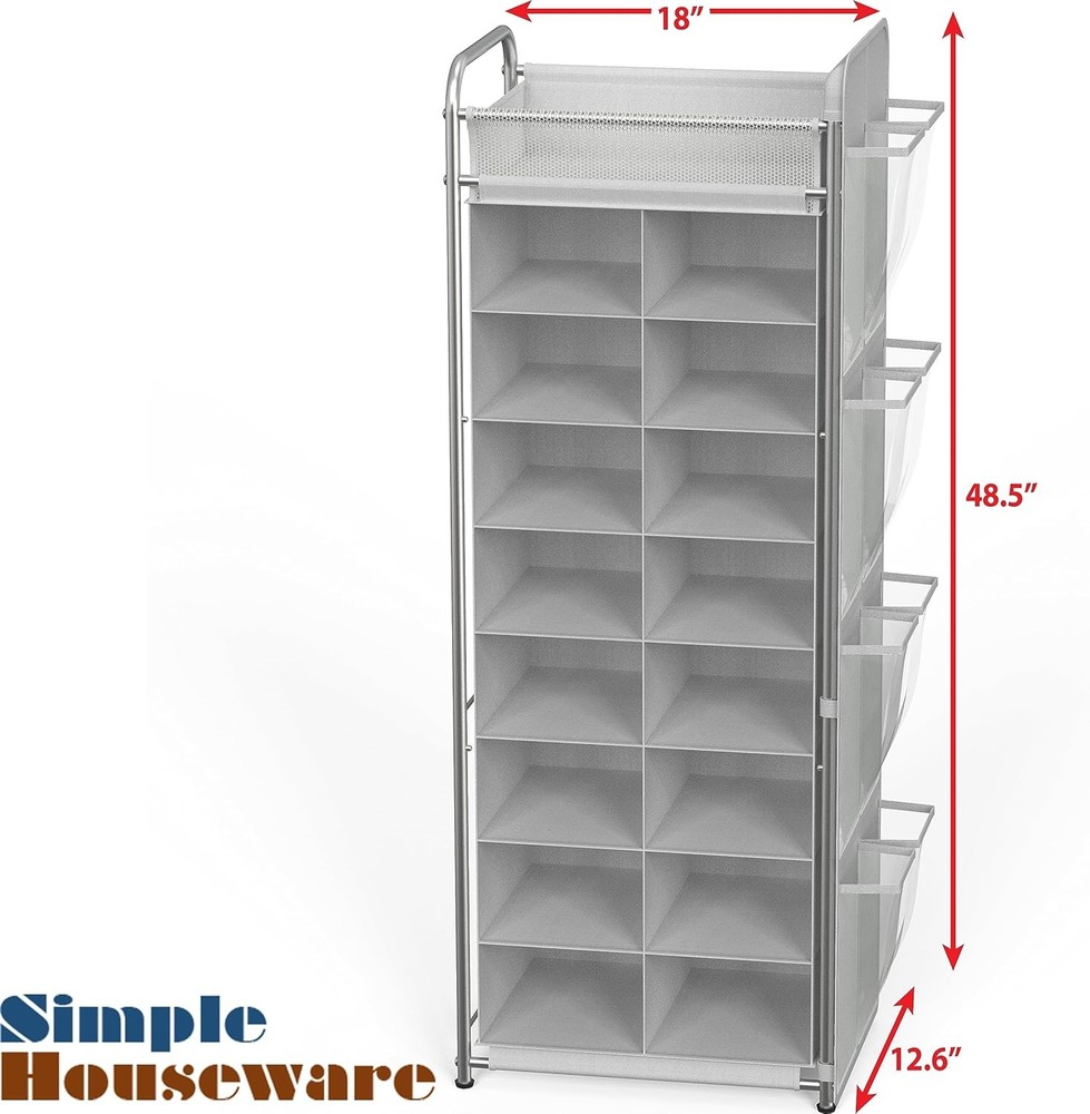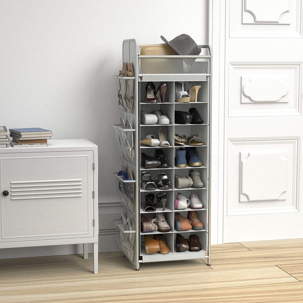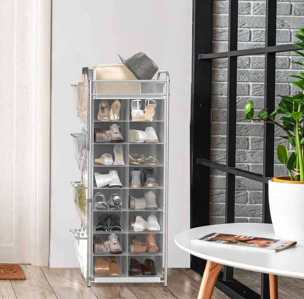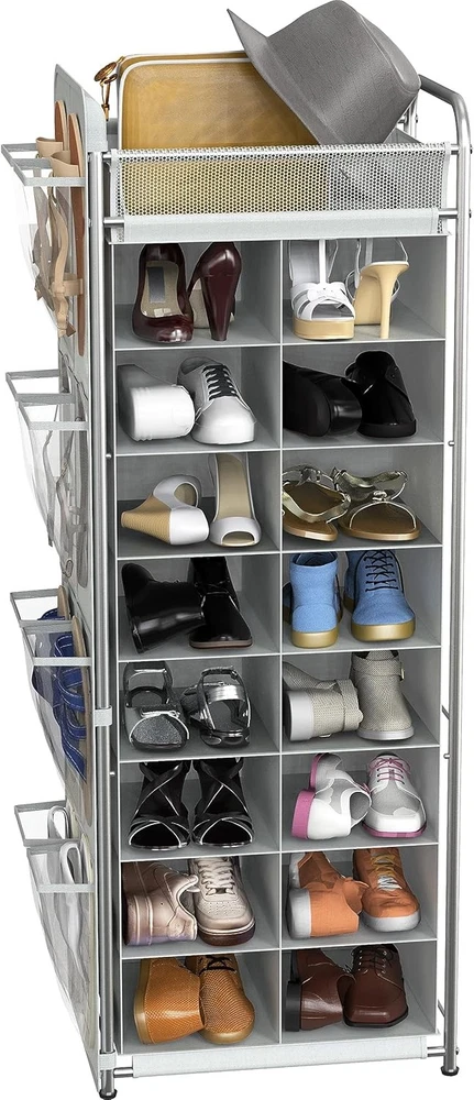 8-Tier Vertical Shoe Tower: Tall and compact (48.5" H x 18" W), ideal for narrow spaces like apartments or dorm rooms. Provides vertical storage without taking up floor space Top Shelf with Front Mesh Visibility: Solid top shelf holds bags, hats or keys. Front mesh panel is see-through and reinforced for added support Sturdy Metal Frame with Patented Support Structure: Built with a durable metal frame and an innovative support design (U.S. Patent D1,078,460 S) that improves stability. Curved side handles make it easy to lift and move 16 Fabric Cubby Slots: Features a sturdy metal frame with 16 reinforced fabric compartments. Each cubby fits one pair of shoes, keeping your collection organized and easy to access. Overall dimensions: 12.6" D x 18" W x 48.5" H 4 Side Pockets for Added Flexibility: Use the clear pockets to store slippers, socks, or small daily items. Keeps grab-and-go essentials within easy reach Modern Look That Fits Anywhere: Clean, neutral design complements various interior styles. Perfect for use in entryways, closets, bedrooms, or even your garage or office