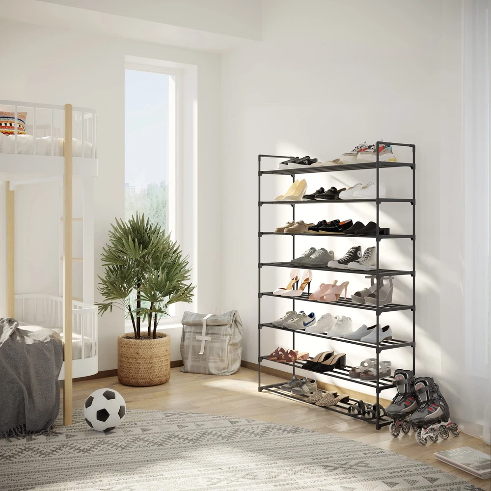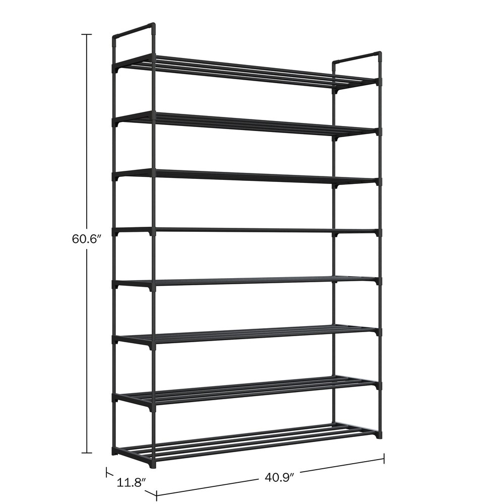 8-TIER SHOE STORAGE - Featuring eight tiers of shoe racks, you will be able to conveniently fit 40 pairs of shoes. Made from a high-quality plastic, this closet shoe organizer is a sturdy and durable option for your home. SPACE SAVING - The shoe rack organizer is both multi-functional and practical, as it provides a compact, space-saving solution for storing your footwear, and can be used to hold other items as well. It’s ideal for any home, apartment, or dorm. USE IN ANY ROOM - This shoe shelf is an excellent option to keep any room of the home neat and clutter free. Use it in your entryway, garage, bedroom, or bathroom. The slatted design of the shoes stand offers ventilation and drainage for your footwear. EASY ASSEMBLY - With no tools required, the shoe rack for entryway is quick and easy to put together, no fuss. Simply fasten the front rails to the side rails of the shoe holder and you are done. PRODUCT DETAILS - Materials: High-Quality Polymer Plastic. Dimensions: (L) 40.9" x (W) 11.8" x (H) 60.6". Dust the Closet Shoe Rack with a Soft Cloth, Duster, or Wipe Clean with a Damp Cloth. Color: Black.