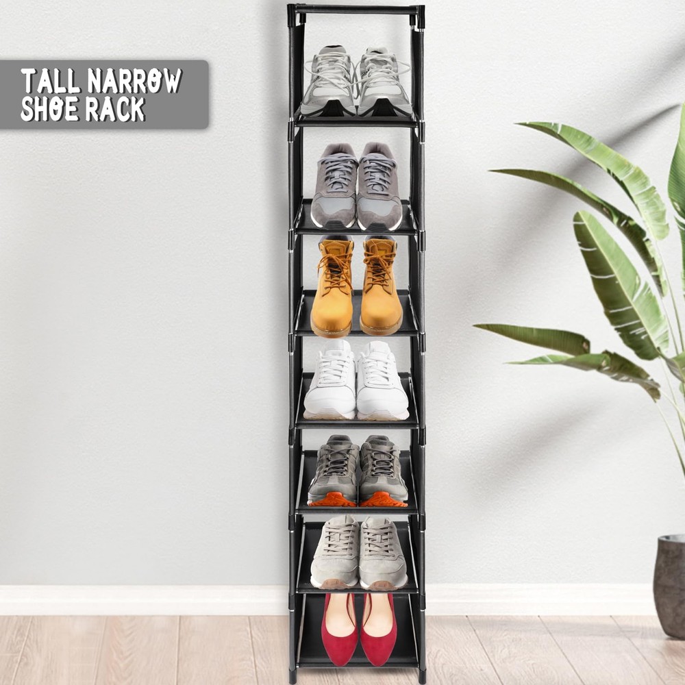 Tall Narrow Shoe Rack for Front Door Entrance Vertical Shoe Rack for Small Spaces Slim Shoe Organizer for Entryway Shoe Tower Skinny Shoe Shelf for Closet Vertical shoe rack: Open shoe rack for your shoes to provide convenient storage, single-layer vertical design, effectively save space. It is ideal for narrow Spaces such as room entrances, wardrobes, dormitories, living rooms and bedrooms Flexible assembly:Our shoe racks are assembled flexibly and can be stacked or placed in a single layer to meet your specific needs. One pair of shoes can be placed on each layer,which helps you to sort different types of shoes Easy installation:The shoe rack is easy to install and easy to disassemble,you can freely assemble and can also be reused. Can store everyday items,such as books,towels,small bags,etc Strong and durable:The shoe frame is composed of high-quality stainless steel pipes and waterproof non-woven fabric,which is stable and durable. The cloth on the side of the shoe rack can prevent shoes from falling,which can better protect your shoes After sale:If you are not satisfied with our products, please feel free to contact us, we will provide you with a solution within 24 hours