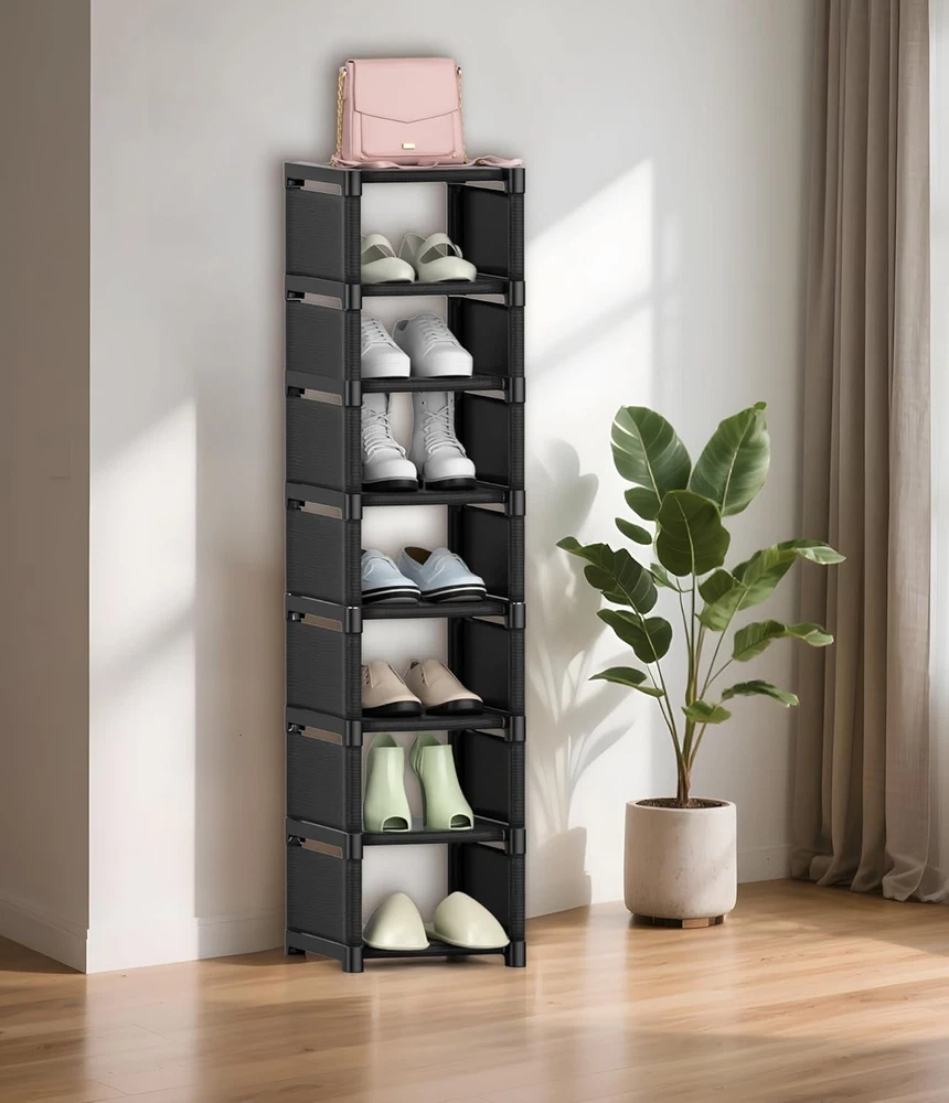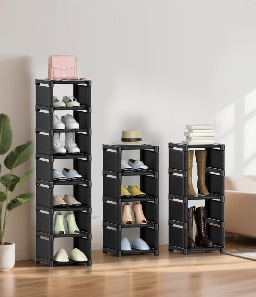 This shoe rack is a total game-changer for my tiny apartment! It fits perfectly in that awkward corner space and holds all my shoes neatly. Love how I can adjust the height for my boots and even split it into two smaller racks. Super sturdy and easy to assemble - definitely recommend for anyone tight on space!