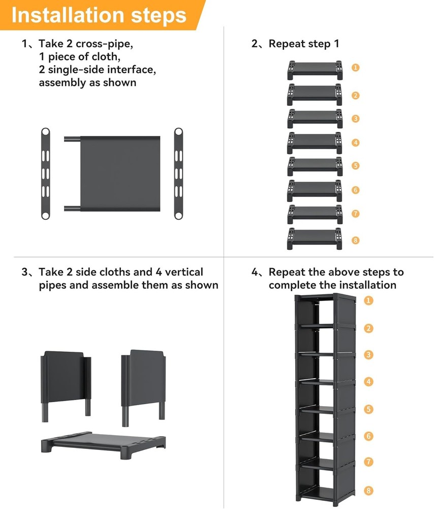 Space Saving Shoe Rack: This narrow shoe rack can maximize vertical space utilization and save floor space.The minimalist frame design makes it easy to move and position in small spaces, fully utilizing compact storage space Flexible Combination: According to the space requirements, it can be vertically stacked into two 4-layer shoe racks, or stacked into one 8-layer shoe rack. You can remove the middle layer to adjust the height, so it can accommodate high boots. You can also DIY a vertical shoe rack according to your own needs Sturdy Material & Dustproof : The tall shoe rack is made of durable non-woven fabric layers, reinforced plastic connectors, and thickened metal tube, with good stability and rust resistance. The Shoe Shelf is easy to clean, w... Happylistings 8-Tier Vertical Shoe Rack Narrow Space Saving Corner Organizer Metal Free Standing Storage Non-Woven Fabric Shelf For Closet Entryway Bedroom Garage-Black Space Saving Shoe Rack: This narrow shoe rack can maximize vertical space utilization and save floor space.The minimalist frame design makes it easy to move and position in small spaces, fully utilizing compact storage space Flexible Combination: According to the space requirements, it can be vertically stacked into two 4-layer shoe racks, or stacked into one 8-layer shoe rack. You can remove the middle layer to adjust the height, so it can accommodate high boots. You can also DIY a vertical shoe rack according to your own needs Sturdy Material & Dustproof : The tall shoe rack is made of durable non-woven fabric layers, reinforced plastic connectors, and thickened metal tube, with good stability and rust resistance. The Shoe Shelf is easy to clean, without letting clutter fall on the shelf below, keeping each shoe clean Multifunctional Shoe Rack: This shoe holder is not only suitable for storing shoes, but can also be used to store handbags, clutter, books, and plants.The compact shoe organizer is perfect for small living spaces such as garages,dormitories,walk-in closets, apartments,balcony,doorway, and living rooms.It simplifies organization, maximizes space, and maintains a tidy environment Easy to Assemble: No tools are required to assemble this shoe rack, just use the provided parts to assemble it by hand. Simply thread the tubes through the non-woven fabric layers, and then insert them into the plastic connectors. Once you assemble these components vertically, you are done Item Specifics Brand Unbranded Type Free Standing Shoe Racks Color Shoerack-black Room Type Entryway, Bedroom, Living Room Number of Shelves 8 Special Feature Sturdy, Durable, Easy Assembly Product Dimensions 9.84"D x 18"W x 33.46"H Style Modern Finish Type Stainless Steel Size 8-Tier Assembly Required Yes Recommended Uses For Product Shoes Item Weight 1.78 Pounds Furniture Finish Metal Tube, Plastic Connector Installation Type Freestanding Item Weight 1.78 pounds #414,948 in Home & Kitchen (See Top 100 in Home & Kitchen) #414,948 in Contact Us 1.Dear customers, we appreciate your business, our aim is to provide Top Level Customer Service,if you are satisfied with our service, please leave us a 5 star positive feedback . 2.If you have any question or concern about your eBay order, please feel free to let us know. We will try our best to reply all questions within 24 hours. However, no answer will be replied during weekends or holidays. Please allow up to 48 hours delay in receiving our response after long weekends or holidays. 3.Please via eBay Message for a solution for resolutions before leaving negative feedback, we strive to providing the greatest service and bringing the highest satisfaction to all of our customers. Shipping 1.We usually ship within 3-5 business days of receiving cleared payment., and we provide Free Shipping for most items. 2.Fast shipping is very important for us. We use multiple fulfilment warehouse around the United States. We only ship to the lower 48 States and do not ship to PO Boxes. 3.Please make sure the correct Ship-To address is entered before checking out. Once the payment is completed, you may not be able to change the shipping address. We shall not be held responsible for any wrong or undeliverable addresses. Returns 1.We provide 14 days return upon the buyer received the item. It must be in good condition and you will undertake the returned shipping cost. 2.We will offer replacement or refund for all DEFECTIVE items (not including damage resulting from accidents / abuse / misuse / improper care), but a photo is needed for our reference beforehand and should be reported to us within 7 days from purchase date. 3.All items are brand new and have been passed the quality check. All are packed in a good condition before item dispatch. Payment We accept PayPal payment,PayPal Credit,Credit card or debit card and so on. Payment should be completed within 4 (Four) days of auction closing. Or unpaid dispute will be filed for closing auction. We will leave a positive feedback immediately after payment is received. We appreciate a positive feedback as much as you do. If for some reason there is any issue with the purchase, please contact us prior to leaving feedback, we will be glad to work together and provide a satisfying solution. Happylistings DESCRIPTION PAYMENT SHIPPING RETURN POLICY CONTACT US Help & Info Payment Policy Shipping Policy Return Policy FAQ About Us 8-Tier Vertical Shoe Rack Narrow Space Saving Corner Organizer Metal Free Standing Storage Non-Woven Fabric Shelf For Closet Entryway Bedroom Garage-Black Space Saving Shoe Rack: This narrow shoe rack can maximize vertical space utilization and save floor space.The minimalist frame design makes it easy to move and position in small spaces, fully utilizing compact storage space Flexible Combination: According to the space requirements, it can be vertically stacked into two 4-layer shoe racks, or stacked into one 8-layer shoe rack. You can remove the middle layer to adjust the height, so it can accommodate high