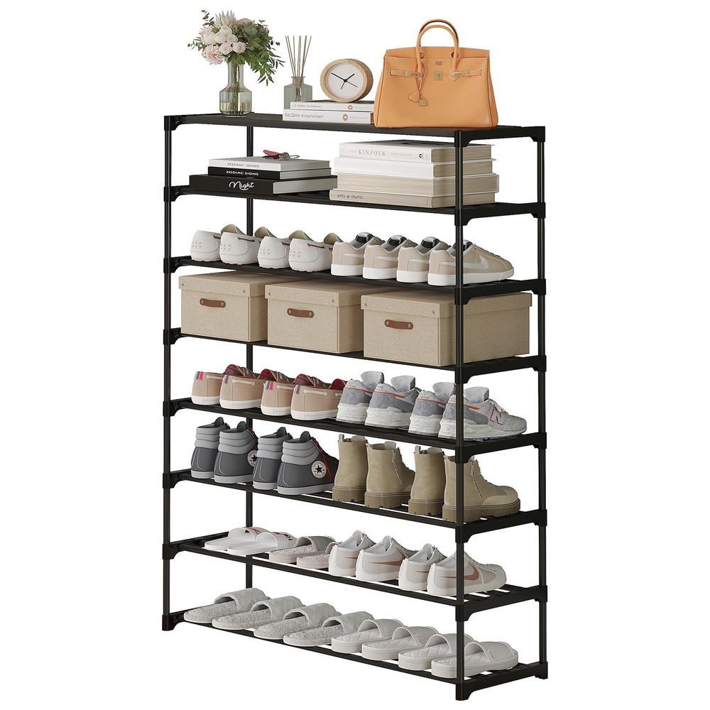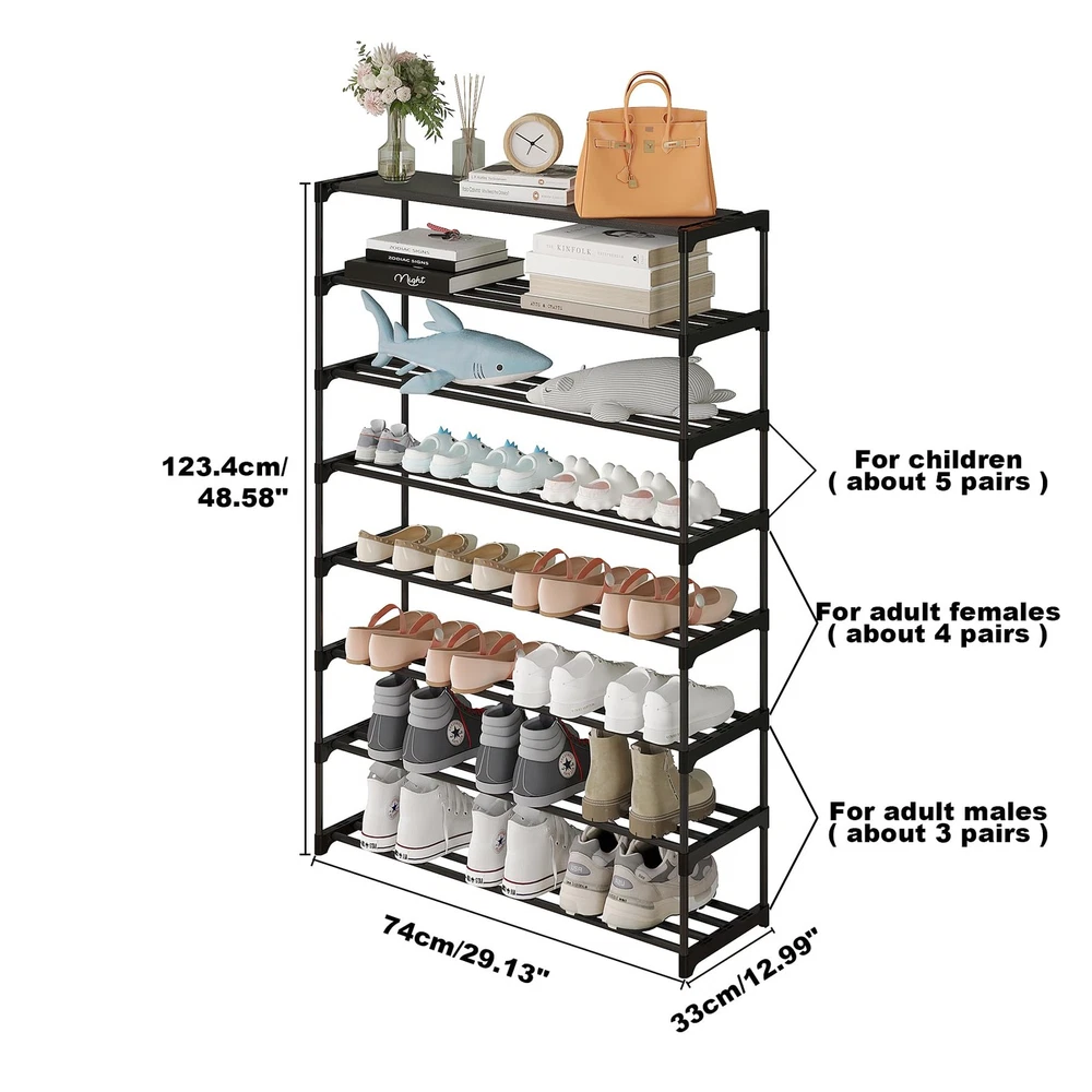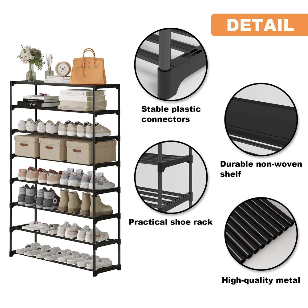 [ Stackable Shoe Rack] 8 tier shoe rack organizer for different spaces of the bedroom, entryway and garage. The shoe rack has a clean and simple design that not only provides ample shoes storage space also decorates your home corner. [Practical & Stable] Each shelf can hold 3 pairs of adult male shoes, or 4 pairs of adult female shoes, or even 5 to 6 pairs of children's shoes. The non-woven top shelf can hold lightweight items such as handbags, umbrellas or dolls. Fully meet the daily needs of a family. [Adjustable Shelf ] The height of each tier of this shoe rack can be adjusted to your personal preference. Metal shoe racks after stacking can disassemble one shelf to provide adequate storage space for taller boots. [High-quality Materials] Equipped with high-quality plastic connectors and a thickened metal frame, this shoe rack is more stable and sturdy than ordinary plastic shoe racks. The metal rods are painted, not easy to oxidize and firm. [Tips for Use] Install the shoes rack in minutes! We are equipped with the corresponding installation instructions, labeled pieces. For a more stable shoe rack, our recommendation is that you follow the principle of heavy weight below and light weight above.