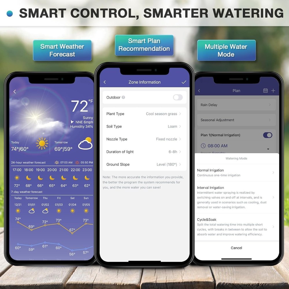 8 Zone Smart Sprinkler Controller with Local Weather Intelligence and Atmosphere Lights, Automated Watering and App Control WiFi Irrigation System, Save Water Through Rain Skip (Y#0335) About this item Smart Irrigation with Weather Integration: Pihode smart sprinkler controller delivers intelligent watering plans customized to your garden’s unique requirements. By entering basic regional information, the sprinkler controller system generates optimized schedules for watering duration and frequency. Integrated weather prediction technology automatically skips irrigation during rainfall, ensuring efficient water usage and healthier plants through precision care. Dual Control & Reliable Connectivity: Pihode sprinkler controller lets you manage your irrigation system effortlessly through two intuitive methods: use the durable built-in control panel for instant adjustments, or access advanced scheduling remotely via the user-friendly app. Designed for seamless 2.4GHz Wi-Fi compatibility, This wifi sprinkler controller maintains stable connectivity for uninterrupted control. Enhance convenience with hands-free voice commands through Alexa and Google Home integration, perfect for busy lifestyles. Versatile Irrigation Modes: Choose from three specialized watering modes: Normal Irrigation: Consistent daily watering for uniform coverage. Interval Irrigation: Customize schedules by date parity (odd/even days), specific intervals, or personalized timelines. Cycle & Soak: Ideal for slopes and dense soils, alternating watering phases to prevent runoff and maximize absorption. 15-Minute DIY Installation: Activate smart irrigation in three straightforward steps—mount the irrigation controller, connect to Wi-Fi, and configure zones through the app. No specialized tools or technical expertise required, allowing immediate setup and hassle-free operation. Reliable Performance and Support: Benefit from continuous software updates that enhance system functionality and security. Our 24/7 U.S.-based expert support team provides immediate assistance in English, ensuring quick resolution for any technical issues. Rest assured your irrigation system stays operational through every season with professional guidance just one call away.