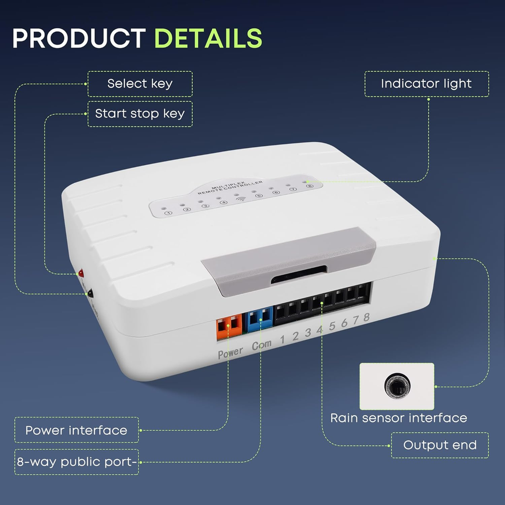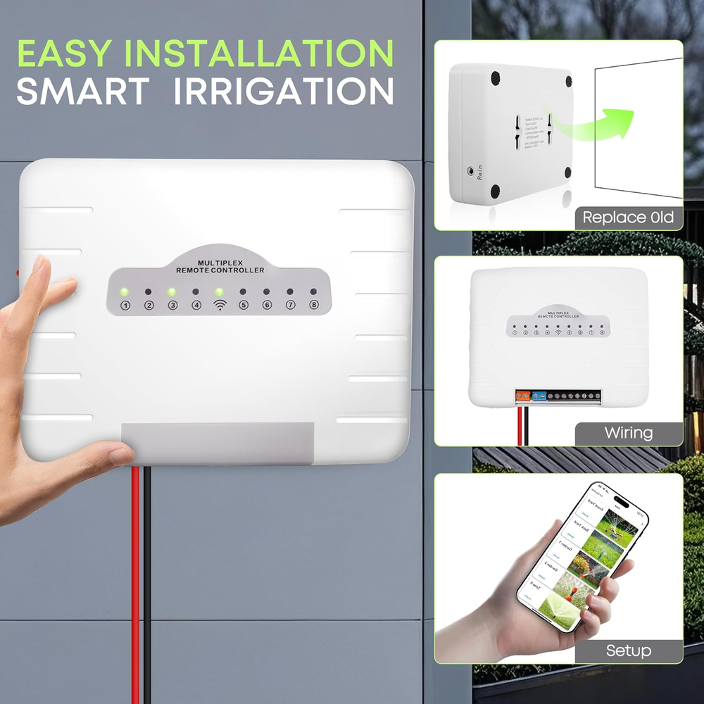 Universal Compatibility: This smart sprinkler controller operates on a standard 24VAC specification, ensuring compatibility with 99% of sprinkler systems. No need to worry about compatibility issues—just set it up and enjoy seamless integration with your existing system. Intelligent Watering with Weather Awareness: The controller utilizes local weather intelligence to automatically skip watering during rain or freezing conditions. You can ensure optimal watering while conserving water and keeping your yard healthy. Remote Control at Your Fingertips: Manage your watering schedule effortlessly from anywhere using the accompanying app, designed for 2.4GHz WiFi connectivity. Whether you’re at work or on vacation, stay connected and in control. Share access with family members for collaborative landscape management and easily track irrigation schedules and history. Customized Scheduling Flexibility: Create up to eight tailored watering schedules for each zone, adjusting run times, start times, and cycle frequency to meet your lawn's specific needs. Need an immediate watering boost? Use the Quick Run feature in the app without disrupting your existing plans. Hassle-Free Installation & Reliable Operation: Set up your irrigation controller in just 15-30 minutes without the need for special tools, thanks to the included installation parts and unique snap wire design for organized cord management. Plus, it retains programming during power outages and resumes automatically, ensuring that your watering schedule stays on track even without WiFi connectivity. Product Description