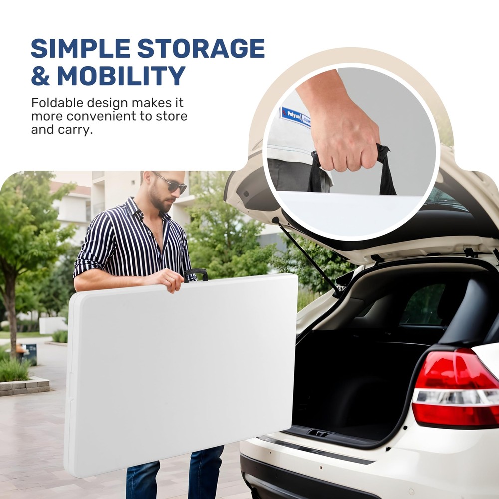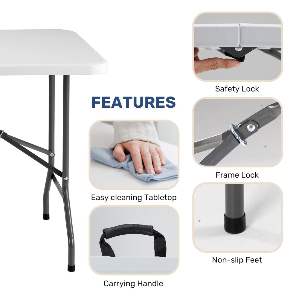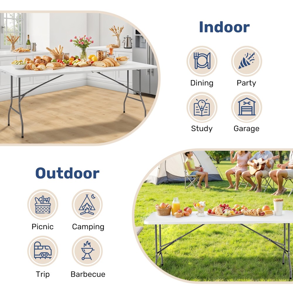 About this item Multi-Purpose Functionality: This versatile table transitions seamlessly between indoor dining or gaming and outdoor events like weddings, camping, or picnics Stable Construction: With a durable frame lock structure and anti-slip coated legs, this table offers exceptional stability and supports up to 300 lbs Convenient & Portable Design: Designed for fast setup and compact folding, this table includes a built-in carrying handle for easy transport and storage. Perfect for camping, picnics, and parties Easy-to-Clean: Made from water-resistant HDPE, the table’s surface is abrasion-resistant and easy to clean Space-Saving & Pre-Assembled: No tools required! Simply unfold the table and attach the legs. When not in use, fold it up for compact storage and space saving. Dimension: 94.49"D x 29.92"W x 29.13"H/ 47.24"D x 29.92"H (Folded)