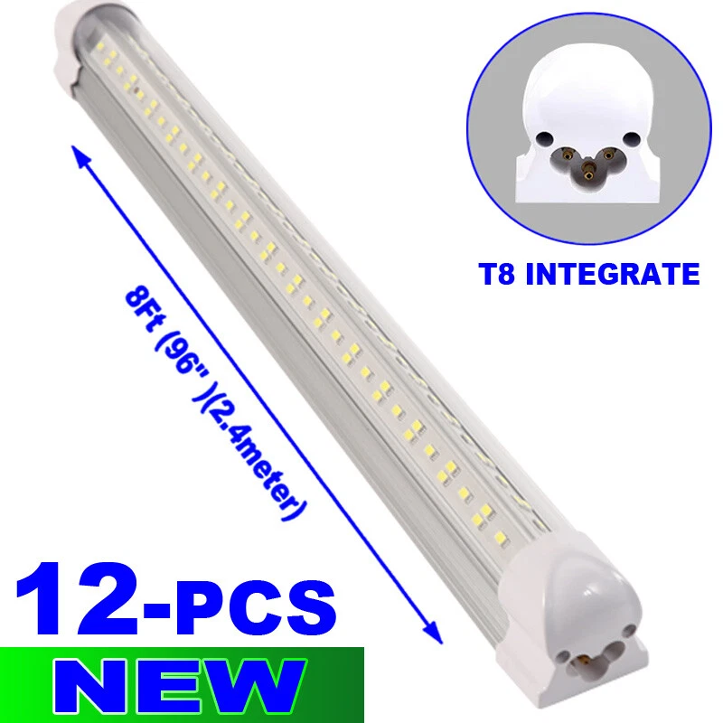 FAST DELIVERY - Ship from New Jersey or Los Angeles Warehouse via FedEx , 3-7 Days Delivered Your Door . SCIENTIFIC DESIGN - 8Ft LED Shop Lights Fixture is Made of 6500K Cold White SMD2835 LED Chip ,Plastic Clear Cover , Aluminum Bracket Housing ,and AC85-277V Constant Current Driver . It can work in -68F to 120F Temperature Conditions EASY INSTALLATION - The Integrated Tube Fixture Can be Install on Wall or Ceiling ,Easily Replace Traditional Fluorescent Tube Bulb . Plug and Play , Free Accessories (Power Cords, Connector , Extension Cords , Clip and Screw ) Come with Tube Lights Together WIDE APPLICATION - Linkable 8Ft Bulbs Widely Used in Garage Ceiling , Barbershop , Schools, Hospitals Basement , Factory Warehouses , Supermarkets Cooler Door , Offices, Shops,Hotels, etc 8ft Integrated Led Shop Lights 144W 6500K Tube Clear Cover 12PC 18000 Lumens FAST DELIVERY - Ship from New Jersey or Los Angeles Warehouse via FedEx , 3-7 Days Delivered Your Door . SCIENTIFIC DESIGN - 8Ft LED Shop Lights Fixture is Made of 6500K Cold White SMD2835 LED Chip ,Plastic Clear Cover , Aluminum Bracket Housing ,and AC85-277V Constant Current Driver . It can work in -68F to 120F Temperature Conditions EASY INSTALLATION - The Integrated Tube Fixture Can be Install on Wall or Ceiling ,Easily Replace Traditional Fluorescent Tube Bulb . Plug and Play , Free Accessories (Power Cords, Connector , Extension Cords , Clip and Screw ) Come with Tube Lights Together WIDE APPLICATION - Linkable 8Ft Bulbs Widely Used in Garage Ceiling , Barbershop , Schools, Hospitals Basement , Factory Warehouses , Supermarkets Cooler Door , Offices, Shops,Hotels, etc