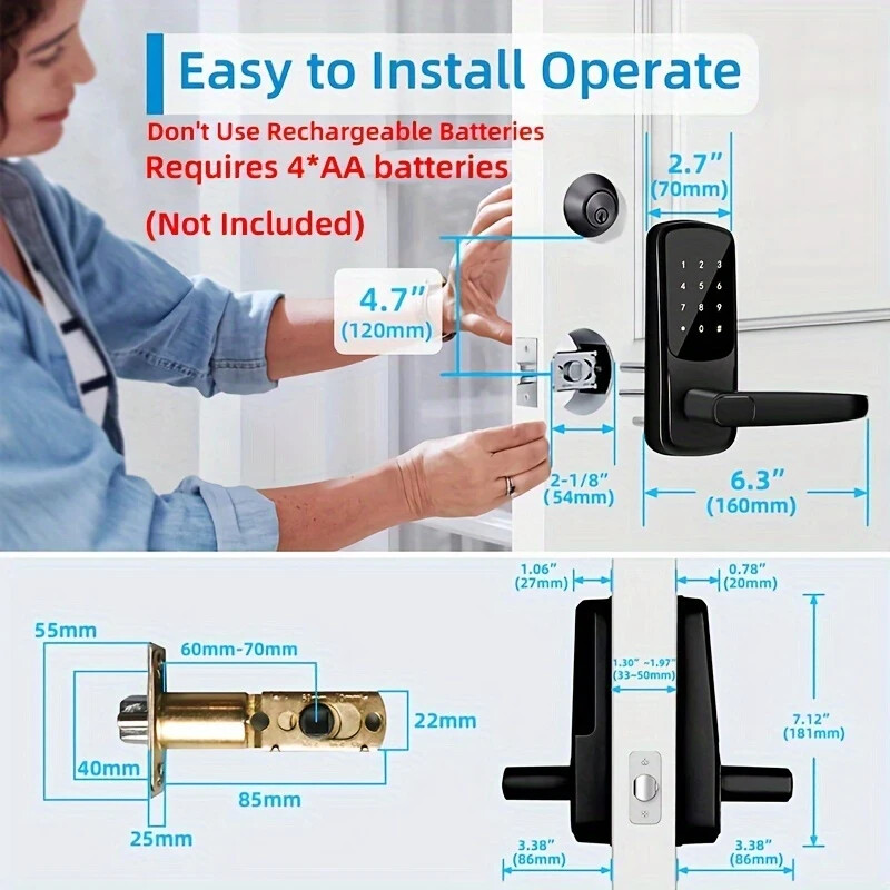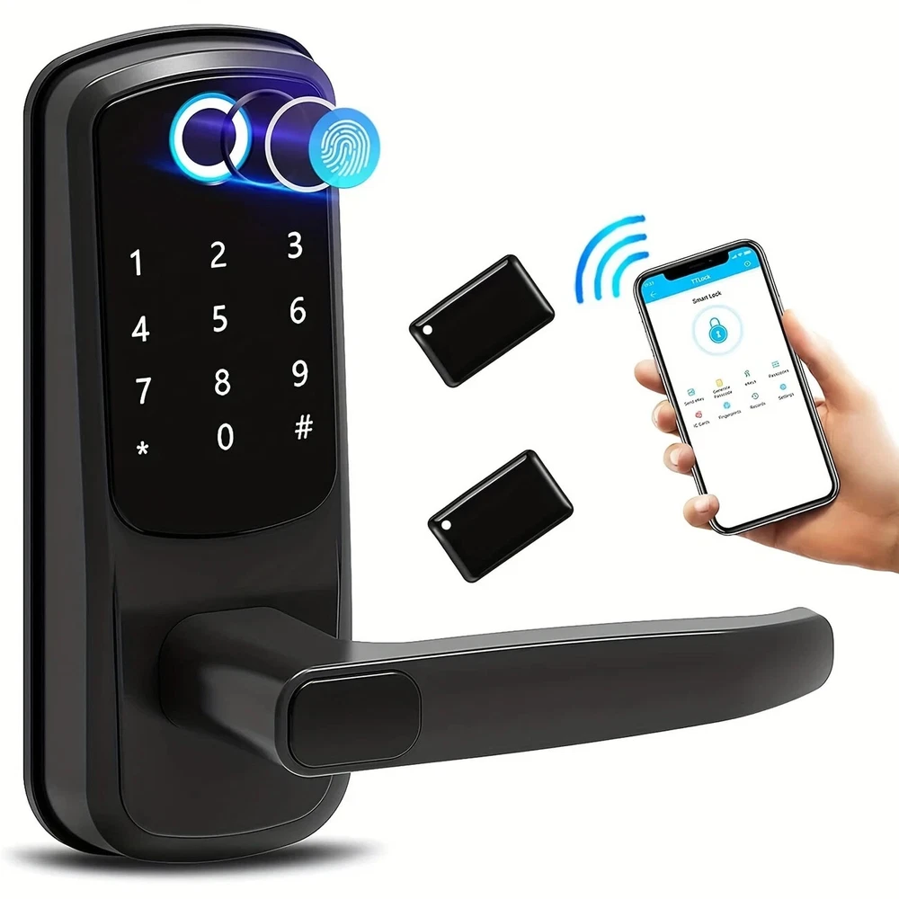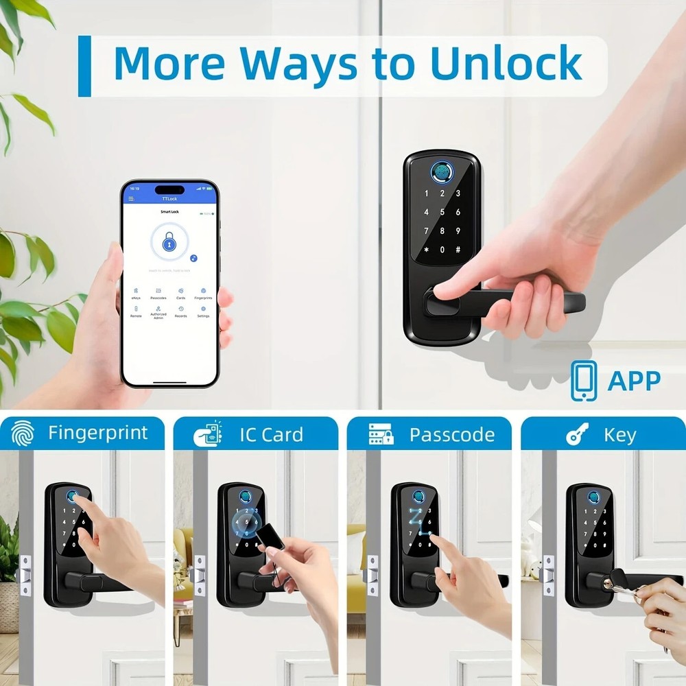 🌟 8-in-1 Smart Keyless Entry Door Lock 🌟 🔒 Advanced Multi-Access Security Solution Upgrade your home security with this 8-in-1 smart keyless entry door lock featuring multiple unlocking options: Fingerprint, Keypad Code, IC Card, E-Key Sharing, Auto Unlock, Mechanical Keys, App Control, and Voice Control . Never worry about being locked out again, as this system provides a secure and convenient access solution for families, guests, and rental properties. 🏠 Ideal for Homeowners & Rental Hosts Manage your keyless smart lock with ease using a mobile app, allowing remote control from anywhere. Perfect for homes, hotels, apartments, and offices , this smart lock enables property owners and short-term rental hosts to generate and share passcodes, track real-time access logs, and grant or revoke access at any time—saving time and enhancing security. ⚡ Fast & Secure 360° Fingerprint Recognition Equipped with an advanced biometric fingerprint sensor, this door lock quickly identifies fingerprints in 0.3 seconds and unlocks in just one second —faster than using a traditional key. The auto-lock feature ensures added security by automatically locking the door after a set time, providing peace of mind. 📱 Remote & Voice Control Capabilities Pair the lock with a WiFi gateway (sold separately) to enable remote access and voice control. Seamlessly integrate with Amazon Alexa or Google Assistant to unlock the door with simple voice commands. Share temporary, scheduled, or permanent access with family, friends, or guests—perfect for busy households or rental property management. 🛠️ Easy DIY Installation & Universal Fit Designed for quick installation with just a screwdriver, this smart lock requires no wiring or drilling, making it an easy upgrade for any standard door. The reversible handle ensures compatibility with both left and right-handed doors. The durable weather-resistant design ensures reliable performance in various conditions. 📋 Specifications & Inclusions: Material: High-quality zinc alloy with a brushed nickel finish Lock Type: Biometric, Keypad, Combination Lock Control Methods: App, Fingerprint, Passcode, Mechanical Key, IC Card, Remote, Voice Connectivity: Bluetooth (WiFi control requires a separate gateway) Recommended Use: Residential, Hospitality, and Rental Properties Dimensions: 1.06 x 3.38 x 7.12 inches | Weight: 3.58 lbs Package Includes: Smart Door Lock, Mounting Plate, Rubber Gasket, Face Plate, Back Plate, Bolt Assembly, Screws, Latch & Strike, 2 Handles, 2 Keys, 2 IC Cards, and an English Manual Note: A power source (batteries or power supply) is required but not included. ✨ Upgrade to a High-Tech Keyless Smart Lock Today! ✨