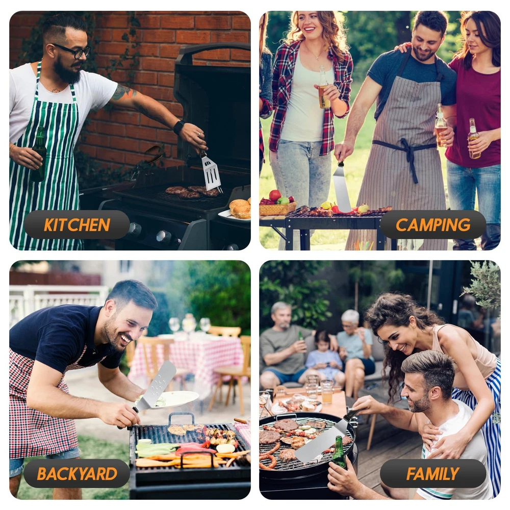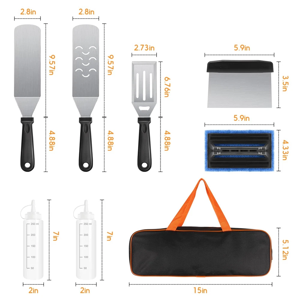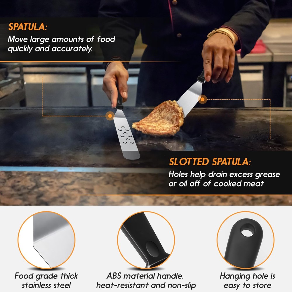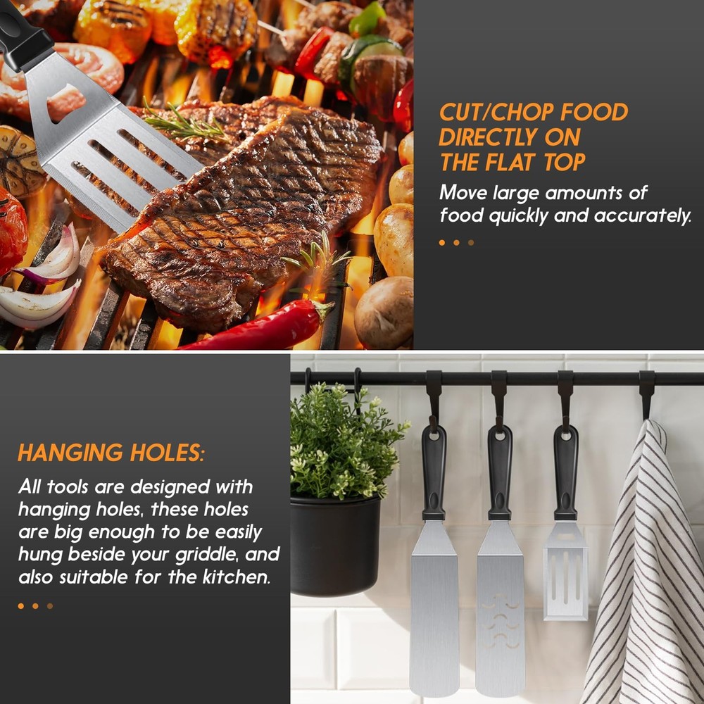 blackstone kit blackstone tools blackstone accessories kit blackstone griddle kit blackstone grilling accessories blackstone spatula set griddle tool kit griddle spatula set griddle utensils blackstone grills accessories flat top griddle accessories blackstone squeeze bottles outdoor griddle accessories blackstone griddle tools griddle tool set blackstone griddle spatula Premium Stainless Steel: Griddle accessories are made with stronger and thicker stainless steel. Heat-resistant and non-slip, the handle of the abs provides a comfortable grip, with hanging holes for easy storage. you can easily enjoy your grilling, camping, or cooking without worrying about your tools bending, breaking, or rusting again. Blackstone griddle accessories are dishwasher safe for quick and easy BBQ clean-up. Multipurpose Blackstone accessories kit: 2 Oversized griddle spatulas, great for flipping beef cubes, fried egg, rice, noodle, and vegetables. 1 Regular-size grill flippers/turners (can be used as a shorter spatula) with 3-sided bevel cutting edge, great for turning burgers, and pancakes and cutting bread, meat, and sausage. Must-Have Griddle Accessories: Blackstone accessories kit include 1 chopper/ scraper to dice food and scrape griddles clean. 2 squeeze bottles for liquids oil, 1 Cleaning Brush, and 1 storage bag. Blackstone accessories will please everyone at your BBQ, weekend party, or your everyday meals. Perfect Gift Choice: Beautifully designed gift box with quality packaging, which is an ideal gift choice for Father's Day, Thanksgiving, or Christmas. These practical Blackstone accessories are for most grills and are suitable for indoor and outdoor cooking. It can meet all the essentials of your daily backyard barbecue and camping activities. Whether you are in the kitchen, your backyard, or out camping. You can enjoy BBQ time with your family and friend easily. Satisfaction Customer Service: We stand by our Griddle Accessories Kit with our outstanding customer service, we aim to satisfy purchases for every customer. If you ever have a problem, please feel free to contact our customer service, we will reply within 24 hours and help you solve the problem.