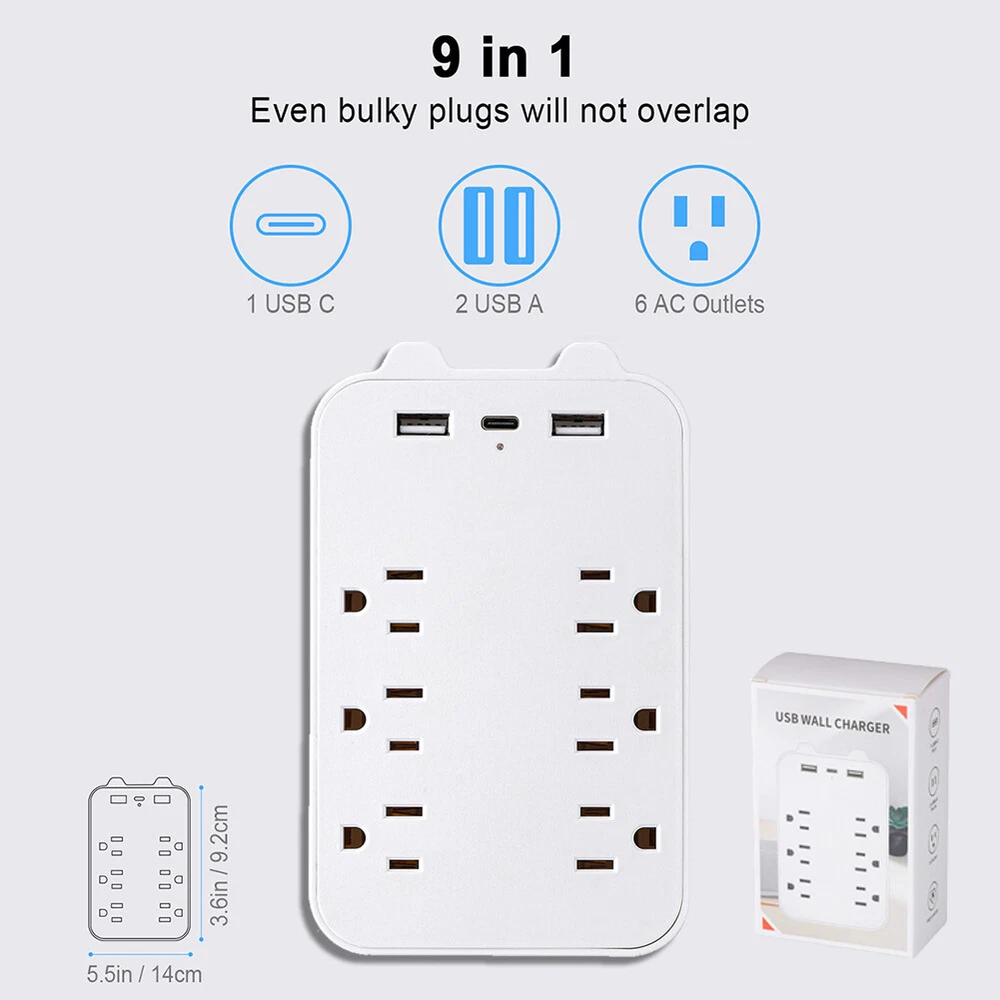 9 In 1 Surge Protector 6-Outlet Extender With USB & 1 USB-C Ports Multi Plug Product Description 6-Outlet Wall-Mounted Power Strip with USB and Type-C Ports : Expand your charging capabilities with this versatile power strip, featuring a modern white finish to complement any home or office decor. Key Features Ample Outlets : 6 standard American outlets for connecting multiple devices simultaneously. Advanced Charging : Includes 2 USB ports and 1 Type-C port for quick charging of smartphones, tablets, and other USB-powered devices. Efficient Power Delivery : USB and Type-C ports offer a total output of 5V 2.4A, ensuring fast and efficient charging. Compliant Design : Meets American electrical standards with an input voltage of AC100-130V, 50-60Hz, and a rated voltage and current of AC125V 10A, supporting a maximum output power of 1300W. Durable Build : Constructed from high-quality ABS material with a sleek white finish, and copper conductors for excellent conductivity and long-lasting performance. Specifications Number of Outlets : 6 American Standard Outlets USB Ports : 2 USB Ports Type-C Port : 1 Type-C Port Input Voltage : AC100-130V, 50-60Hz Rated Voltage/Current : AC125V 10A Maximum Output Power : 1300W USB/Type-C Total Output : 5V 2.4A Material : ABS with Copper Conductors Color : White Product Dimensions : 14.5cm x 9.2cm x 3cm Net Weight : 150g Indicator : Blue LED Light for Power Status Convenient Design Compact Size : Dimensions of 14.5cm x 9.2cm x 3cm and a weight of 150g, allowing for easy wall mounting and space-saving design. Indicator Light : A blue LED light indicates when the power strip is active, providing a visual confirmation that your devices are powered. Package Contents 1 x 6-Outlet Wall-Mounted Power Strip (White) Payment Shipping & Handling Returns Policy Contact US Feedback Payment Shipping will be arranged only your payment is cleared. We accept payment by PayPal only . All orders before 1pm(CST) will be shipped in the same day No shipping on Saturday,Sunday or Public Holidays & No responsibility for any customs duty. Shipping & Handling We ship the same business day if paid by 4pm EST(1pm PDT). No shipping on Weekend or Public Holidays & No responsibility for any customs duty. Returns Policy We offer a 60 day money back guarantee or exchange. Buyer pays return shipping and we pay replacement shipping. If you want to initiate a return ,please contact us to get a returning address before sending the item back. Contact US We hope that every transaction can have a happy ending. And if you have any more problems, please feel freeeee to contact us. we'll do what we can to help. Feedback We believe communication can result in a happier ending before you leave a red or gray feedback. And this account is my baby. I do care about it and will do what I can to protect it.