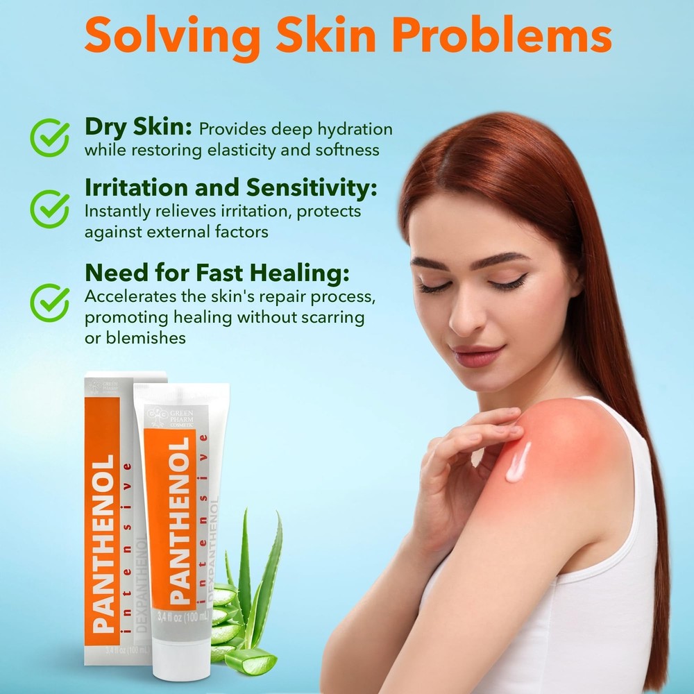 9% Intensive Panthenol Cream with Aloe Vera & Hyaluronic Acid | Deep Moisturizing, After Sun & Tattoo Care, Hair Transplant for All Skin Types, 3.4 Oz/ 100 ml - Buy Now with Fast Shipping! 9% Intensive Panthenol Cream with Aloe Vera & Hyaluronic Acid | Deep Moisturizing, After Sun & Tattoo Care, Hair Transplant for All Skin Types, 3.4 Oz/ 100 ml Product Details Brand: GPC GREEN PHARM COSMETIC Item Volume: 100 Milliliters Item dimensions L x W x H: 2.76 x 1.57 x 1.57 inches Age Range (Description): Adult Special Feature: Aromatherapy Product Dimensions : 2.76 x 1.57 x 1.57 inches; 3.53 ounces Manufacturer : GPC GREEN PHARM COSMETIC Country of Origin : Ukraine Key Features ✅ HYDRATION: 9% Panthenol with Hyaluronic Acid - Immediately soothes irritated skin, intensive moisturizing for dehydrated, sensitive skin. Ideal for daily hydration and skin recovery. Suitable for all skin types, including sensitive. Has a cooling moisturizing effect on the skin after sun exposure. ✅ WOUND CARE: Strong calming effect for Sensitive Skin / Dehydrated Skin. D-panthenol cream soothes skin in case of thermal burns. Vitamin B cream for face acts as softening, soothing moisturizer. ✅ TATTOO AFTERCARE: Protects & Maintains - Ensures healthy skin recovery after tattoo procedures, maintaining ink clarity and skin hydration. ✅ BABY CARE:Safe and gentle formula for baby's skin, effectively soothing and treating and sensitive skin conditions. ✅ AFTER-SUN CARE: Soothing Panthenol Instantly calms sun-exposed skin with a cooling effect, deeply hydrates, and supports natural skin recovery for a refreshed, healthy glow. Product Description