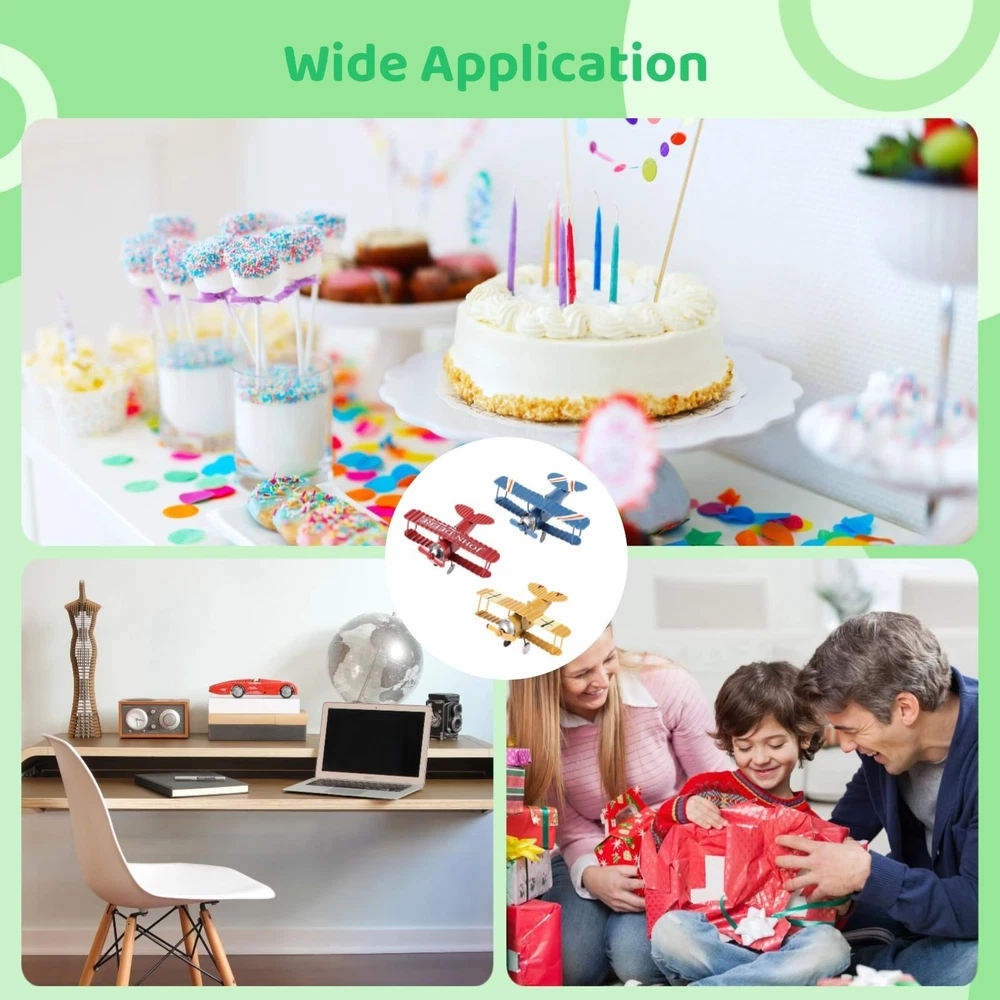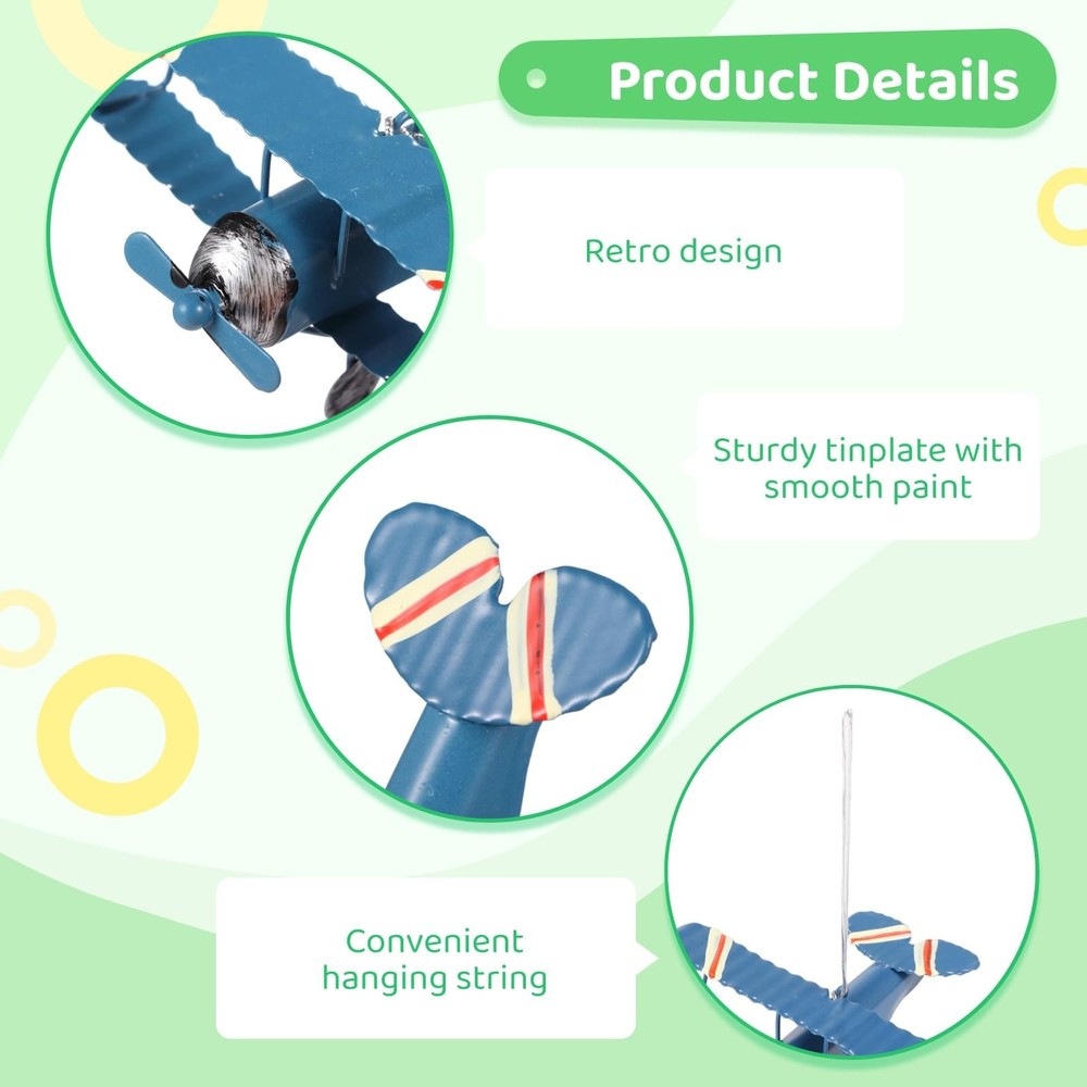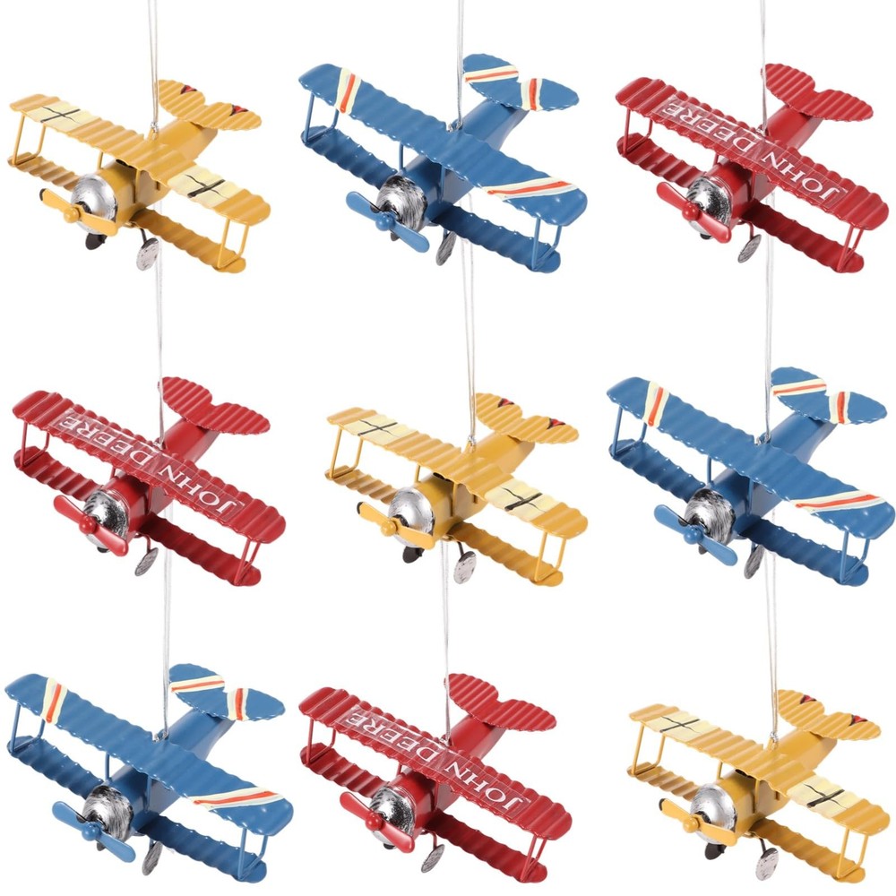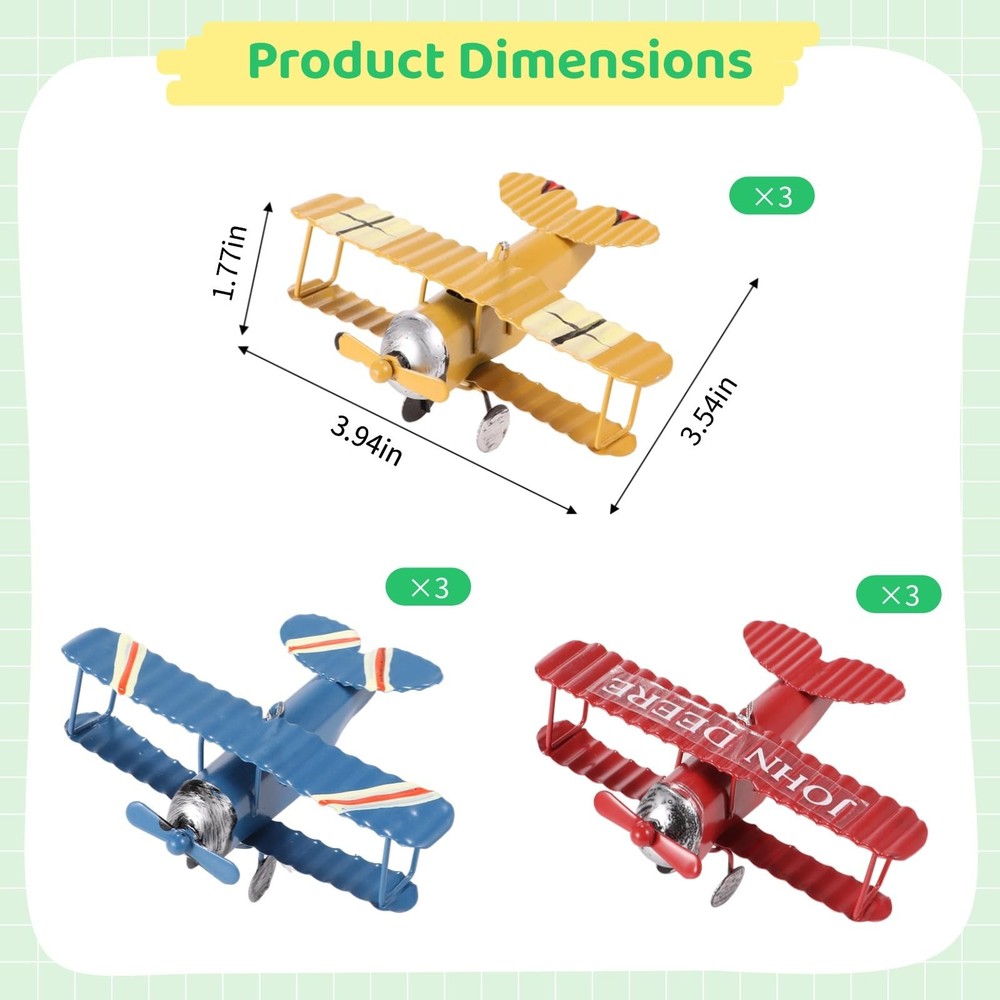 Metal Airplane Decorations 【Colorful Vintage Airplane Set】This set includes 9 intricately crafted vintage airplane models in vibrant red, yellow, and blue, 3 in each color, enough for your daily decoration needs. These models capture the essence of early aviation days, perfect for adding a nostalgic touch to any decoration theme. 【Nostalgic Vintage Design】Designed with a charming retro aesthetic, our airplane model decors transport you back to the golden age of aviation. They are a must-have for enthusiasts of vintage decor and a delightful addition for airplane aficionados, infusing an ambiance of history and whimsy to your collection. 【Reliable Tinplate Construction】Made from quality tinplate, the aircraft models are not only robust and long-lasting but also easily restore their shape if bent. The sturdy material ensures that they maintain their shape and color over time, making them a reliable choice for repeated use. 【Versatile Display Options】Each model comes with a convenient hanging string, allowing you to effortlessly suspend them from windowsills, tree branches, or bedposts. Alternatively, they can be placed directly on tabletops, shelves, or counters, offering versatile decorating options to suit any space. 【Perfect for Various Occasions】These retro biplane models serve multiple purposes, from home decor and photography props to toys and festive gifts for birthdays, New Year, and Christmas. They will bring joy and a sense of adventure to any setting, making them a perfect gift for all ages.