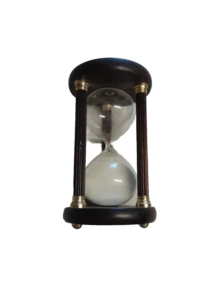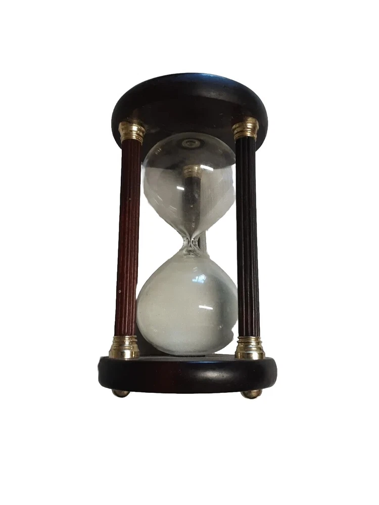 This 9" hour glass features a wooden frame with glass bulbs to display the sand. It's perfect for timing various tasks in the kitchen or elsewhere. The material used in its construction includes both wood and glass, giving it a sturdy and attractive appearance. This collectible item would be a great addition to any collection and is sure to impress guests. See Photos thank you