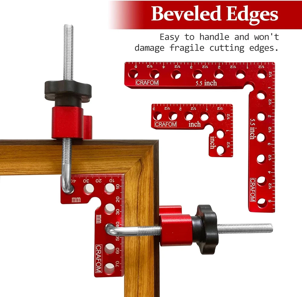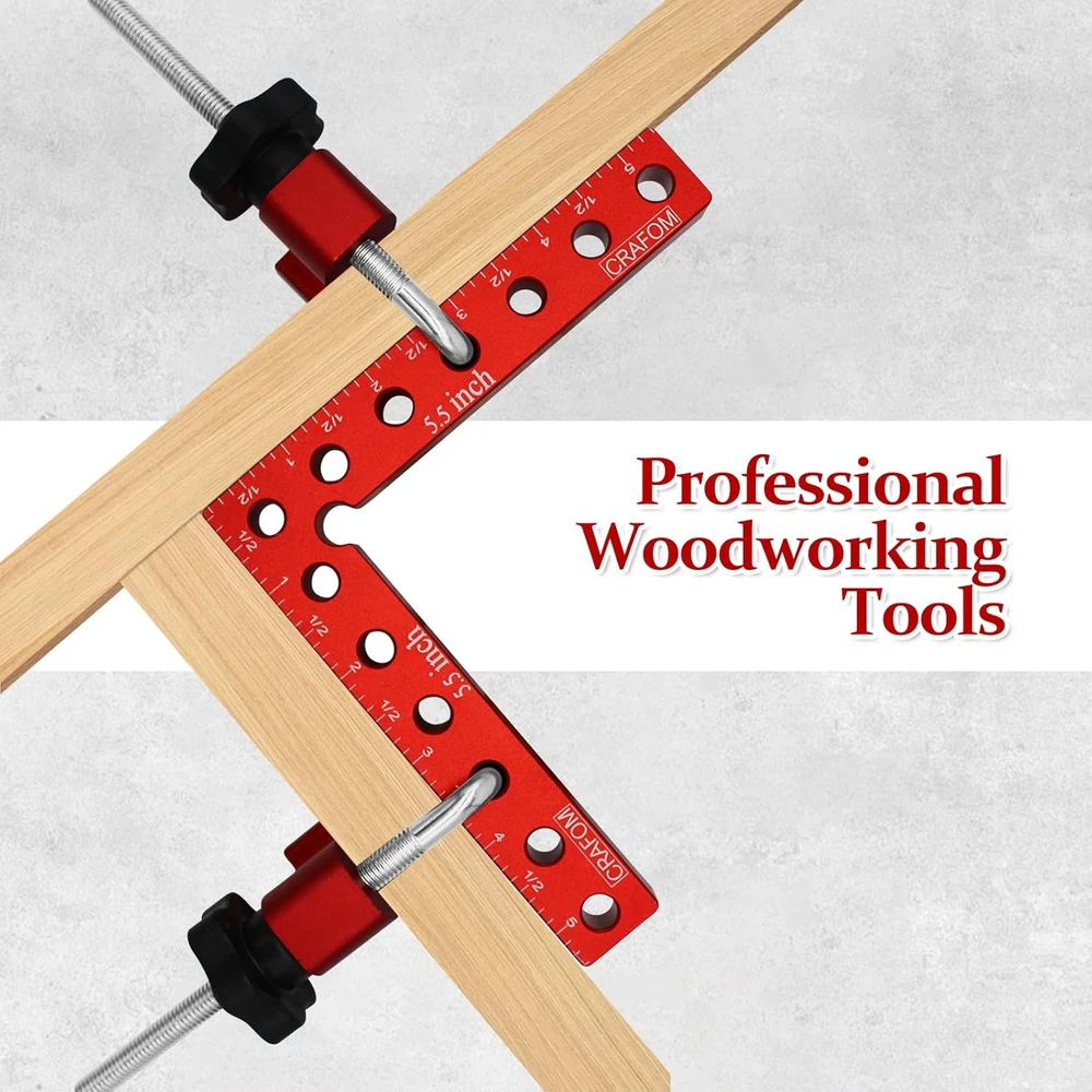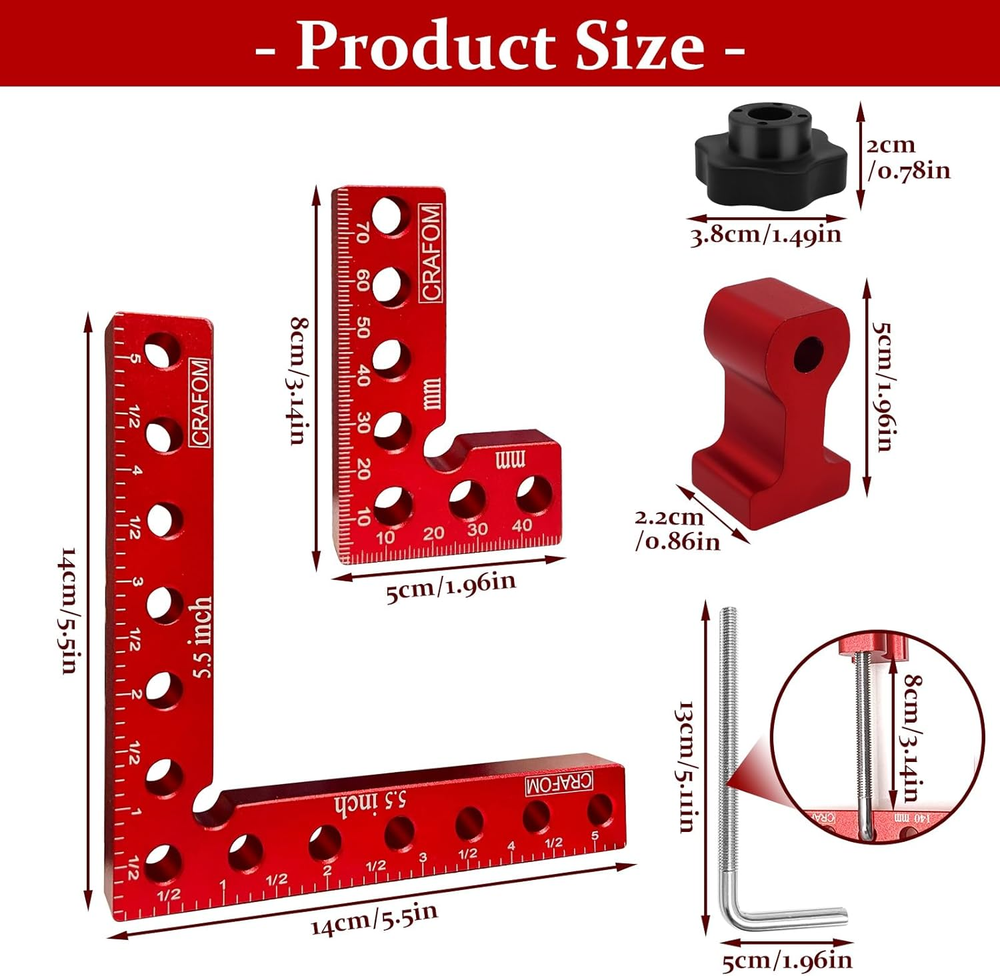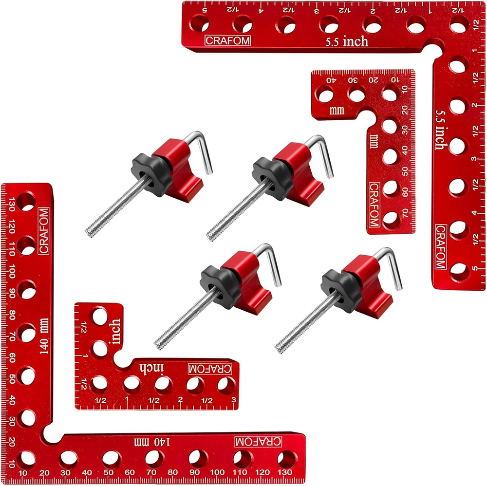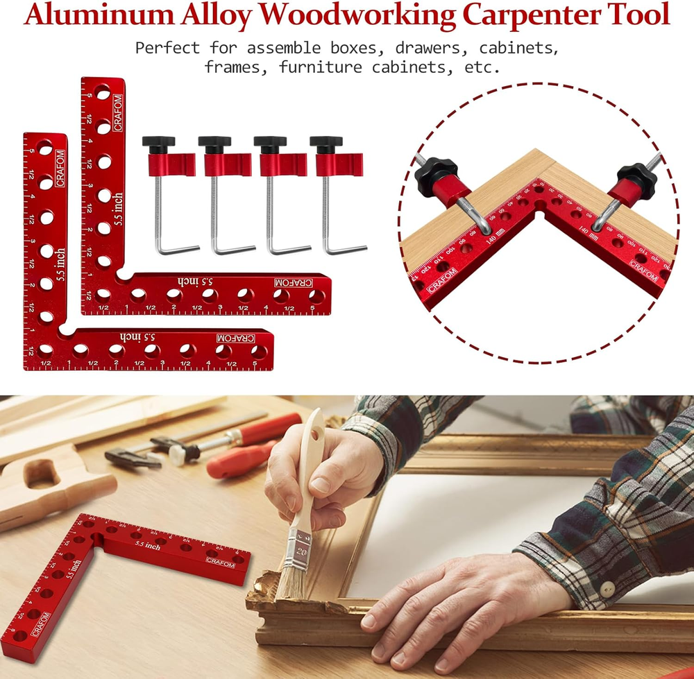 90 Degree Corner Clamping Squares 4 Set 3" 5.5" Wood Working Tools Aluminum Box High Quality : Crafom 90 Degree Corner Clamping Squares is made of high-quality aluminum alloy material, Anodized red surface, resistant to corrosion, wood working tools durable and long service life Multiple uses : For woodworking, right-angle clamps are used to create and fix wooden corners perfectly. Aluminum corner clamps help in framing, making cabinets, and installing furniture, especially making sure to install them at a 90-degree angle Two Different Sizes: Corner Clamps Including 3-inch and 5.5-inch sizes, Excellent for wood working of various sizes and different needs Easy to Use: With Crafom 90 Degree Positioning Squares Installing a wooden frame at a 90 degree angle has become easy, It is enough to place the Corner Clamping Squares next to the two pieces to be combined, then insert the Right Angle Screws into one of the corner clamp holes, then secure it with an M8 plastic nut Great choice as a Gift : 90 degree carpentry clamps will be the best gift for woodworkers or any Handyman, because they have two sizes (3" 5.5") which makes working on small or large frames easy. In addition to their high quality, they come in a colorful paper box package, which gives them beauty and elegance compared to others Product Description 90 Degree Angle Clamps Multifunctional and High Quality Very solid little set of Right Angle clamp that will give you years of use. Clamps for woodworking are suitable for woodwork, and for all works that require clamping at a 90 degree angle. Right angle clamp is available in two different sizes (3'', 5.5'') making it suitable for large and small parts. Corner clamps for woodworking, suitable for cabinet and furniture repair,boxes, as well as picture frames, and other wood projects that need to be clamped at a 90 degree angle. Complete your woodworking toolkit with our wood working clamps sets, providing you with a versatile and comprehensive solution for all your clamping needs. Achieve flawless 90 degree angles with our 90 degree positioning squares. Perfectly align and secure your woodworking projects with our CRAFOM 90 Degree Corner Clamping Squares, ensuring precise and professional results every time. Increase your productivity and efficiency with our woodworking clamps, allowing you to work faster and with greater accuracy. Item model number 4P-CR0123EC Style 2PCS 5.5'' + 2PCS 3'' Color Red Material Aluminum Country of Origin China Batteries Required? No Item Weight 1.17 Kilograms Package Dimensions 7.6 x 6.93 x 2.44 inches Included Components 2 pcs 90 Degree Positioning Squares ( 80mm x 50mm), 4 pcs Adjustable Fixed Blocks, 4 pcs M8 Plastic Nut, 4 pcs Right Angle Screws, 2 pcs 90 Degree Positioning Squares (140mm x 140mm) Complimentary Shipping and Easy Returns Need to return something? Enjoy our 30-day hassle-free return policy! Take advantage of free shipping across all 48 contiguous states! Your order will be dispatched within 1-2 business days once payment is confirmed. Your Opinion Matters! Your happiness is our main goal! We welcome your feedback! If you encounter any problems, reach out to us right away, and we’ll be here to help. Explore the Extraordinary! Our collection showcases fascinating products that are sure to capture your attention. What surprises await you? Delve in and discover unique items that enrich your daily life. Don't miss the amazing things we have in store for you!