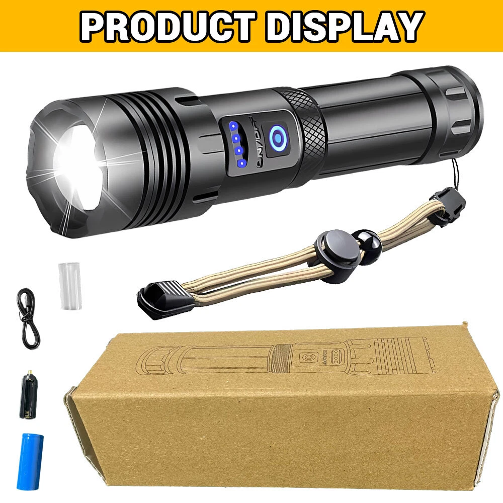 Feature: High Brightness & Long Distance Lighting: This white LED spotlight for long distance lighting is far different from ordinary torches, because it's much brighter than them with luminance of up to 1000000 Lumens, and its lighting range can reach about 3000 Meters, while others only have about 500 meters. 7 Gears: There are 7 work modes for you to switch freely, meeting your different requirements of lighting. COB Side Light: Double light source from different directions make the outdoor environment brighter and safer. More importantly, the COB side light can work as a red warning light. IPX5 Waterproof: Waterproof level up to IPX5 plus the flashlight body made of quality splash-proof aluminum alloy ensure that it can be used in rains, suitable for outdoors. Specification: Type: LED Flashlight Material: aluminum alloy Battery Life (Bright light): 4-8 hours Charging Method: Type-C Waterproof Grade: IPX5 Size: 17*4.3*3.5cm Gears: 7 gears (strong light, medium light, flash light, cob strong light, cob weak light, cob red light, cob red flash light, double click the button to turn on cob light) Fixed Focus: telescopic ZOOM Conversion Method: button Package Include: 1 x LED Flashlight 1 x Type-C Cable 1 x Built-in Battery