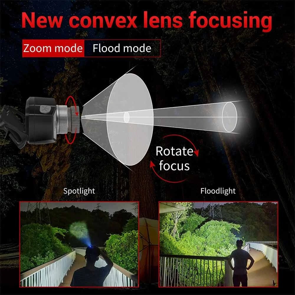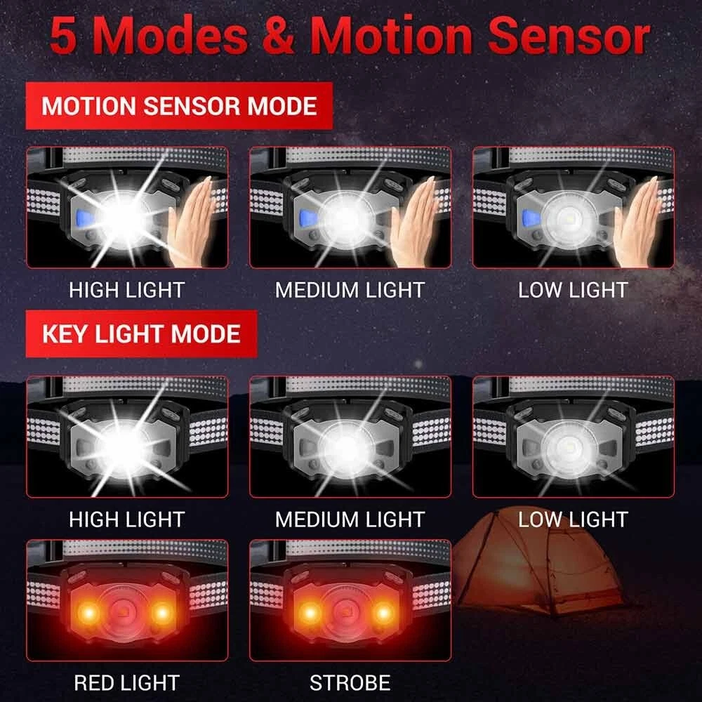 Feature: 1. 5 Light Modes: High Light--Mid Light--Low Light--Red Light--Strobe 2. Smart Wave Sensor: Just waving your hand in front of the headlamp to control it on or off ! 3. Built in 800mah battery, 4-400 hours long battery life 4. Telescopic zoom, micro usb rechargeable 5. Applicable scenes: hiking, cycling, camping, exploration, rock climbing, hunting, fishing, construction, maintenance, home, etc Specification: Product name: B33-1 focusing headlamp Material: PC+aluminum alloy Power specification: built-in polymer battery Battery capacity (MA): 800MAH Rated voltage (V): 3.7 V Static power consumption (UA): 2 Charging interface: MICRO USB Charging indicator: red when charging, green when fully charged Charging time: 3H Discharge time: strong light 4H medium light 5.5H weak light 15H red light normally bright 120H red light flickering 400H Intelligent wave sensing: wave the control switch 10CM from the lamp head Radiation distance: 72M Lens: frog eye convex lens (focus display dot) Focusing: 360 degree rotating focusing (astigmatism focus) Lamp body adjustment: adjust the irradiation direction up and down at 45 degrees Waterproof grade: IPX5 Anti falling height: 1m Applicable population: 15+ Product weight: 69g Package List: 1X Headlamp 1X USB Cable 1X Box