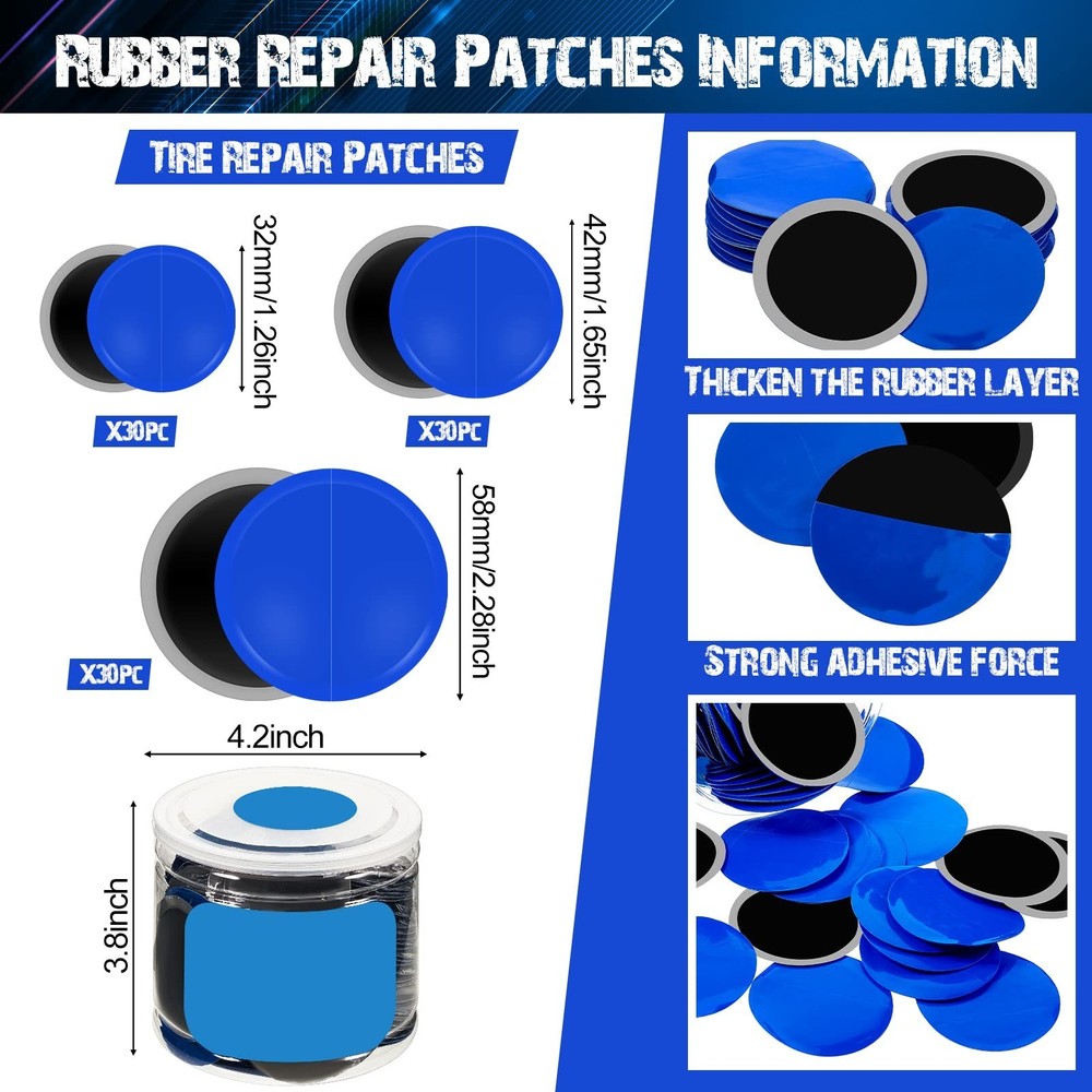 Tallew 90 Pcs Tire Patches Kit 32 mm 42 mm 58 mm Tire Repair Unit with Roller and Liner Scraper, Tube Patch Auto Repair Stitcher Tools for Car Truck Bike Motorcycle Wheel Product Details Manufacturer: Tallew Brand: Tallew Item Weight: 1.21 pounds Package Dimensions: 6.26 x 5.47 x 5.39 inches Item model number: Tallew-DEHUF45640 Manufacturer Part Number: Tallew-DEHUF45640 Date First Available: July 8, 2022 Complete Tire Repair Set: the tire patch kit includes 90 pieces of tire repair patches in 3 sizes, 30 pieces for each size, 1 piece of tire patch roller and 1 piece of liner scraper, a nice combination to help you quickly and effectively repair the puncture of the tire 3 Sizes to Choose: the tire patching kit is designed in round shape, comes in 3 sizes, namely about 32 mm/ 1.26 inches, 42 mm/ 1.65 inches, 58 mm/ 2.28 inches, for you to choose according to actual needs Rubber Material: these tire patches are made of quality rubber material, with nice sealing performance and wear resistance, elastic and reliable, not easy to tear or leak, can be kept and applied for a long time Easy to Use: you just need to clean the dirt on the car tire, and polish the worn area, and then apply glue, paste tire patches tools, and apply sealant finally; Note: the glue and sealant are not included in the package Helpful Assistants: the tire patch roller is made of quality iron material, sturdy and sustained, can help you apply even penetration pressure to remove trapped air; The liner scraper is helpful for scraping coverings