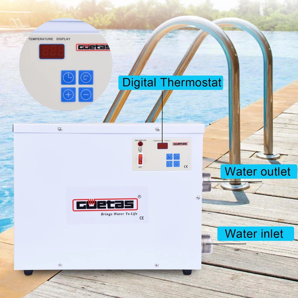 Suitable For: Hot Tubs, Pools Power: 9000 W/11000 W/18000 W Brand: AUTOSU Item Width: 12.0 cm Water Temperature Range: 131℉ Type: Pool Heater Thermostat Item Length: 57.0 cm Voltage: 220 V Power Source: Electric Features: Auto Shut-off, Digital Display Country/Region of Manufacture: Unknown Item Weight: 8 kg Water Connection Location: Side Item Height: 38.0 cm