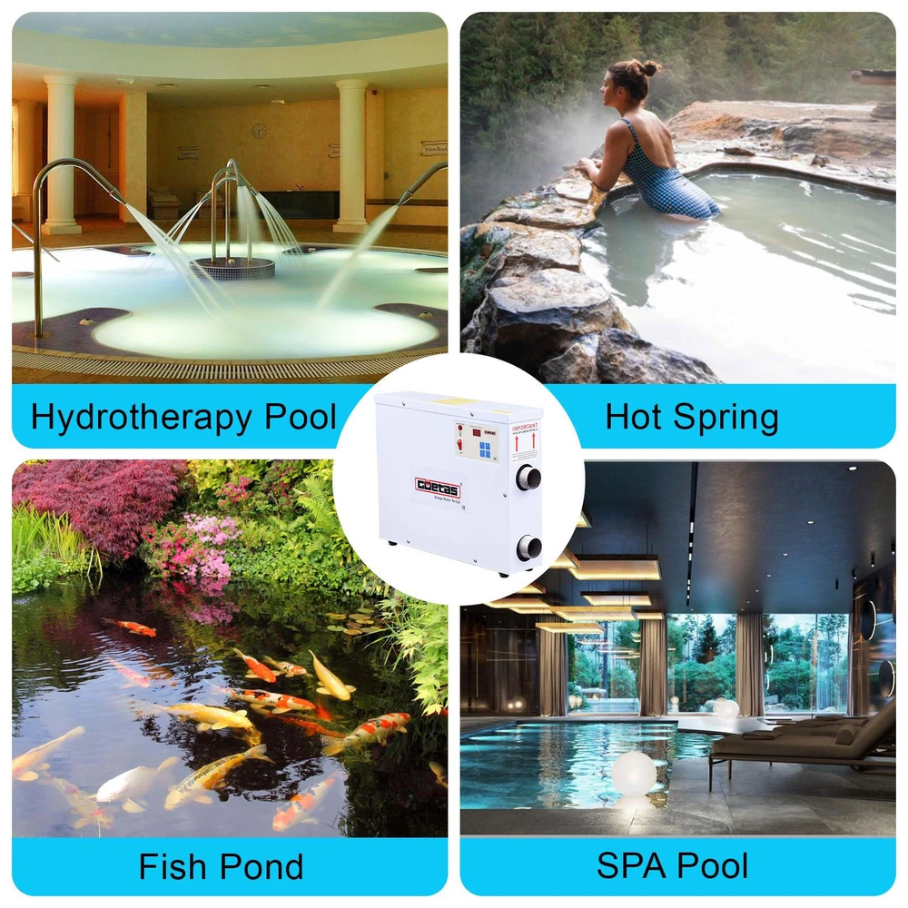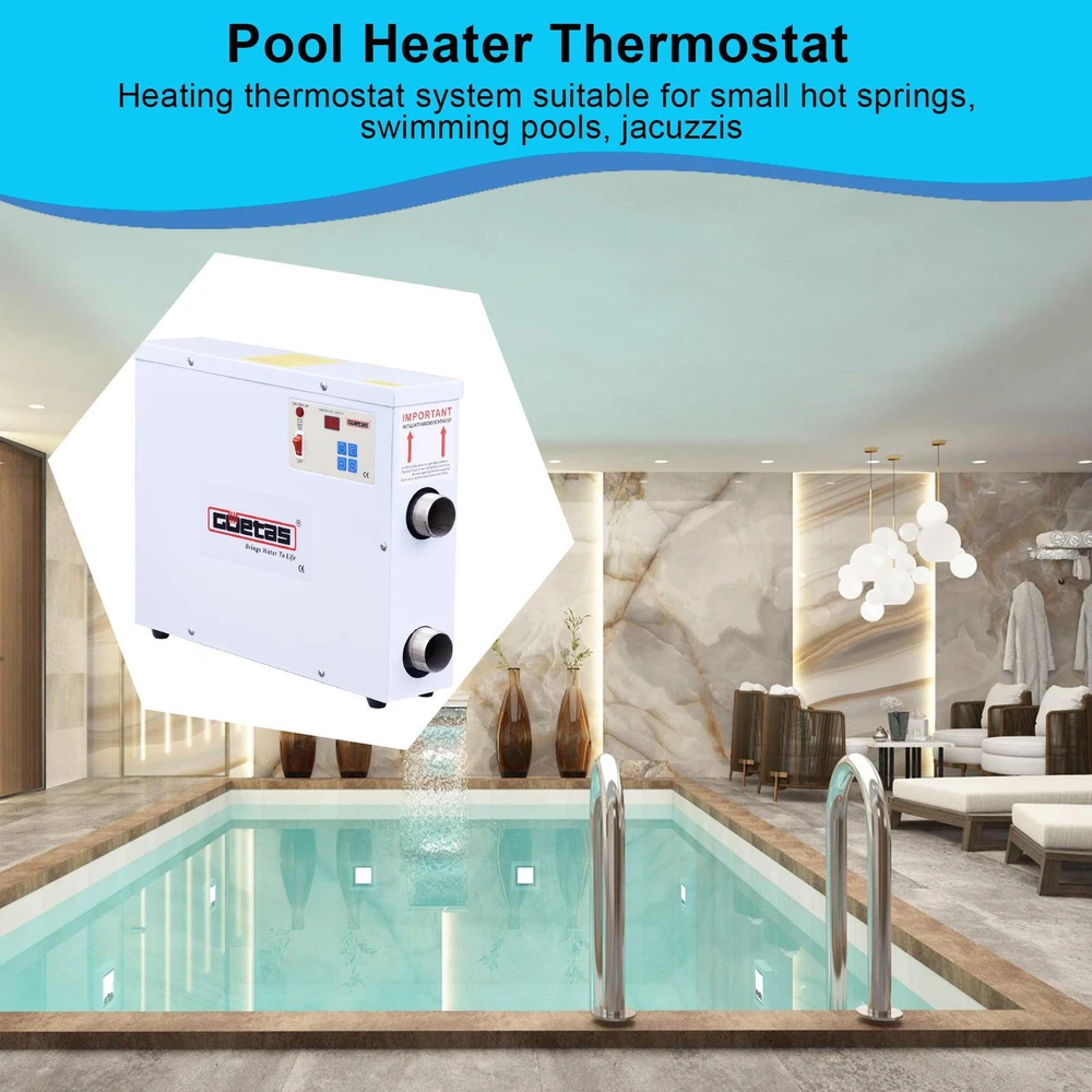 Power Source: Electric Item Length: 57.0 cm Suitable For: Hot Tubs, Pools Item Height: 38.0 cm Features: Auto Shut-off, Digital Display Country/Region of Manufacture: Unknown Item Width: 12.0 cm Type: Pool Heater Thermostat Item Weight: 8 kg Power: 9000 W/11000 W/18000 W Water Connection Location: Side Voltage: 220 V Brand: CUIE Water Temperature Range: 131℉