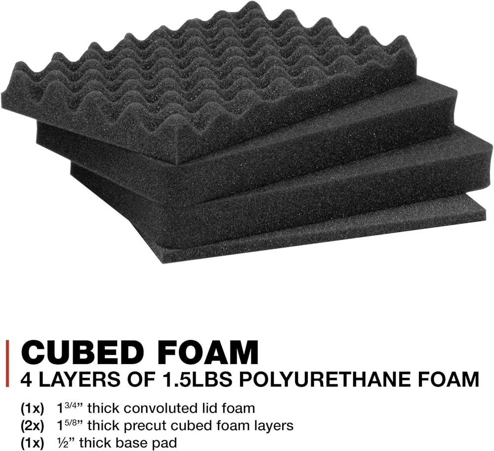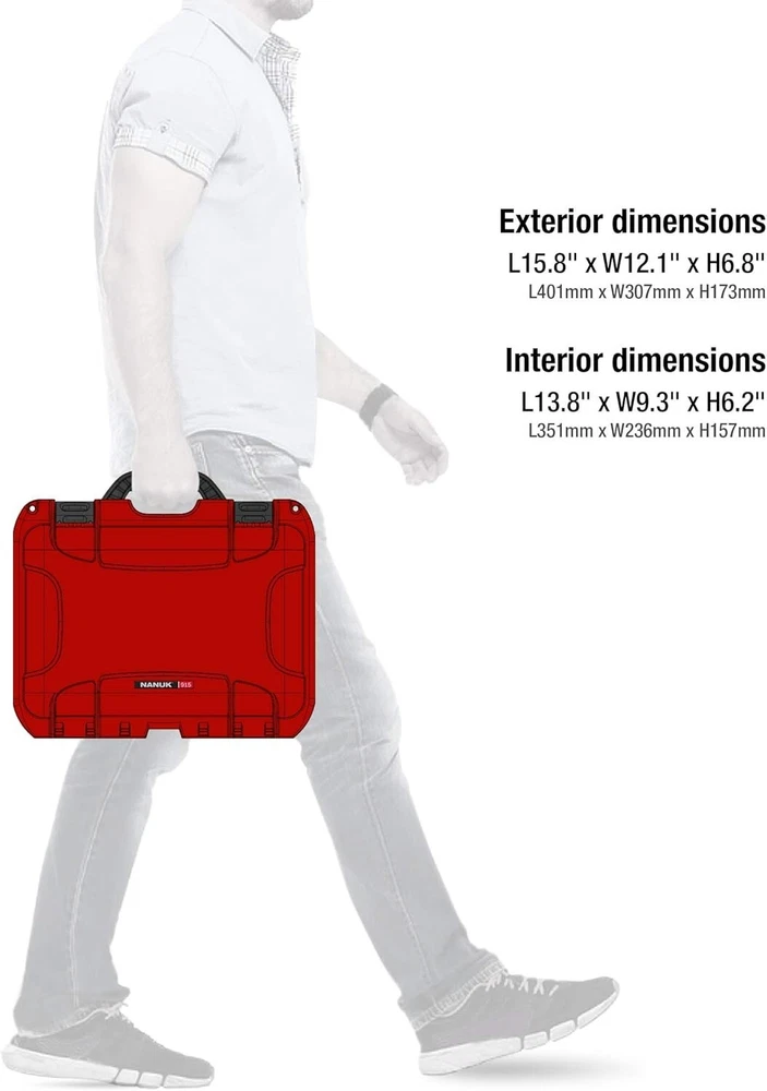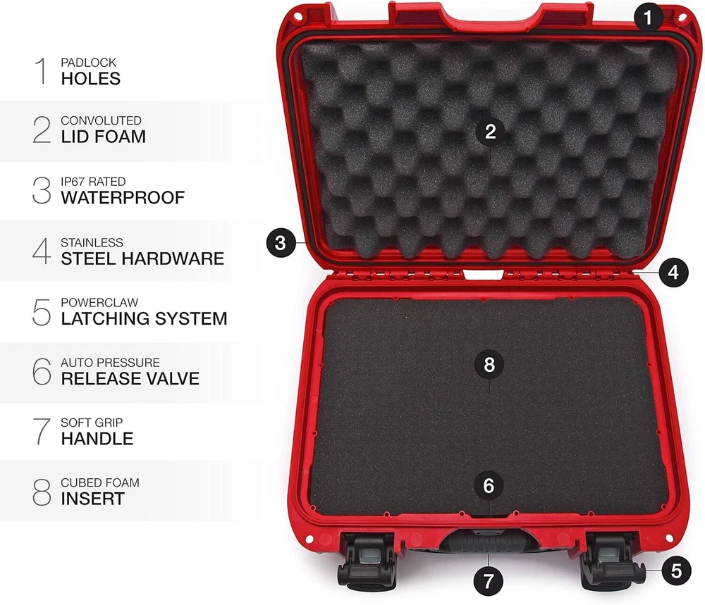 915 Waterproof Hard Case with Foam Insert - Red 915-1009 "interior dimensions " x " x ". exterior dimensions " x " x ". includes 2 layer cubed foam insert with base pad and lid foam" waterproof (ip67 rated), dustproof, shockproof. automatic purge valve equalizes pressure on the inside of the case when travelling nk-7 resin is incredibly impact resistant. cases are designed to survive the toughest journey two powerclaw (patented) triple action latches molded in super-tough nylon keep the case securely closed using compressive force made in canada. SATISFACTION GUARANTEE on the case. 1 satisfaction against manufacturing defects on the foam inserts cases are designed to protect the most sensitive equipment in the harshest environments. Whether battling the scorching heat of the Sahara desert or the bone chilling cold of the arctic, every detail of has been refined and perfected to offer the utmost in protection and performance. From our high-impact NK-7 resin to our PowerClaw latches, has been engineered and manufactured to stringent military specifications to surpass the needs of the most demanding users. These virtually indestructible, lightweight, watertight cases offer the ultimate grade of protection in a variety of sizes, configurations and colors. Complimented by a large selection of optional accessories and an incredible degree of customizability, is the best choice to move your equipment in complete security. Whether transporting valuable equipment around the world or simply protecting sensitive tools in the urban jungle, is up to the challenge. comes loaded with innovative features. Countless hours of research and development went into defining the requirements for . The result is a line of cases that are equipped to meet today’s challenges. Responding to feedback from professionals in various fields, is the evolution of traditional protective cases. has also been designed to adapt as your needs change. Many features that are optional on other cases are standard on . By integrating attachment features into the case at the design stage, you can easily add a shoulder strap or a panel kit without modifying the case with holes or additional hardware. The attachment features are already there when you need them. Waterproof. Lightweight impact resistant NK-7 resin. SATISFACTION GUARANTEE. PowerClaw latching system. Soft grip foldable handle with handle stay. Integrated lid stay. 100% stainless steel hardware. Pad lockable. Integrated bezel system. Stackable.