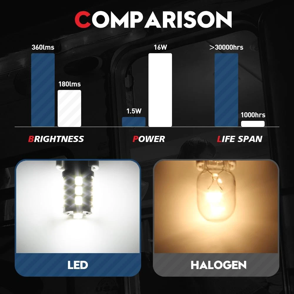Store New Arrivals Add to Favorite View Feedback Contact 921 LED Bulb RV Interior White 912 922 906 194 T10 Wedge Base Dome Light 12V for Camper Trailer Cargo Marine T15 Car Reverse T5 Landscape Outdoor Lamp (10 Pack) Description Light Source Type LED Item Package Quantity 10 Operating Life 30000 Hours Light Source Type LED Color Temperature 6000 Kelvin Color Temperature 6000 Kelvin Package Quantity 10 Color White (6000K) Wattage 1.50 Voltage 12 Volts Auto Part Position Rear, Center Size 10pcs Wattage 150 Fit Type Vehicle Specific Fit Fit Type Vehicle Specific Fit Each T5 T10 T15 wedge base LED light bulb comes with 18 pieces 2835 chips, and features low power consumption 1.5 watts to deliver 6000K white and 360 lumens; specially designed for RV interior light fixture, distributes overall beam without causing any waste of light output; because of polarity sensitive, if LED bulb doesn't light up, please flip plug and try again 921 LED bulb kit contains 10 pieces bulbs, features 12V low voltage for auto interior, exterior and outdoor landscape lighting; this LED light bulb is not same size as traditional 194 or 921 halogen bulb, please make sure the bulb dimension fits your application; if your lighting fixtures are equipped with dimmer switch, these non-dimmable 921 LED bulbs won't work Direct for all T5 T10 wedge exterior landscape lighting or T15 wedge base light bulb for vehicles: W5W W3W W10W 124 147 152 158 159 160 161 168 175 184 192 193 194 c194 195 259 280 285 447 464 501 555 558 579 585 655 656 657 658 1250 1251 1252 2450 2652 2821 2825 2825L 2827 2921 175 3652 W16W T15 579 901 902 904 906 908 909 912 914 915 916 916LL 916NA 917 918 920 921 921K 922 923 926 927 928 939 Commonly used for car, RV camper, travel trailer, motorhome, 5th wheel, marine boat, pontoon, vessel, barge, ship, sail boat, yacht, van, truck, motorcycle; also used for outdoor landscape lighting, such as garden light, patio light, yard light, ground light, deck stair light, pathway light, lawn path light Automotive application: interior indoor ceiling dome light, under cabinet puck light, counter closet light, kitchen ventilator stove range hood light, desk reading light, cab map door courtesy light, backup reverse license plate tag light, cargo trunk light, side marker turn signal blinker, daytime running parking light, DRL, brake light, boat navigation light, glove box light Product Description ABOUT US We offer the best prices around on high quality products. Our E-store includes media such as books, movies, music and games while offering electronics, toys, sporting apparel, clothing, tools, general home, garden items and more. SHIPPING We are always working hard to ensure your package arrives as soon as possible. Please understand that some factors like weather, high postal traffic, and the performance of shipping companies are outside of our control. We offer free shipping to the lower 48 states and ship within 2 business days of payment, usually sooner. We do not accept P.O. Boxes. Please provide a physical address. For shipping outside of the continental USA, we only use eBay's Global Shipping Program.The item is shipped to KY and then sent to the rest of the world. International customers are responsible for all duties and taxes. Continue to check out in order to calculate costs for shipping the item to your country. Messages regarding eBay's Global Shipping Program MUST be directed at eBay EXCLUSIVELY. RETURNS We offer a 30-Day Return Policy on items which you are not completely satisfied with. You have the option for a full-refund or an exchange of the item. No returns are available on items shipped outside of the USA. PAYMENT We accept PayPal. CONTACT US This page content is yet to come Please ad us to your favorite seller and visit again later Thank You CUSTOMER SATISFACTION We try our very best to make sure every customer is completely satisfied. If there's a problem, message us! We're happy to help. WE ACCEPT Copyright © 2021 AutoDS. | All Rights Reserved