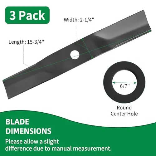 Menu 1. We require immediate payment. 2. We currently accept payment via eBay managed payments only. 3. Once payment is cleared, we will dispatch your shipment within 1-3 business days. Please refer to the "Shipping" tab for more information regarding shipping speed to your destination. 92117E701 Mower Blades Compatible with Murray 46" Cut Deck, 92117E701MA High Lift Lawnmower Blades Compatible with Murray 46901X92A Lawn Tractor, Replace for 92117 92117E7D, 3 Pack Product description 【Replacement Part Number】The high lift lawn mower blade replaces for 92117E701, 92117E701MA, 92117E700, 92117E7D, 92117. 【Compatible Models】The 92117E701 sharp riding mower blade compatibles with Mu rray 46901X92A, 46250x30A, 46254x15B, 46258x6A, 46370x5C for 46" cutting deck. Please check more in product description. 【Extended Durability】Crafted from premium-grade steel, our 92117E701MA riding mower blade is engineered to be exceptionally robust, ensuring an extended lifespan and maintaining its sharpness over time. Designed for both efficient mowing and high-lift functionality, this blade effortlessly keeps your lawn and garden in top shape with minimal effort. 【Easy&Safe to Install】Perfect fit, easy install. You can loosen and unthread the blade bolt to remove the old blade, and if you install the new blade, you can put the blade, blade support, and blade bolt back in position. The mower blade‘s sharp side should face the ground. 【Package Include】3x high lift blades. The mower blade dimension: Length: 15 3/4", Width: 2 1/4", Thickness: 1/7", Round Center Hole: 6/7", For Deck Size: 46". PLEASE MESSAGE US IF YOU HAVE ANY OTHER QUESTIONS, AND MANY THANKS FOR READING ALL OF THIS. Copyright ©#. All Rights Reserved.