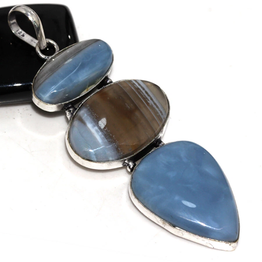 925 Silver Plated Owhyee Blue Opal Ethnic Long Pendant Jewelry Size 3.1" JW