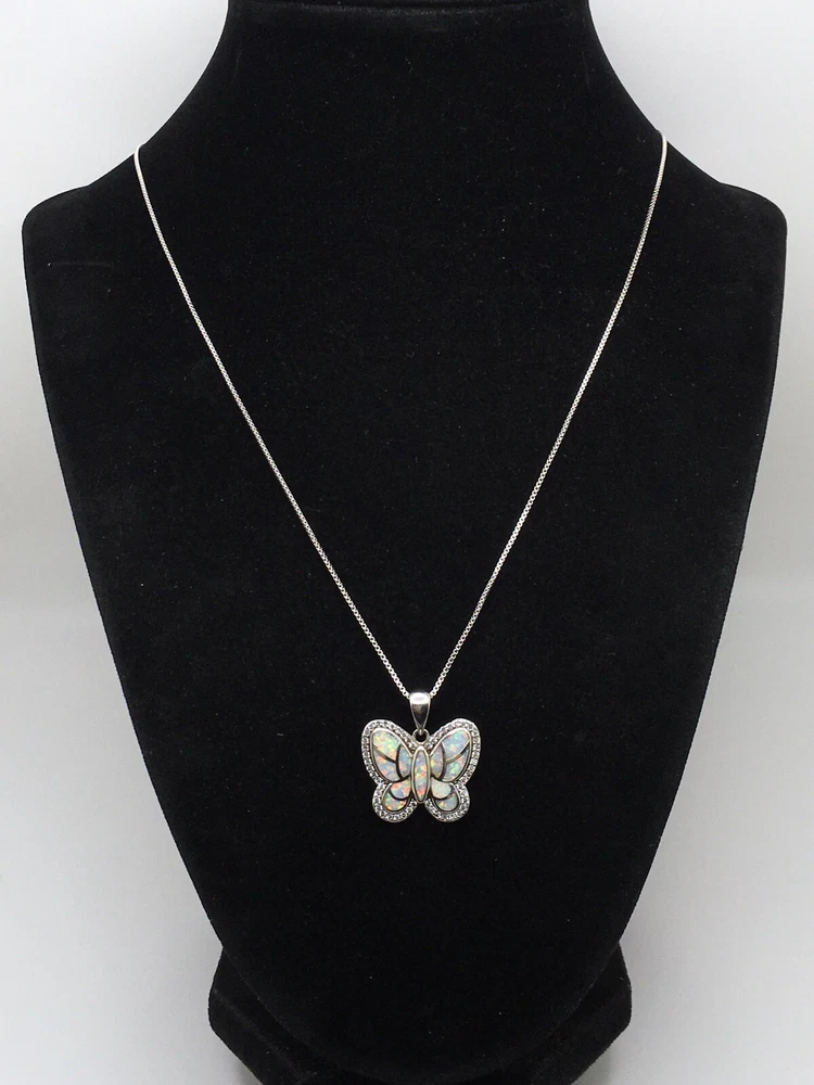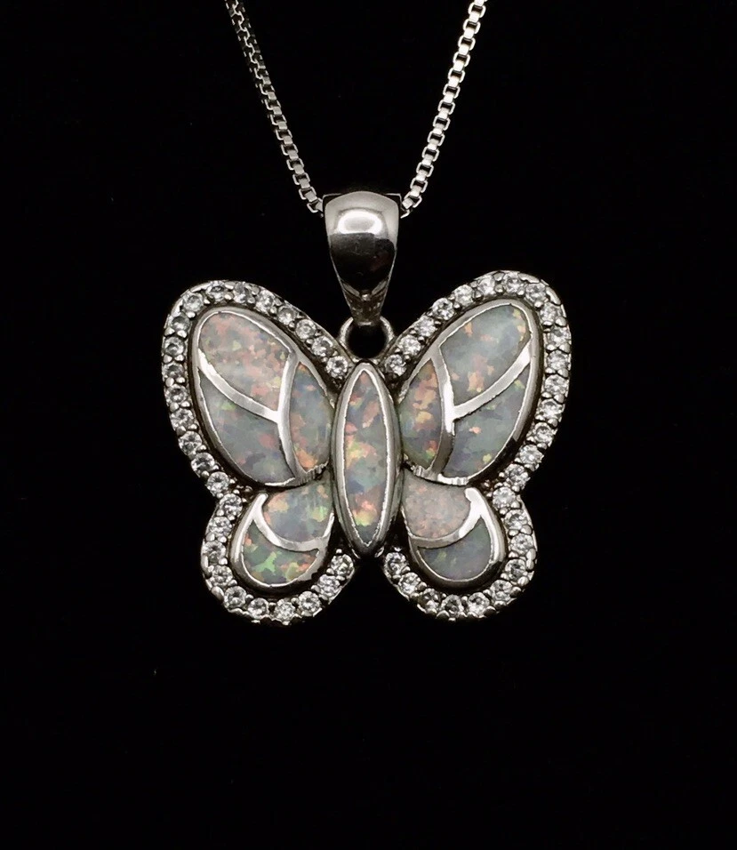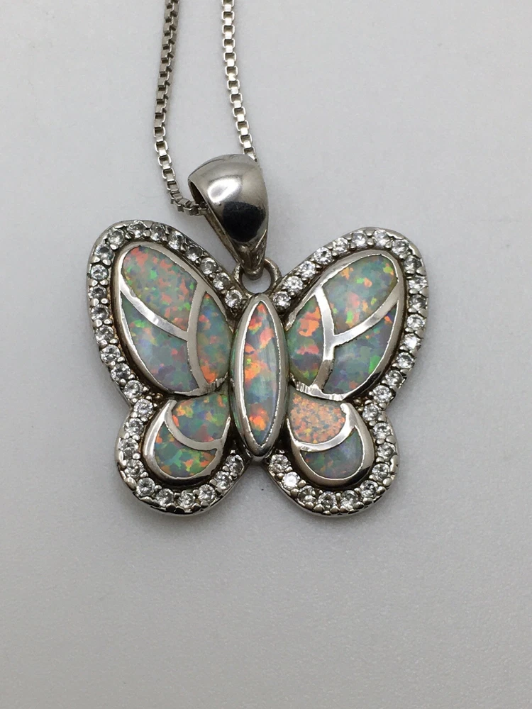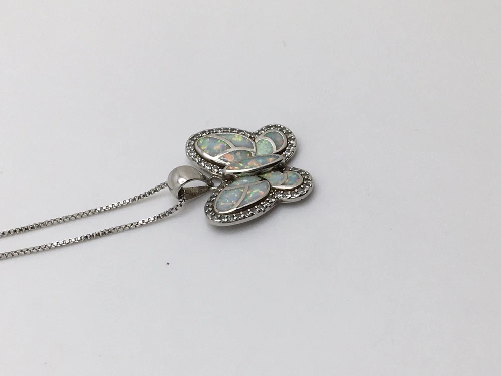 925 Sterling Silver 1” White Fire Opal Butterfly Pendant Necklace 18" #1810 Unknown origin of stones. Could be lab created. Hand polished. Previously owned. Measuring Tools & display not included. Combined Shipping! 1st item $4.59, each additional item is $1. Max shipping cost $10. Combine shipping for up to 7 days! We value YOU! Items are returnable and fully refundable! SilverSchark began as a hobby that grew into a business. We take old retired sterling silver jewelry and revitalize it to wearable condition. Utilizing an ultrasonic machine with sterling silver solution most items are restored to their original beauty. Occasionally scratches are buffed out and some minor repairs are made to bring these tired pieces back to life. Diamonds are always tested. If a piece is not stamped or is suspected of not being sterling silver, the item is acid tested for confirmation. Tests will always be listed in the description. We understand that patina is desired on vintage or antique items so some of the listings will not be cleaned and polished. The description of each listing will tell its tale of restoration. Combined shipping is always welcome! Just ask for an invoice if your cart doesn't look correct. Max shipping cost is $10 per shipment regardless of number of items!