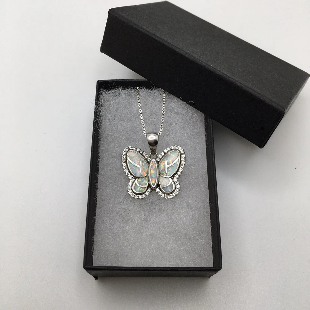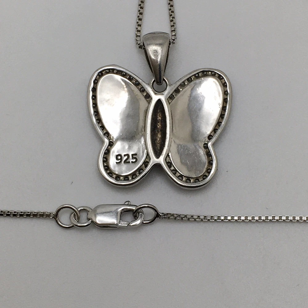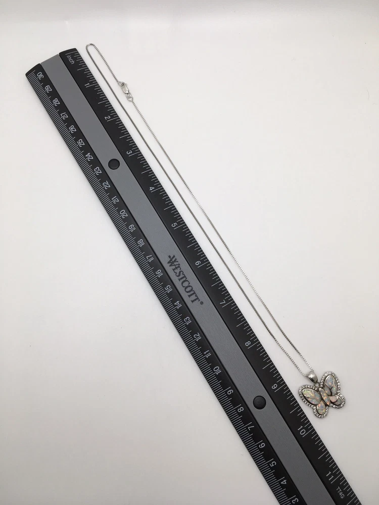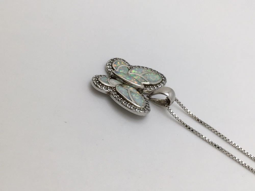 925 Sterling Silver 1” White Fire Opal Butterfly Pendant Necklace 18" #1810 Unknown origin of stones. Could be lab created. Hand polished. Previously owned. Measuring Tools & display not included. Combined Shipping! 1st item $4.59, each additional item is $1. Max shipping cost $10. Combine shipping for up to 7 days! We value YOU! Items are returnable and fully refundable! SilverSchark began as a hobby that grew into a business. We take old retired sterling silver jewelry and revitalize it to wearable condition. Utilizing an ultrasonic machine with sterling silver solution most items are restored to their original beauty. Occasionally scratches are buffed out and some minor repairs are made to bring these tired pieces back to life. Diamonds are always tested. If a piece is not stamped or is suspected of not being sterling silver, the item is acid tested for confirmation. Tests will always be listed in the description. We understand that patina is desired on vintage or antique items so some of the listings will not be cleaned and polished. The description of each listing will tell its tale of restoration. Combined shipping is always welcome! Just ask for an invoice if your cart doesn't look correct. Max shipping cost is $10 per shipment regardless of number of items!