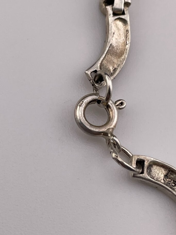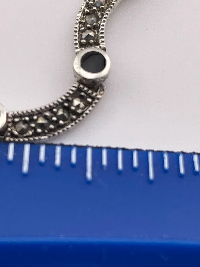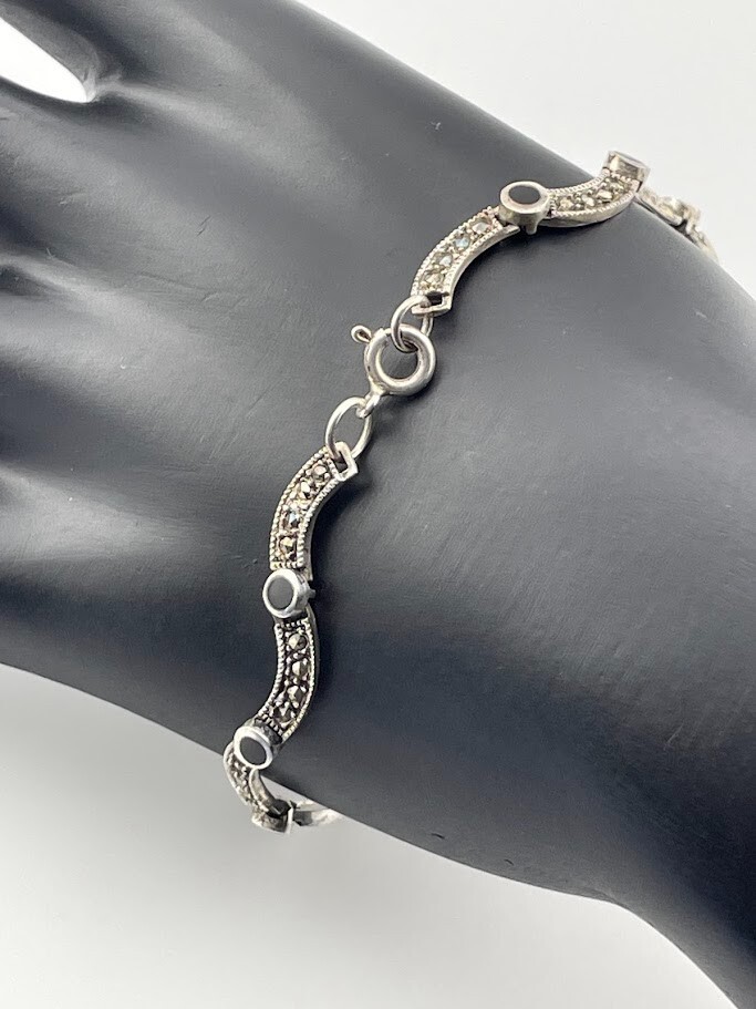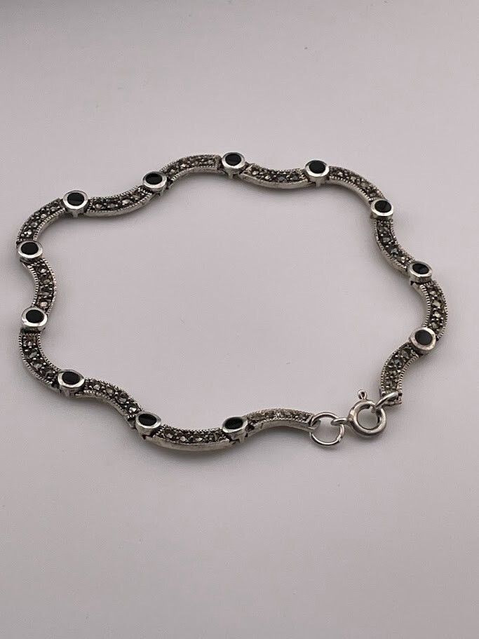 925 STERLING SILVER MARCASITE BLACK ONYX WAVY BRACELET 7.5" DECO STYLE 2542 ****************************** Thank you for your interest in our jewelry. We?d like to introduce ourselves. We are just a retired couple who love matching our customers with great jewelry. We?re not professional jewelers. To have the best shopping experience we like to recommend the following: Please measure your hand, wrist, finger or neck to ensure the best fit. We can use your measurements to help with sizing. Please ask all the questions you want. We know some stuff and, if we don?t, we?ll do the research. We like to learn too. More Stuff: If an item is described as ?gold over 925 sterling silver? this means it is gold vermeil. Vermeil is the process by which a layer of gold (usually 14k or 18k) is bonded to sterling silver. We only clean with gentle soap and warm water to avoid damage. The items we sell may be new or pre-owned and may have normal wear, slight damage, and/or tarnish. We make every effort to ensure the items we sell are as described. This includes testing to confirm metal purity if the item isn?t marked, and testing for gemstone identity. We try to put measurements in the jewelry description and include a photo of each piece with a U.S. quarter (25mm).