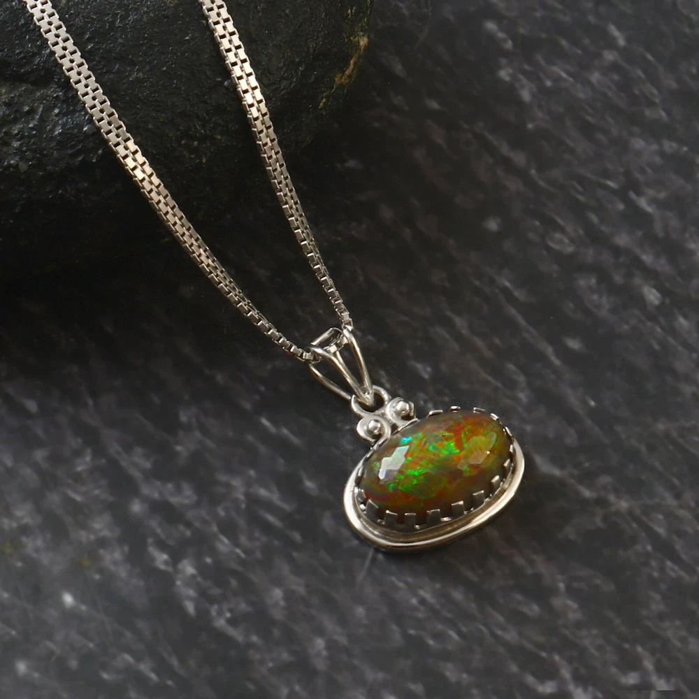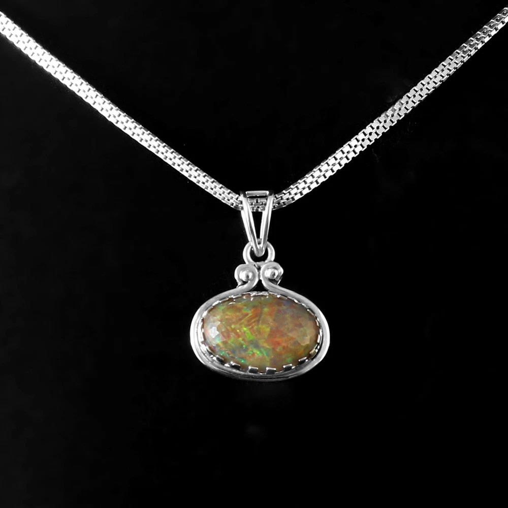 Necklace Length: 18 in Country of Origin: India Vintage: Yes Type: Necklace Theme: Nature Style: Pendant Size: 5-10 mm Main Stone Creation: Natural Setting Style: Bezel Closure: Lobster Occasion: Anniversary, Birthday, Christening, Christmas, Engagement Material: Gemstone Brand: Sterling Features: Adjustable Pendant/Locket Type: Tassel Base Metal: Silver Main Stone Treatment: Not Enhanced Secondary Stone: Opal Wholesale: Yes Number of Gemstones: 1 Country/Region of Manufacture: Ethiopia Pendant Shape: Oval Main Stone Shape: Oval Signed: Yes Metal Purity: 925 Cut Grade: Excellent Main Stone Color: Fire Gemstone Clarity Grade: Heavily Included weight: 38 cts Metal: Silver Color: White Chain Type: Ball/Bead Handmade: Yes Main Stone: Opal