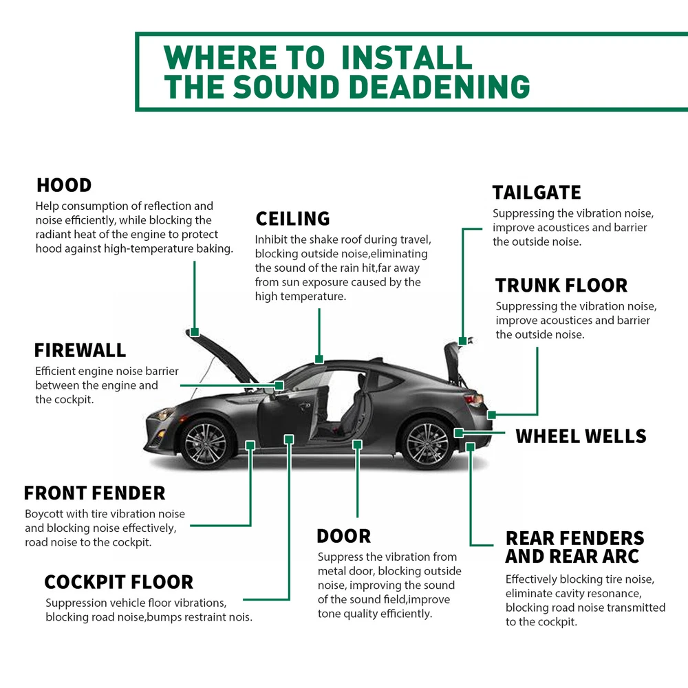 Specifications: Condition: 100% brand new Features: Car heat / sound insulation Placement on Vehicle: Front/Rear/Left/Right Reinforced / Crush Resistant: Yes Mildew & Mold Resistant: Yes Water resistant: Yes Non-toxic: Yes Material: Aluminum & Foam & Adhesive Backing Size:1m*2.4m=39INCH*94INCH=26sq.ft Thickness: 5mm=197mil=1/4INCH Feature: Yetkole Best choice of motor parts 94"X39" Sound Deadener Car Insulation Heat Shield Dampening Self-Adhesive Mat Specifications: Condition: 100% brand new Features: Car heat / sound insulation Placement on Vehicle: Front/Rear/Left/Right Reinforced / Crush Resistant: Yes Mildew & Mold Resistant: Yes Water resistant: Yes Non-toxic: Yes Material: Aluminum & Foam & Adhesive Backing Size:1m*2.4m=39INCH*94INCH=26sq.ft Thickness: 5mm=197mil=1/4INCH Feature: 1. Durable housing for harsh environments 2. Easy to cut and fit, with strong adhesion 3. Due to its excellent load resistance, it is very suitable for underfloor applications 4. High temperature resistance, high noise reduction and insulation performance, non combustible and flame retardant 5. Easy to install, suitable for various car models, simply trim piece s to fit, peel and place and hand roll to ensure good adhesion. No messy spray paint or adhesive is required to install this product. 6. Can be used for the entire interior of any vehicle including: floor panel, door, carpet under/seat, headliner/roof, trunk, trunk lid, firewall (internal side). 7. By reducing or suppressing the sound vibration of the metal plate, you can eliminate road noise. 8. This car insulation is used in many applications, such as muscle cars, hot rods, light cruisers, imports, tuners, street rods, mouse rods, classic cars, racing cars, stock cars, old antique cars, pickups, trucks, low rider and many more. We even have customers using it on their SUVs, vans, RVs, luxury cars, campers, yachts, RVs and school buses. Features & Details: 【Reduce road noise】If you often drive on uneven roads or on noisy highways, sound insulation can bring you more comfort. It will reduce the noise of roads and other drivers. It will make your driving smoother and have the added benefit of better media listening 【Enhance the music】Use sound insulation to make your radio clearer. You will no longer have to turn it up because of traffic noise. Not only is it good for music, but audio books and telephones will sound better, too 【Improve privacy】If you don't want other people on the road to hear what you're listening to, the sound insulation prevents the noise from escaping. Sound insulation will help you 【Warm in winter and cool in summer】The car insulation will help reduce your interior temperature in the summer, and in winter, the heat insulation can keep you warm in the car, which is conducive to warmth reduce engine/tunnel/console 【Protect car paint】In summer, the temperature is too high, the engine runs at high speed and accelerates for a long time, and generates heat, which can easily cause the aging and fading of the car paint; the heat insulation pad can protect it 【Increase the life of the car】In summer, due to high temperature and long-term driving, it is easy to cause the cabin to heat up and cause a fire, which may seriously damage your car. Using heat insulation pads can extend the life of the car Installation: 1. Please clean the surface you want to paste. 2. Make insulation materials and sheet metal firm fit, and play best adhesive, damping performance. 3. It is best not to repeatedly tear and paste during the successful installation process, otherwise the paste effect will be destroyed. Package included: 1x Heat Sound Deadener Insulation Mat 1x Rollers 4x Installation Tools (Please allow 1-3cm difference due to manual measurement.) Important Note: Please allow slight dimension difference due to different manual measurement. Due to the light and screen setting difference, the item's color may be slightly different from the pictures. If you have any questions about quality, shipping or other problems, please contact me first via eBay message. I will give you a satisfy solution. Note:Some sizes might be folded for delivery due to dimension limit. Item Specifics Brand Modigt Type Carpet Mat, Heat Sound Deadener Insulation Material Aluminum & Foam & Adhesive Placement on Vehicle Cargo/Trunk/Bonnet/Dashboard/Under Seat/Doors Color Silver Features Easy to install, waterproof, fireproof, mildew proof Universal Fitment Yes Manufacturer Warranty 2 Years Function Noise Reduction, Easy to Cut, Self-Adhesive Function 1 Protects Paint from Blistering Function 2 Reduce the road/ Engine/ Wind noise Function 3 Dustproof, Waterproof, Anti-moisture Application1 Turbo,Front Fender,Rear Fender Application2 Hood,Firewall,Doors,Floor,Roof Application3 Trunk Lid,Trunk Room,Engines,Tailgate Application4 Ceiling,underneath bonnets,Underfelt Application5 Classic Car,Race Car,Stock Car,Old Vintage Car,Pickup,SUV,Caravan Application6 Cockpit Floor, Tailgate, Firewall U Type Wall Application7 For Use in The Application Of Any Sound Application8 Car& Home Interior Heat Sound Deadener Application9 Car& Home Interior Heat Sound Deadener Insulation Thickness 5mm=197mil =1/4INCH NOTE with free rollers Manufacturer Part Number Car Heat / Sound Insulaiton Deadener Superseded Part Number Heat Sound Deadener Insulation Mat Interchange Part Number Deadening Material Insulation Cars & Truck Fitment Type Direct Replacement Finish Matte Size 1m*2.4m=39INCH*95INCH=26sq.ft Payment 1. It will be much appreciated that you finish your payment asap or it will make UPI (unpaid item case) on your account leading to be suspended or restricted by eBay when those UPI cases carry over to certain amount. 2. Any problems please contact us for more details. Shipping 1. All items will be shipped to buyer's ebay address. 2. All items will be shipped within 24-48 working hours upon receipt of payment, and multiple items will be combined shipping. 3. In most cases, delive
