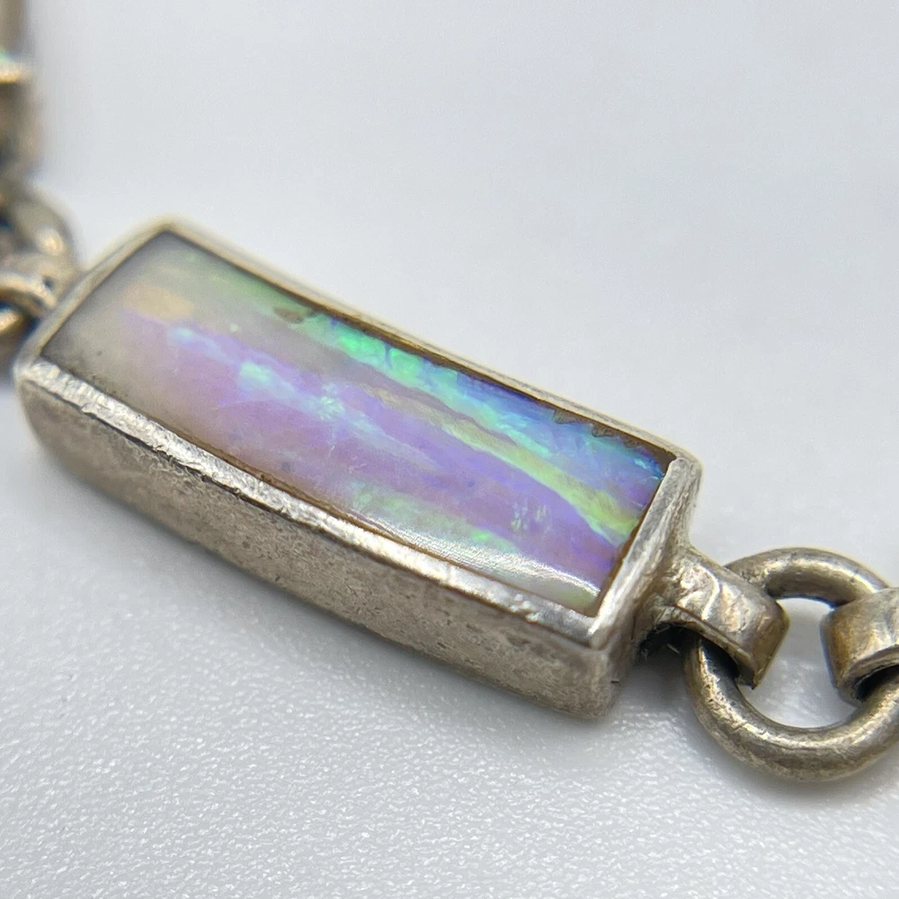 This beautiful bracelet is a unique piece of jewelry that features a stunning white opal stone. The opals are set in 950 sterling silver that has a rectangular shape and a round link chain type. The bracelet is 7.5 inches in length and is designed with a vintage style that adds a touch of ethnic beauty to any outfit. The bracelet is made in Mexico and it boasts of nine opals that are carefully crafted to create a masterpiece.